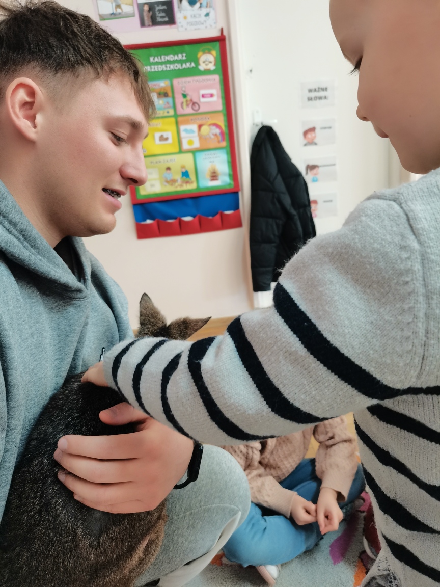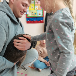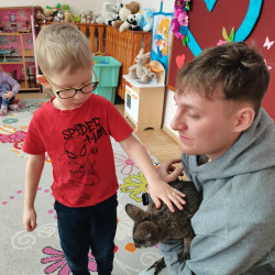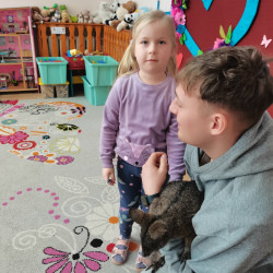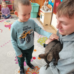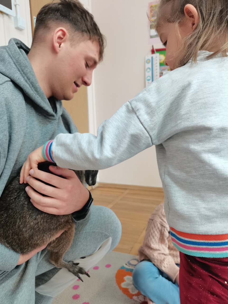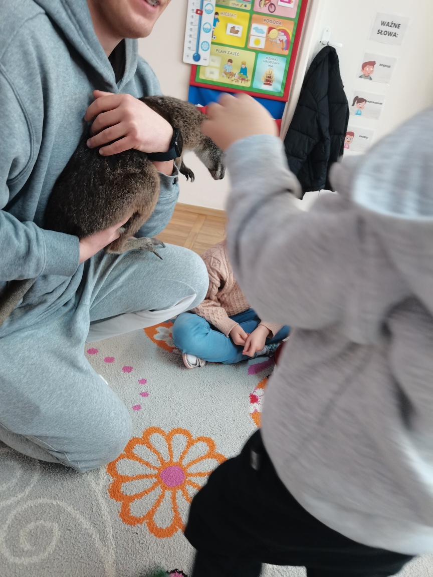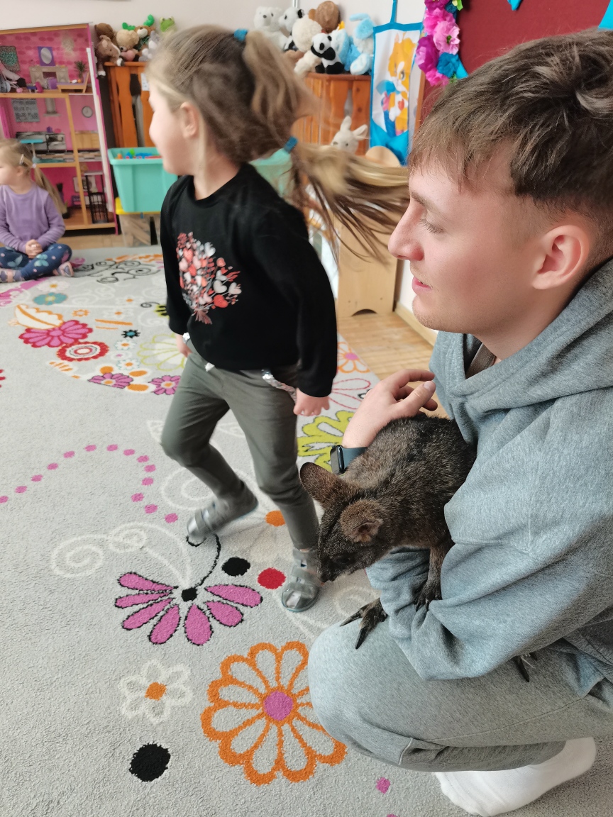 Wizyta żywego miniaturowego torbacza rasy pademelon była dla dzieci fascynującą, żywą lekcją przyrody. Przedszkolaki miały okazję zobaczyć egzotyczne zwierzę z bliska, dowiedzieć się o kraju pochodzenia, o środowisku życia, o jego zwyczajach, zapytać o to czym się żywi, delikatnie pogłaskać i poobserwować jak się porusza. Taki niecodzienny kontakt ze zwierzęciem uczy dzieci empatii, delikatności i szacunku do innych istot. Pomaga również pokonać nieśmiałość i lęk.