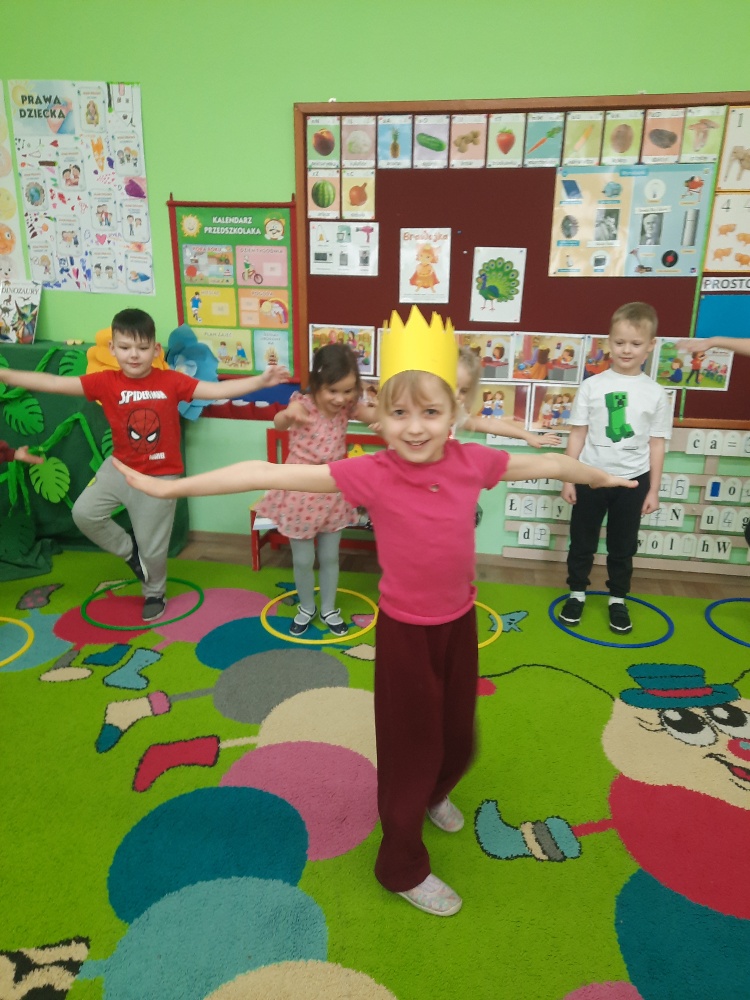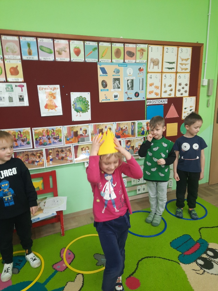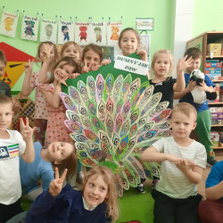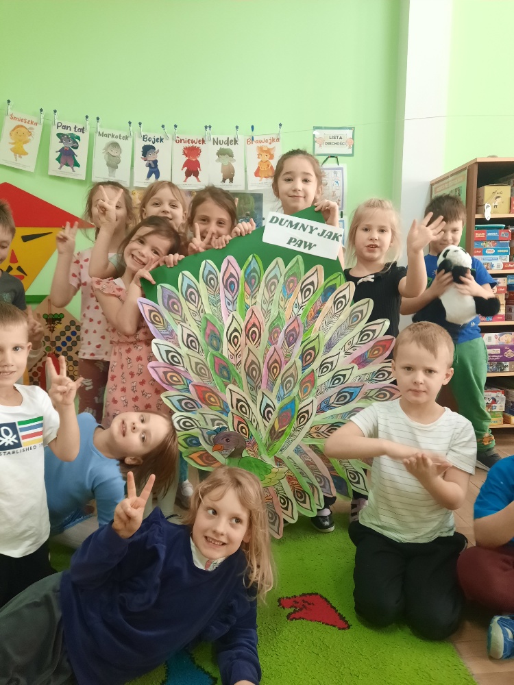 Tym razem celem naszej wyprawy była Wyspa Dumy. Dzieci wysłuchały opowiadania o Brawojce z wyspa dumy. Duma to uczucie które pojawia się , kiedy osiągamy coś, z czego jesteśmy zadowoleni, np. kiedy nauczyliśmy się nowej piosenki, czy też namalowaliśmy ładny rysunek. Duma sprawia, że czujemy się szczęśliwi i pełni radości z tego, co udało nam się osiągnąć, motywuje nas do podejmowania kolejnych wyzwań. Mądre Sowy po wysłuchaniu opowiadania układały historyjkę obrazkową wg kolejności zdarzeń i rozmawiały na temat opowiadania. Brały udział w zabawie integracyjnej „Złota korona”. Zabawa rozpoczynała się słowami: jestem dumna z tego, że….. Dziecko, które miało koronę na głowie kończyło zdanie np. jestem dumna z tego, że np. szybko uczę się nowych piosenek. Podczas zabawy dzieci przekazywały sobie koronę w kole. Dzieci, które miały problem z wypowiadaniem formuły zawsze mogły liczyć na wsparcie kolegów. Kolejna zabawa nosiła tytuł” Pokaż swój talent”. W zabawie tej dzieci poruszały się w rytmie muzyki, a na przerwę w muzyce dziecko, które stanęło w obręczy z koroną prezentowało dowolną umiejętność ruchem np. pajacyki, mostek, stanie na jednej nodze….Wcześniej dzieci wypowiadały formułę: Złota korona na głowie twej,pokaż swój talent i pozbądź się jej. Zabawa trwała do ostatniego uczestnika. Poznały powiedzenie: Dumny jak paw i w grupach wykonały pracę plastyczną. Nie zabrakło też umieszczenia Brawojki na wyspie dumy i kolorowaniu sylwety Brawojki. Realizacja wyzwania była okazją do zaprezentowania swoich talentów i podziwiania talentów kolegów i koleżanek z grupy.