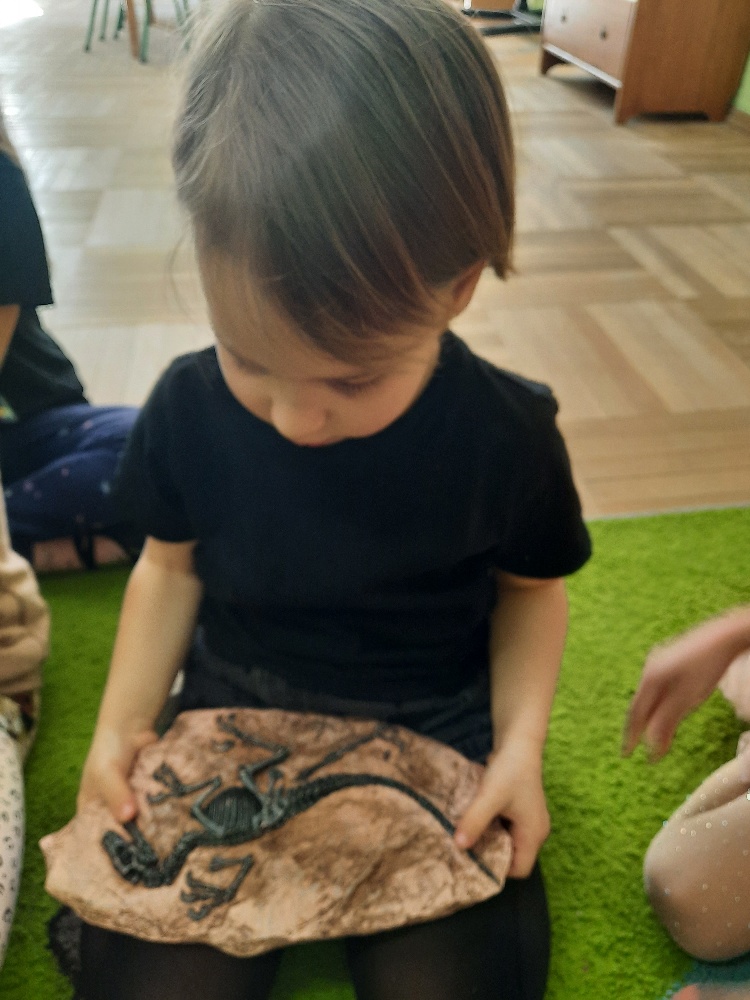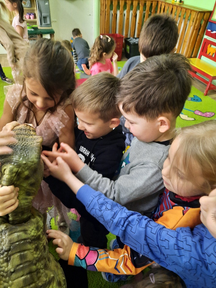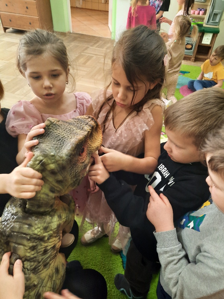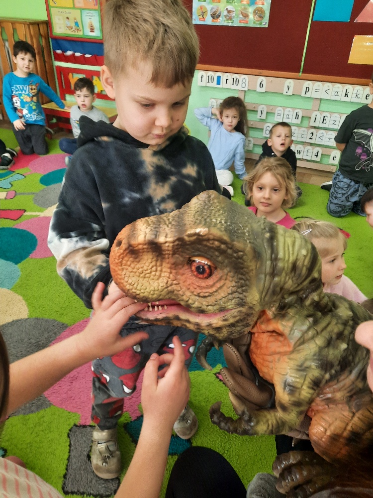 W poniedziałek 9 marca naszą grupę odwiedził niezwykły gość ze swoją opiekunką. Mowa oczywiście o dinozaurach, a właściwie o jednym – Tyranozaurze ( T- rexie). Spotkanie miało na celu wzbogacenie wiedzy przedszkolaków na temat tych pasjonujących gadów, które żyły miliony lat temu. Dzieci z uwagą słuchały ciekawostek przekazywanych przez opiekunkę T-rexa na temat środowiska i warunków w jakich żyły te potężne gady, a także tego czym się odżywiały i w jaki sposób wyginęły. Największą jednak frajdę sprawiła dzieciom możliwość dotykania, głaskania i przytulania się do T-rexa. Miały możliwość w małych grupach układać odciski stóp T-rexa oraz oglądały eksponaty edukacyjne: ząb dinozaura i szkielet dinozaura umieszczony w skale. To było interesujące spotkanie. Opiekunka T-rexa była pełna podziwu jak dużą wiedzę mają Mądre Sowy na temat tych pasjonujących gadów.