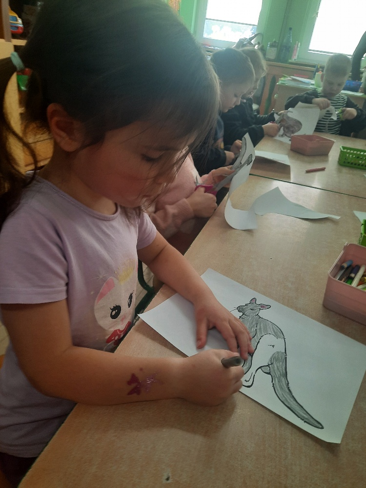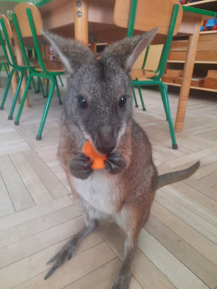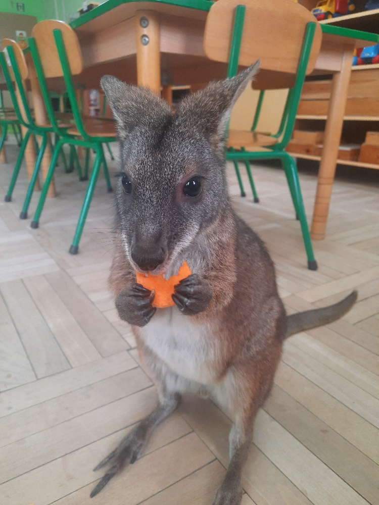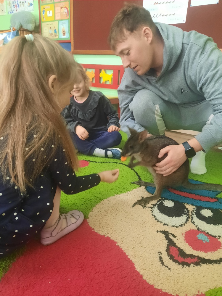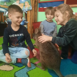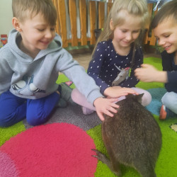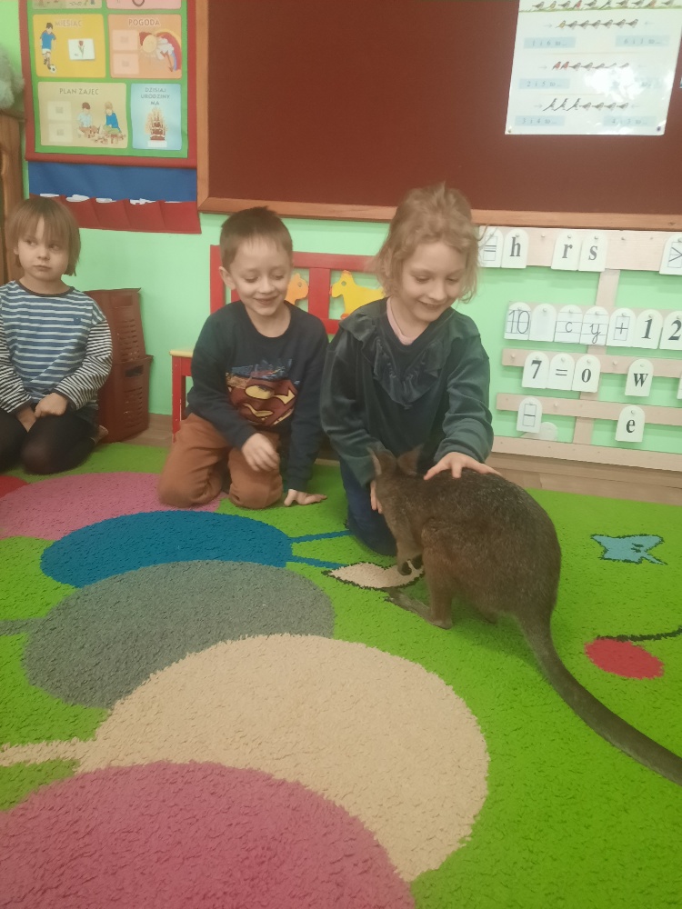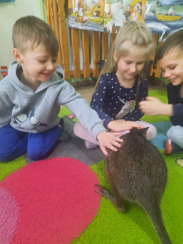 W piątek 20 lutego nasza grupa miała okazję gościć wyjątkowego gościa. Był nim kangur Seba ze swoim opiekunem. Podczas warsztatów Mądre Sowy poznały ciekawostki dotyczące życia kangurów, ich środowiska naturalnego, sposobu odżywiania oraz przystosowania do warunków panujących na kontynencie australijskim. Największym jednak zainteresowaniem cieszyła się możliwość bezpośredniej obserwacji kangura. Dzieci pod czujnym okiem opiekuna miały możliwość dotykania i głaskania kangura Seby. Zajęcia były doskonałą okazją do poszerzenia wiedzy przyrodniczej w atrakcyjnej i angażującej formie. Było to spotkanie edukacyjne, ale przede wszystkim bezpieczne dla dzieci i dla zwierzęcia, pełne pozytywnych emocji. Po wizycie kangura wszystkie dzieci przystąpiły do wspólnego wykonania pracy plastycznej. (kolorowały kangury, wycinały i naklejały na wspólnym arkuszu papieru, dorysowywały elementy charakterystyczne dla środowiska w którym żyją te zwierzęta). Dziękujemy rodzicom za sfinansowanie warsztatów, dzięki którym dzieci mogły przeżyć coś naprawdę wyjątkowego.