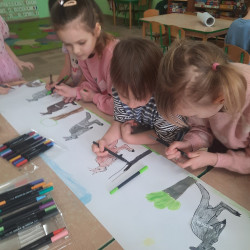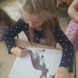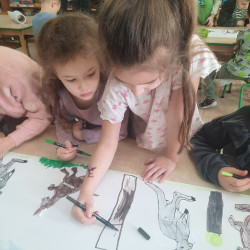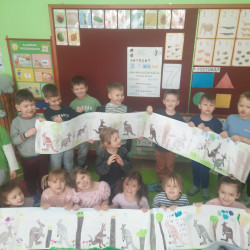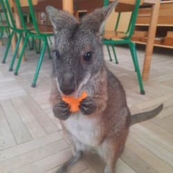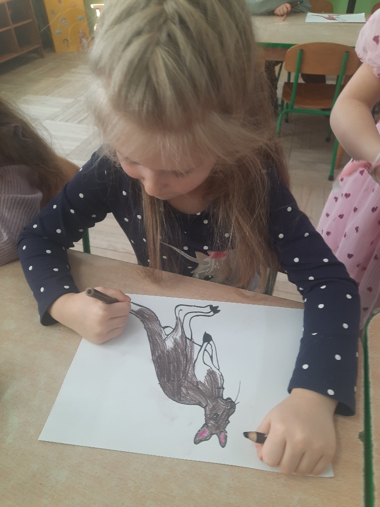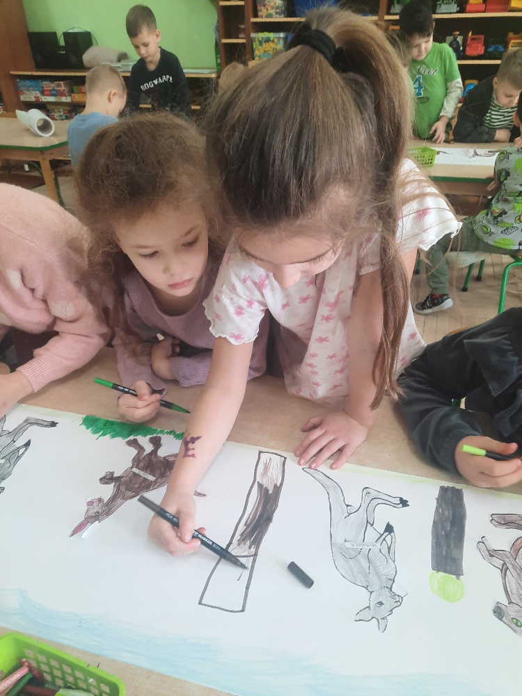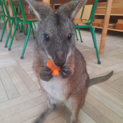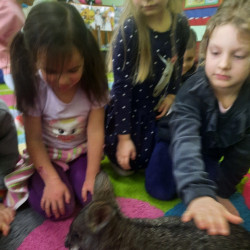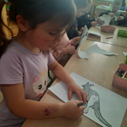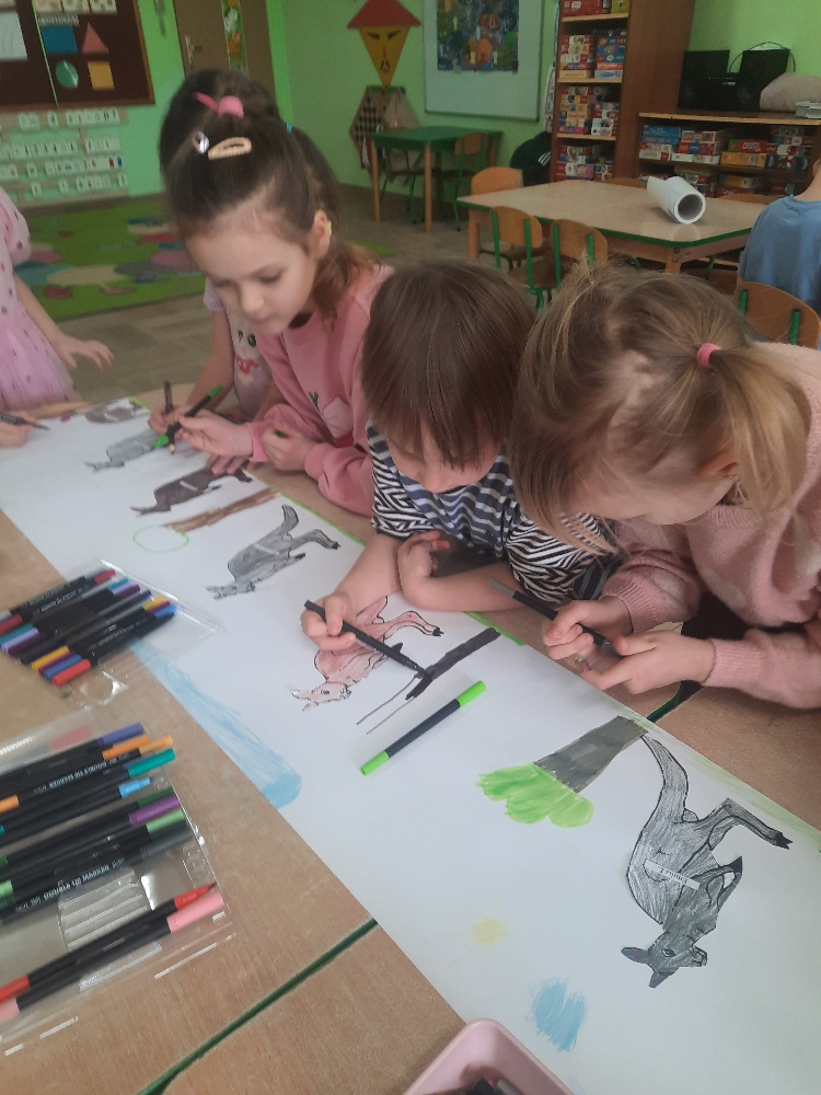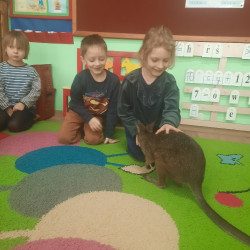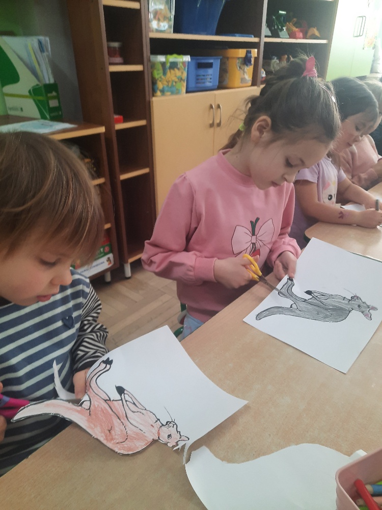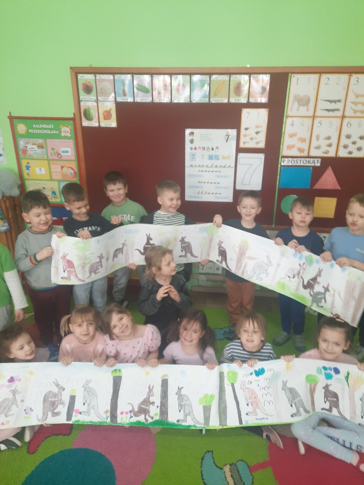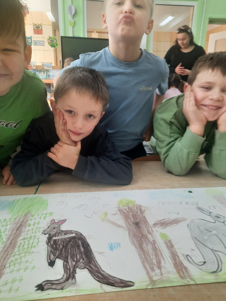 W piątek 20 lutego nasza grupa miała okazję gościć wyjątkowego gościa. Był nim kangur Seba ze swoim opiekunem. Podczas warsztatów Mądre Sowy poznały ciekawostki dotyczące życia kangurów, ich środowiska naturalnego, sposobu odżywiania oraz przystosowania do warunków panujących na kontynencie australijskim. Największym jednak zainteresowaniem cieszyła się możliwość bezpośredniej obserwacji kangura. Dzieci pod czujnym okiem opiekuna miały możliwość dotykania i głaskania kangura Seby. Zajęcia były doskonałą okazją do poszerzenia wiedzy przyrodniczej w atrakcyjnej i angażującej formie. Było to spotkanie edukacyjne, ale przede wszystkim bezpieczne dla dzieci i dla zwierzęcia, pełne pozytywnych emocji. Po wizycie kangura wszystkie dzieci przystąpiły do wspólnego wykonania pracy plastycznej. (kolorowały kangury, wycinały i naklejały na wspólnym arkuszu papieru, dorysowywały elementy charakterystyczne dla środowiska w którym żyją te zwierzęta). Dziękujemy rodzicom za sfinansowanie warsztatów, dzięki którym dzieci mogły przeżyć coś naprawdę wyjątkowego.