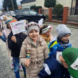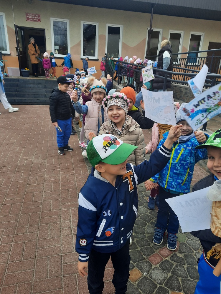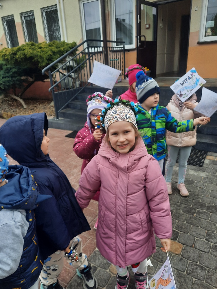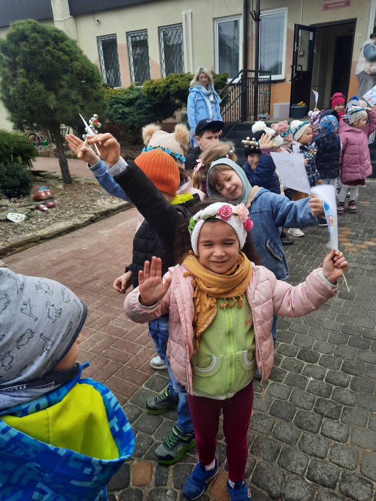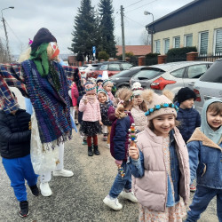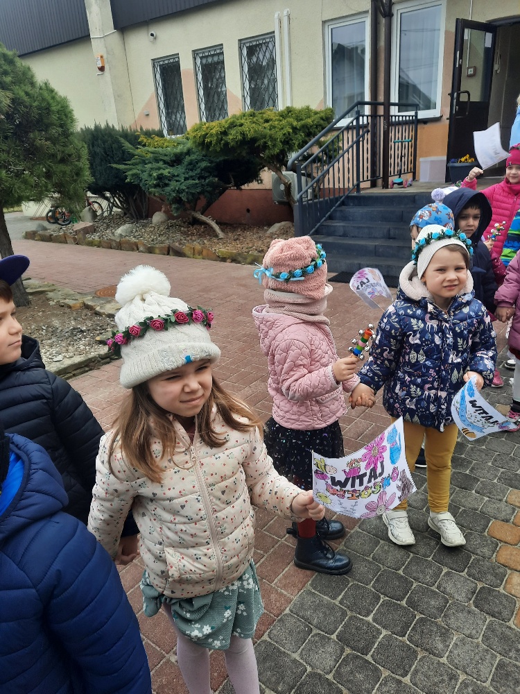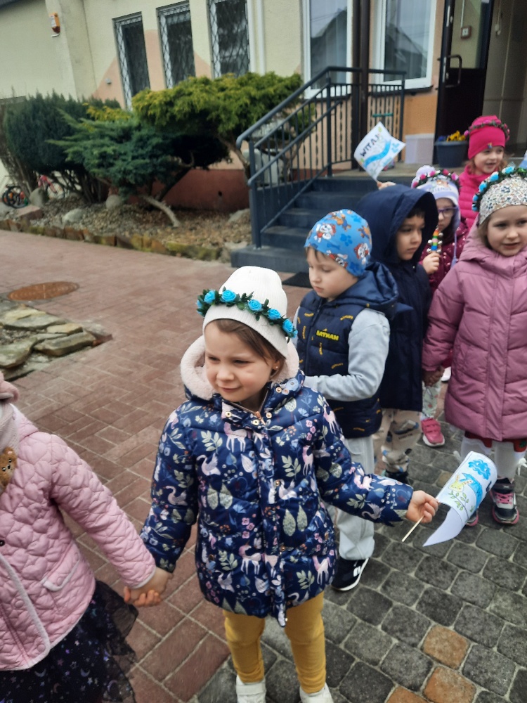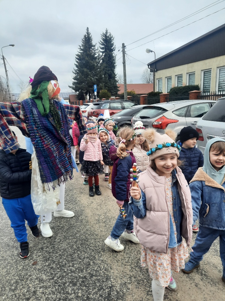 20 marca obchodziliśmy pierwszy dzień astronomicznej wiosny. Jest to bardzo radosne święto. Tego dnia żegnamy zimę i witamy nową porę roku WIOSNĘ. Mądre Sowy już z samego rana z pomocą dorosłych przygotowały zimową kukłę – symbol odchodzącej zimy. Po śniadaniu dziewczynki wystrojone w wianuszki z kolorowych kwiatów, a chłopcy w czapki żabek wzięły udział w wiosennych zabawach. Wysłuchały opowieści o starym zwyczaju topienia kukły – Marzanny. Po zabawach, zagadkach, pracy plastycznej i tańcach przy wiosennych utworach najbardziej oczekiwaną częścią dnia był korowód wokół przedszkola, podczas którego mogliśmy pożegnać zimę wykrzykując hasła: Precz zimo zła. Przedszkolaki z okrzykami radości maszerowały w wiosennym korowodzie z chorągiewkami i instrumentami muzycznymi w towarzystwie Marzanny. W barwnym pochodzie, wróciliśmy na teren przedszkola z nadzieją, że upragniona wiosna na dobre pozostanie z nami. A nasze Marzanny pozostały w ogrodzie i wierzymy w to, że w poniedziałek już ich nie będzie.