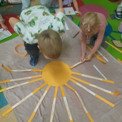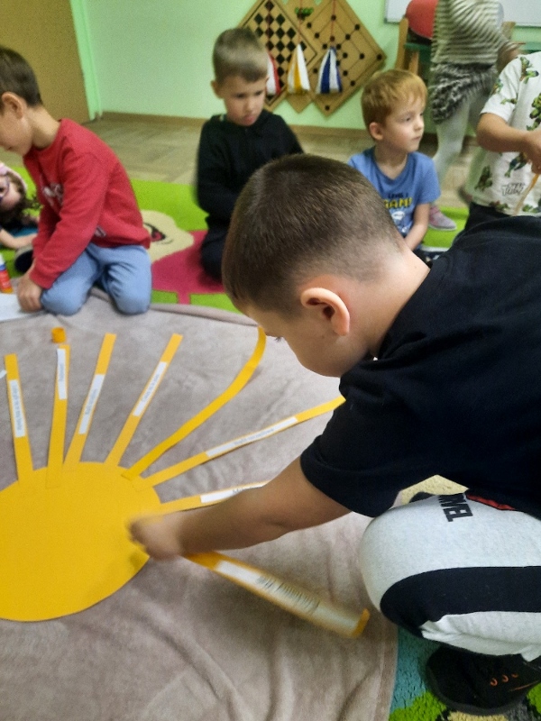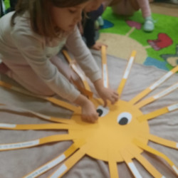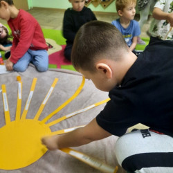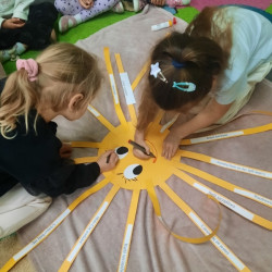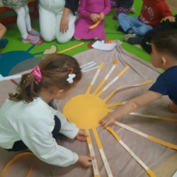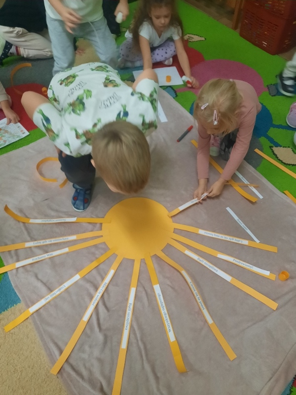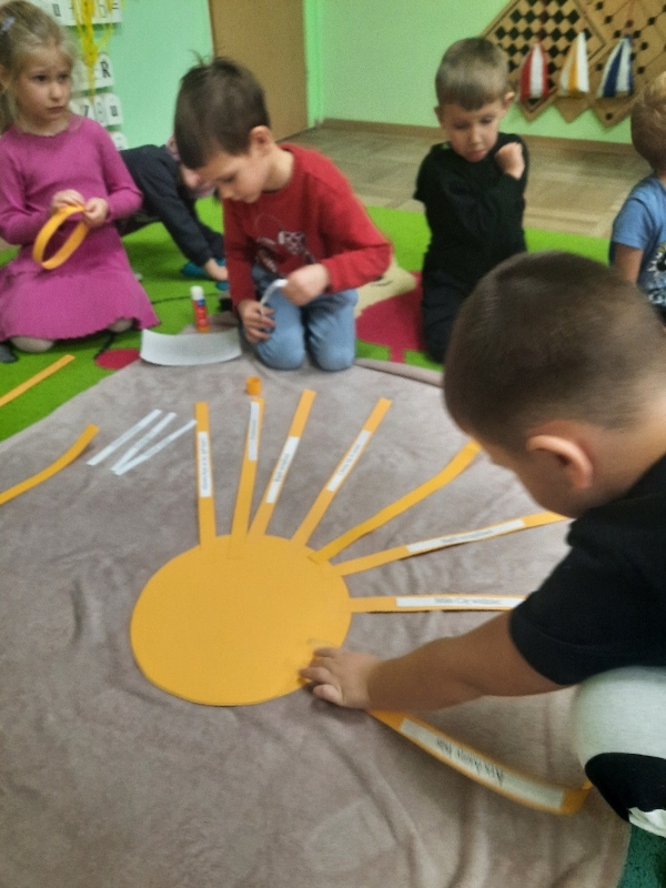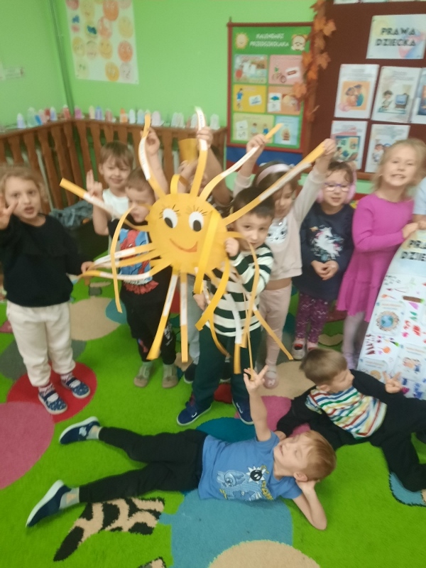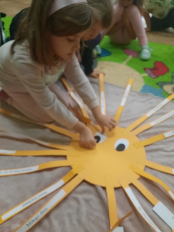 W piątek obchodziliśmy w naszej grupie Dzień Życzliwości. Święto to było okazją aby porozmawiać z dziećmi i przypomnieć im o zasadach dobrego wychowania. Podczas zajęć wysłuchały opowiadania „Dwaj przyjaciele”H. Bechlerowej. Poznały znaczenie powiedzenia „Prawdziwych przyjaciół poznajemy w biedzie”. Mądre Sowy uczyły się też kulturalnego odnoszenia się do rówieśników. Podczas dyskusji opowiadały jak rozumieją życzliwość wobec drugiej osoby, dlaczego warto być miłym oraz jak okazywać życzliwość kolegom, rodzicom oraz osobom starszym. Tego dnia była również okazja przypomnienia dzieciom zasad używania magicznych słów: dzień dobry, do widzenia, proszę, dziękuję, poproszę i przepraszam. Brały udział w zabawie „Serduszko życzliwości” podając skojarzenia do pojęcia „życzliwość”. Propozycje zostały zapisane na karteczka, które dzieci naklejały na promyki słońca. Potem każdy promyk został doklejony do słońca. W ten sposób powstało uśmiechnięte „Słońce życzliwości”. Wspólne radosne zabawy przy piosenkach oraz w zabawach dowolnych zachęcały dzieci do pozytywnych zachowań. W tym dniu każdy starał się być miły i serdeczny. Mamy nadzieje, że te dobre zachowania pozostaną w naszej grupie na dłużej.