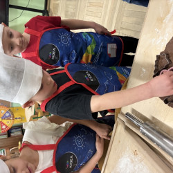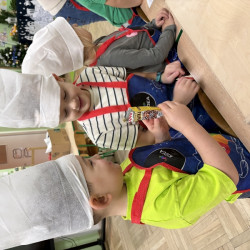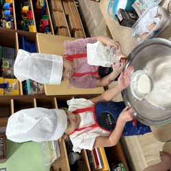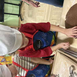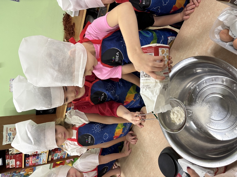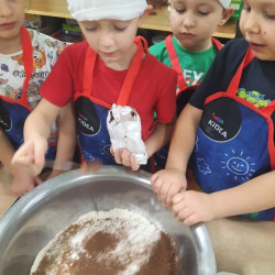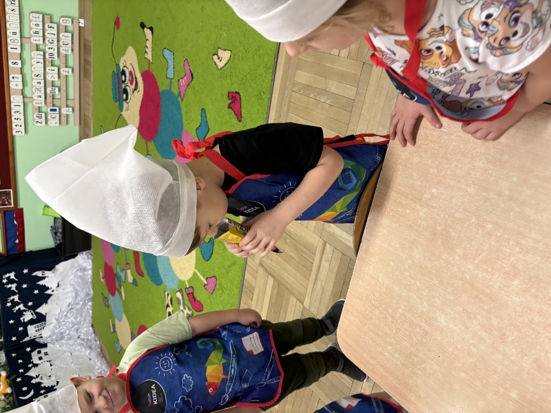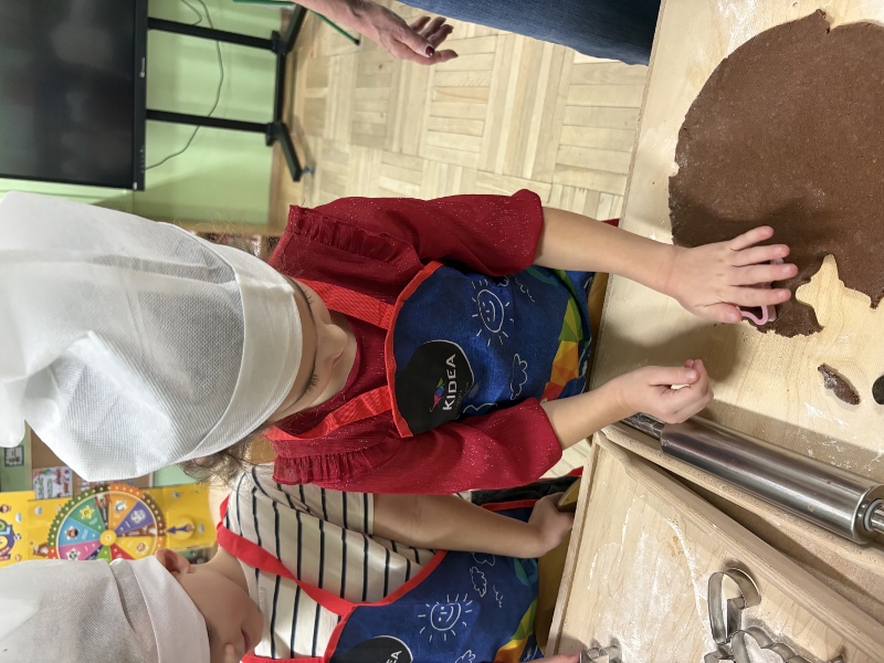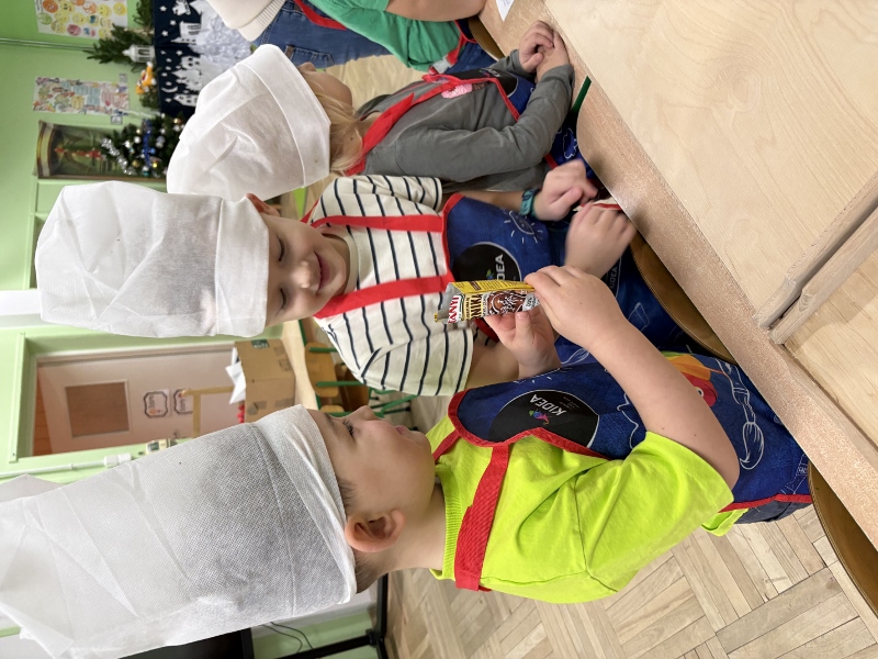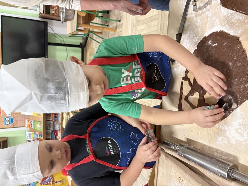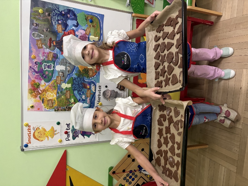 W poniedziałek 15 grudnia w naszym przedszkolu za sprawą dzieci z grupy Mądre Sowy, które w ten wyjątkowy, przedświąteczny czas, postanowiły upiec pierniki unosił się wspaniały, świąteczny, korzenny zapach pierników. Najpierw dzieci poznały składniki i sposób wykonania ciasta. Dowiedziały się, że sekretem pysznych pierników jest miód i przyprawy korzenne. Po dokładnym umyciu rąk, założeniu fartuszków i czapek Master Chefa przedszkolaki ochoczo zabrały się do pracy. Połączyły wszystkie produkty zgodnie z przepisem. Z przygotowanego ciasta, wykrawały różne kształty pierników wykorzystując foremki w kształcie serca, choinki, gwiazdki, bałwanka, renifera. Pierniczki zostały upieczone , a następnego dnia każde dziecko mogło je udekorować według uznania. Każdy mógł skosztować tych magicznych, kolorowych pierników. Pozostałe pierniczki zostały zapakowane w torebki i dołączone do świątecznych stroików przygotowanych dla rodziców.