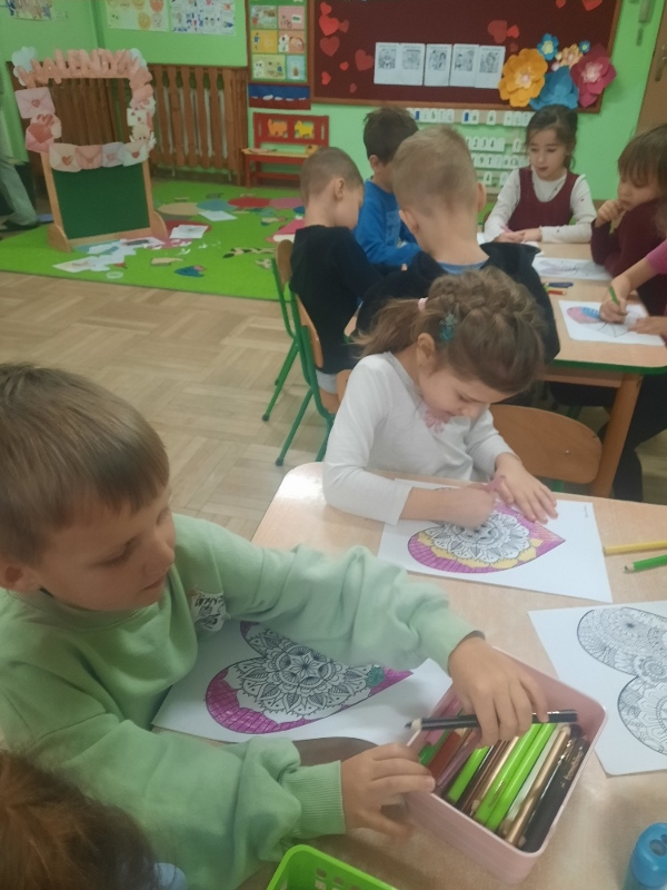 Walentynki to radosne święto mające na celu promowanie życzliwości i przyjaźni wśród dzieci. W piątek 13 lutego przedszkolaki z grupy Mądre Sowy zapoznały się z tradycją „Walentynek” wysłuchując historii o świętym Walentym. Rozmawiały o tym jak można okazywać miłość, przyjaźń oraz szacunek bliskim osobom nie tylko od święta. Brały udział w zabawach tematycznych takich jak: szukanie drugiej połówki serca, układały memory walentynkowe, kolorowały serduszkowe mandale, uczestniczyły w zabawach matematycznych i zabawach z latarką. Wykonywały walentynkowe laurki dla swoich bliskich w domu. Na pamiątkę tego dnia pozowały w specjalnej „Walentynkowej foto -budce”.