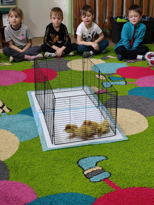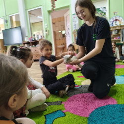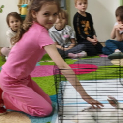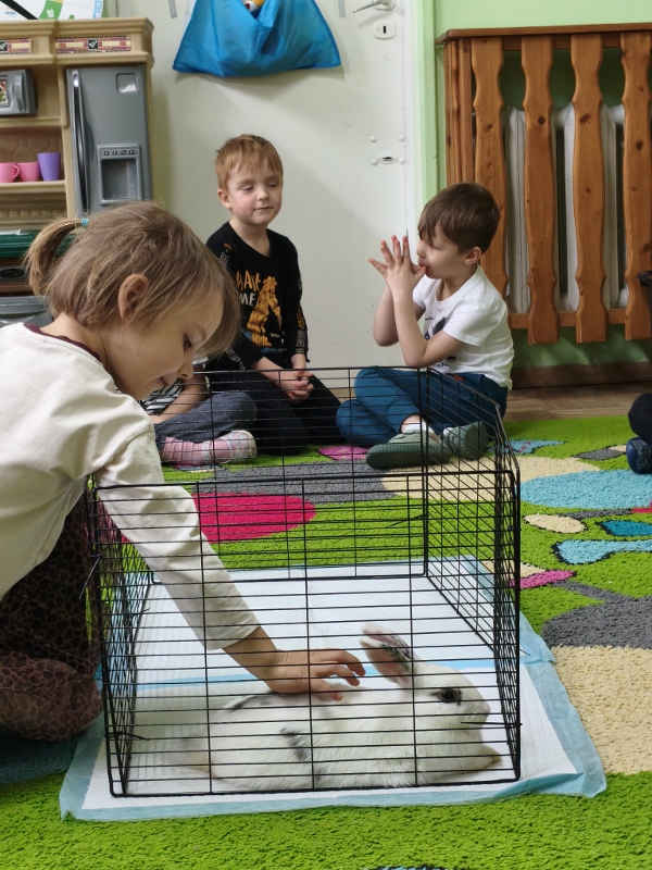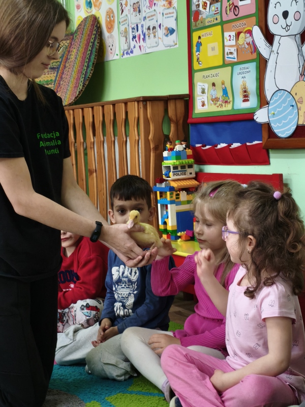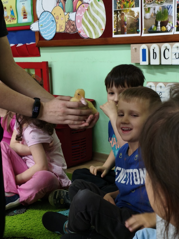 Podczas warsztatów dzieci poznały także urocze kaczuszki oraz przyjaznego króliczka, które równie szybko skradły ich serca. Przedszkolaki mogły je obserwować z bliska, a nawet delikatnie pogłaskać. Dowiedziały się również wielu ciekawostek o ich zwyczajach i sposobie życia.