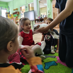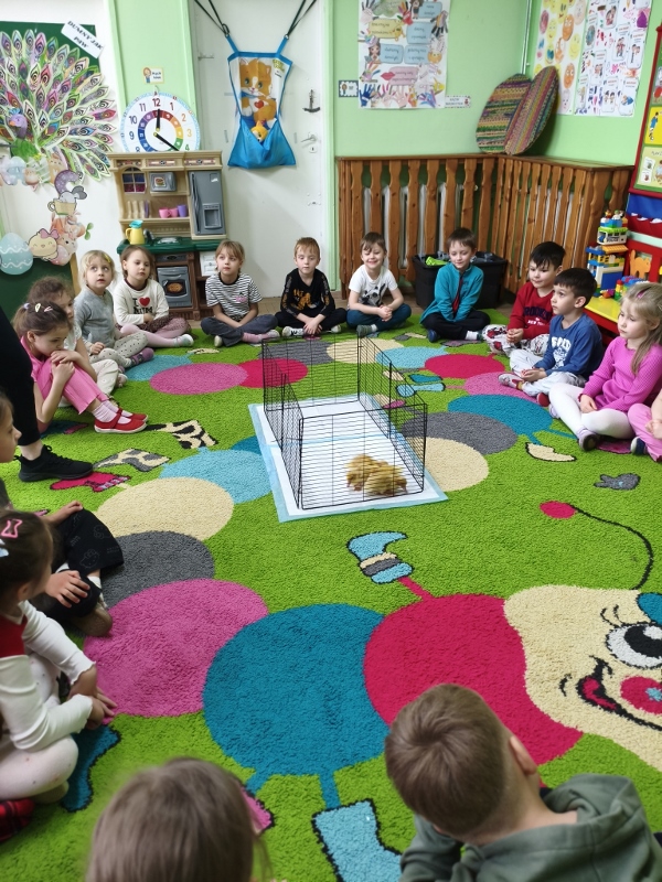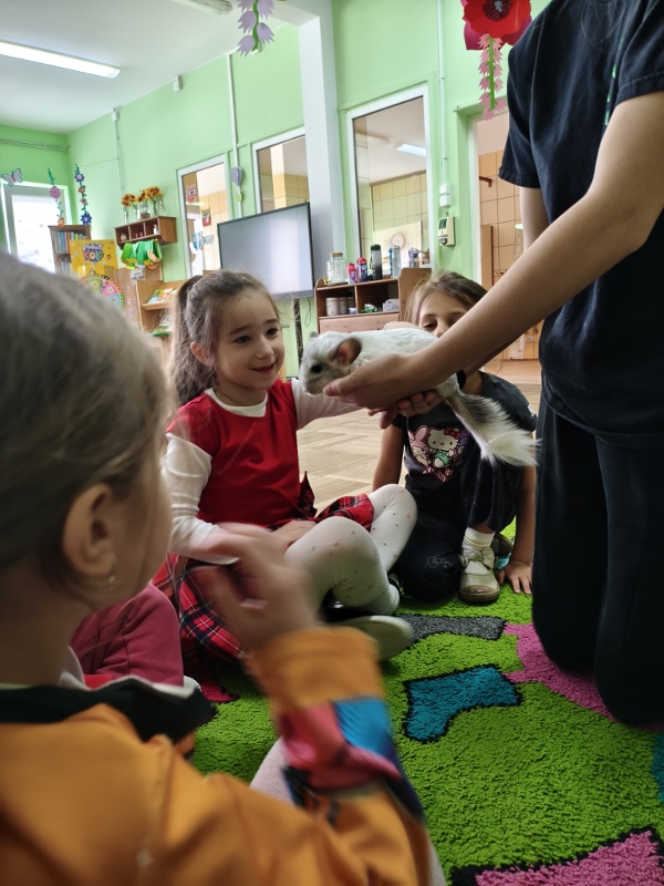 Do grupy „Mądre Sowy" zawitały wyjątkowe warsztaty ze zwierzątkami, które wzbudziły ogromne zainteresowanie i radość wśród dzieci. Największą gwiazdą spotkania okazała się szynszyla, która zachwyciła wszystkich swoim niezwykle miękkim i przyjemnym w dotyku futerkiem.