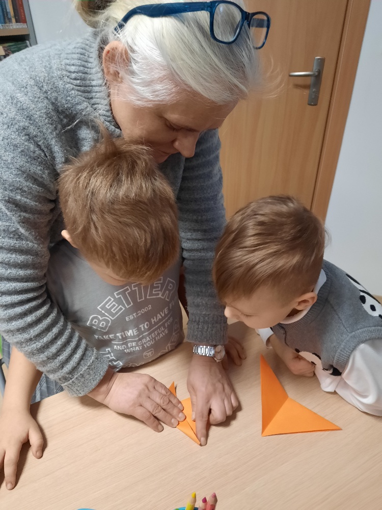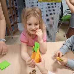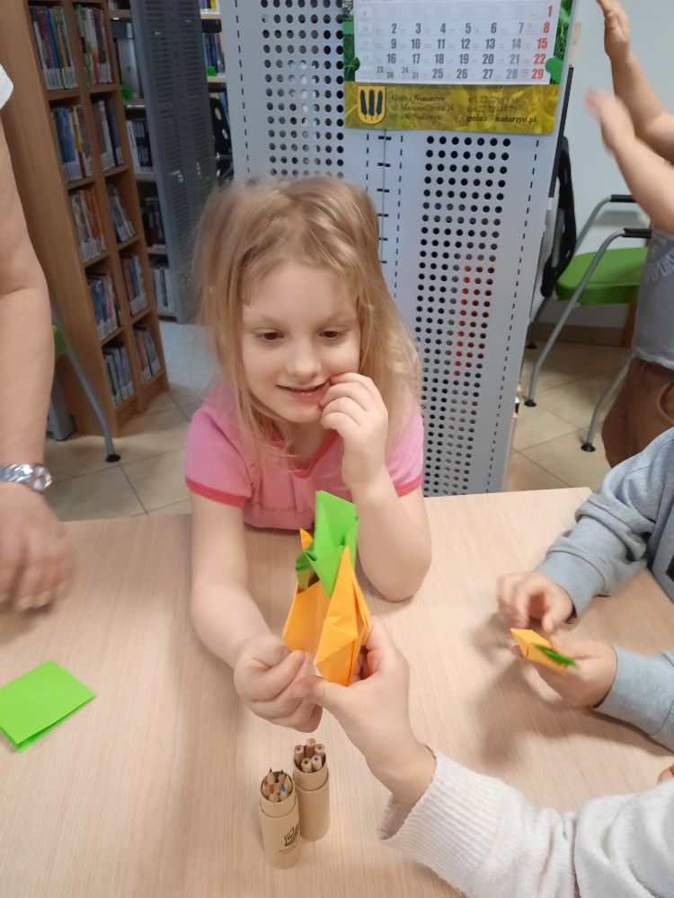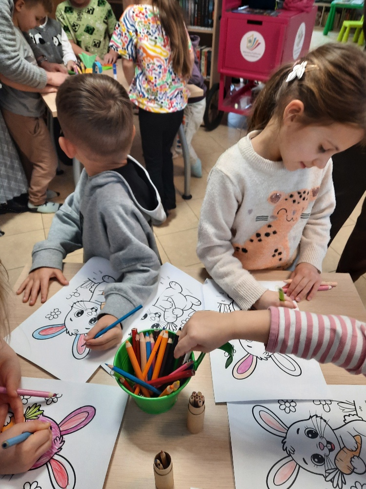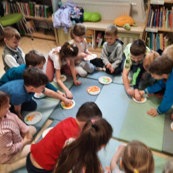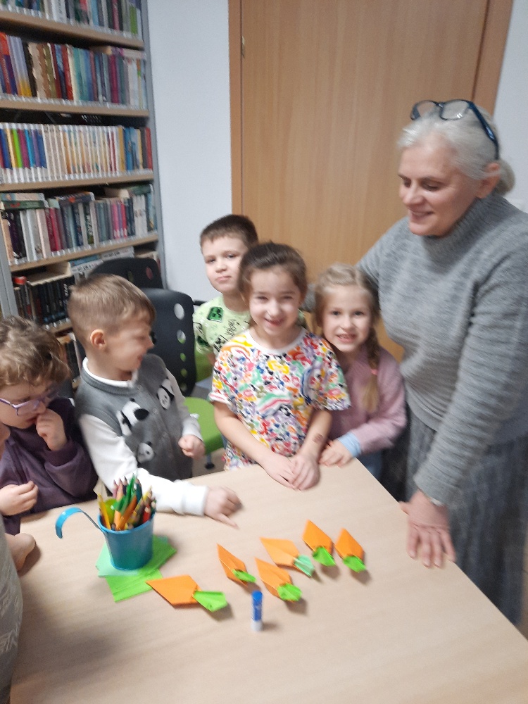W środę 04.02.26 przedszkolaki wybrały się do biblioteki na zajęcia z okazji nietypowego dnia „Dnia ciasta marchewkowego”. Dzień ten rozpoczęliśmy od wysłuchania opowieści o Króliku z książki Katy Hudson „Za dużo marchewek”. Dowiadujemy się z niej., że króliczek zgromadził w swoim domku za dużo marchewek, więc postanawia poszukać dla swojego przysmaku nowego miejsca. Przyjaciele użyczali mu swoich domków, które za każdym razem ulegały zniszczeniu wobec nadmiaru słodkiego pomarańczowego warzywa. Królik zrozumiał, że rozwiązaniem jego dużego problemu jest podzielenie się marchewkami z innymi. Książka była inspiracją do rozmów na temat zdrowego odżywiania, a także do twórczych aktywności plastycznych. Uczestnicy zajęć wspólnie z panią Basią wykonali marchewki metodą origami, kolorowali postać króliczka i próbowali pysznych marchewkowych ciasteczek z ziarnami. Dzieci wróciły do przedszkola z uśmiechami na twarzy. Zajęcia były jak zwykle pouczające. Tego dnia nauczyliśmy się że przyjaźń i dzielenie się z innymi są ważniejsze niż gromadzenie dóbr.