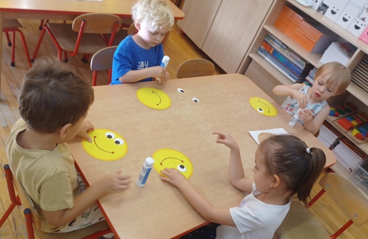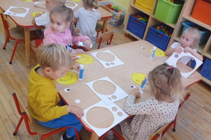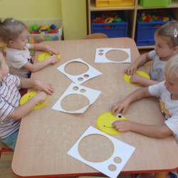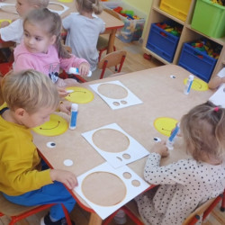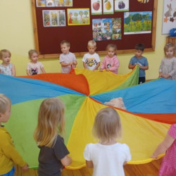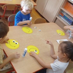 Z tej okazji w naszej grupie zorganizowane zostały zabawy ruchowe z chustą animacyjną przy muzyce, zabawy taneczne, dzieci na zajęciach plastyczno-technicznych wykonały uśmiechnięte buźki, był zdrowy owocowy poczęstunek.