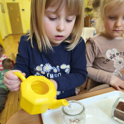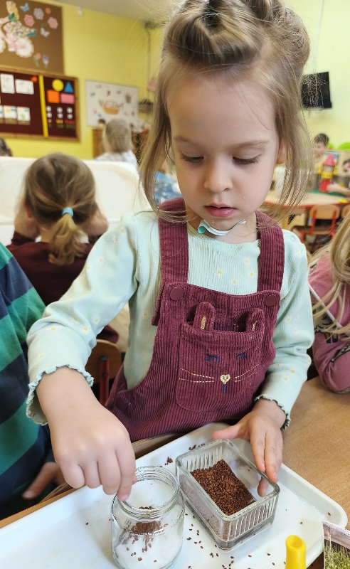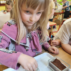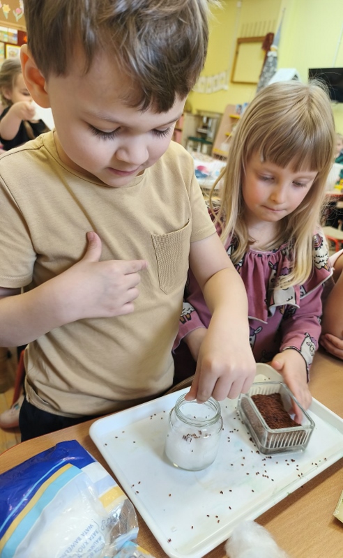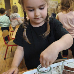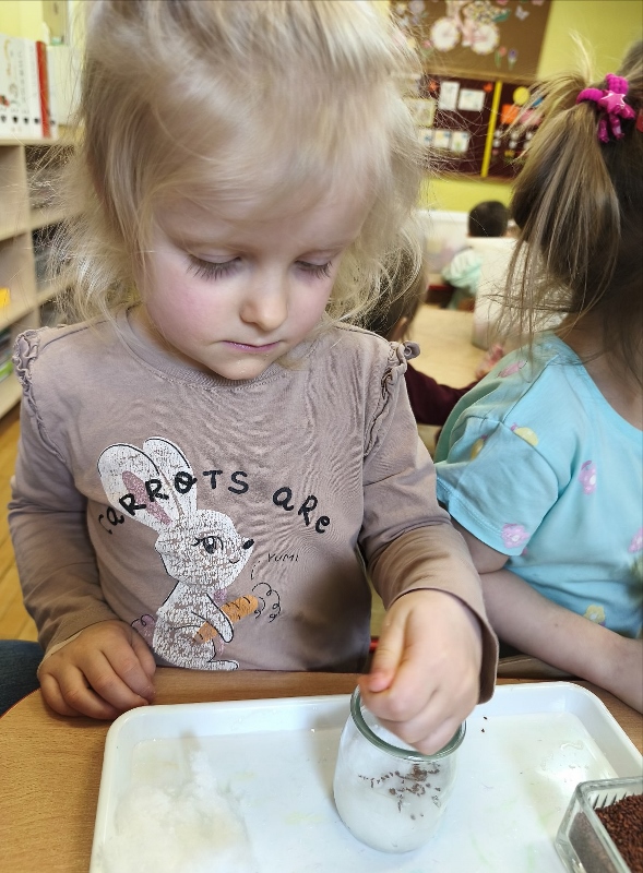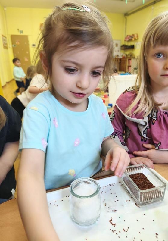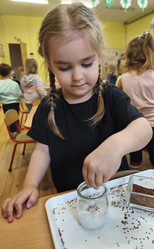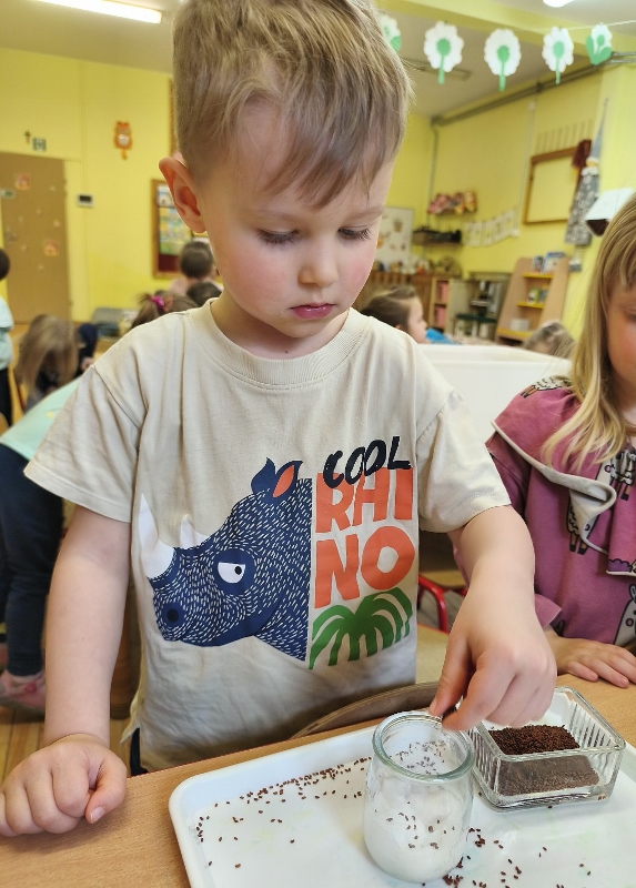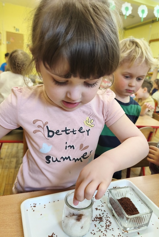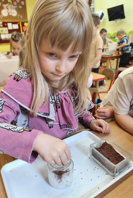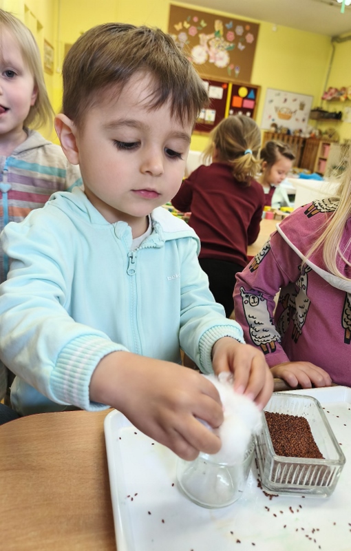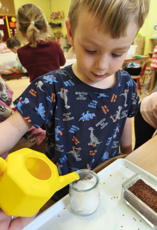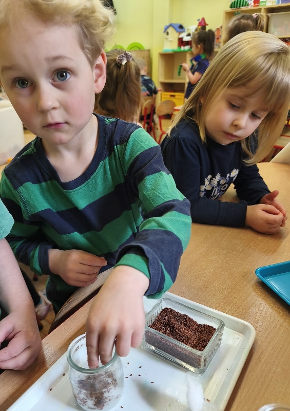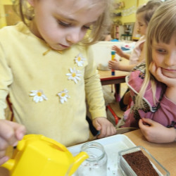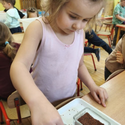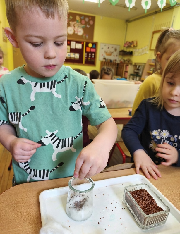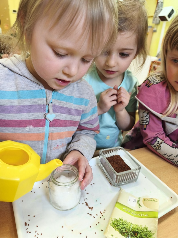 Jednym z pierwszych zadań było sianie rzeżuchy. Przedszkolaki z ciekawością obserwowały, jak z małych nasionek wyrastają zielone roślinki, ucząc się przy tym cierpliwości i systematyczności w pielęgnacji.