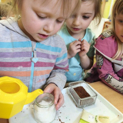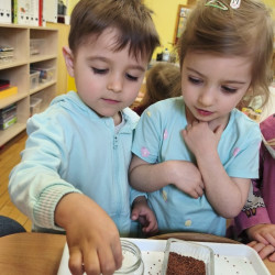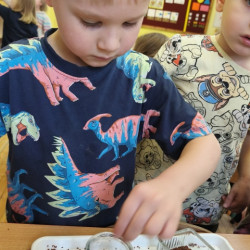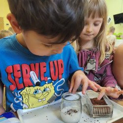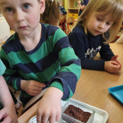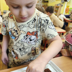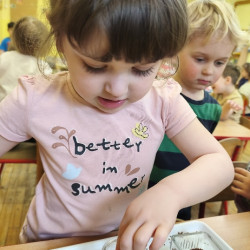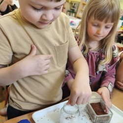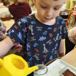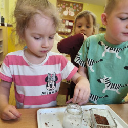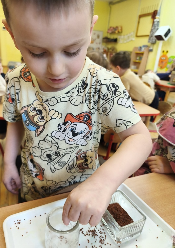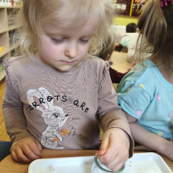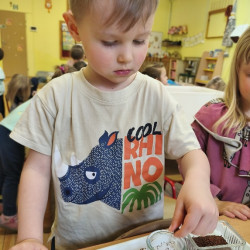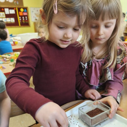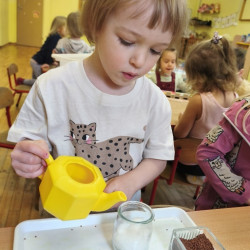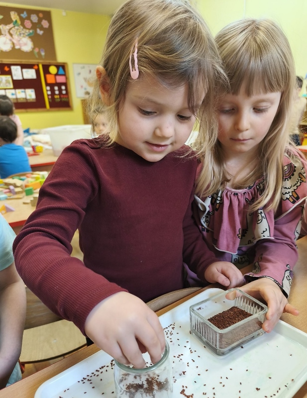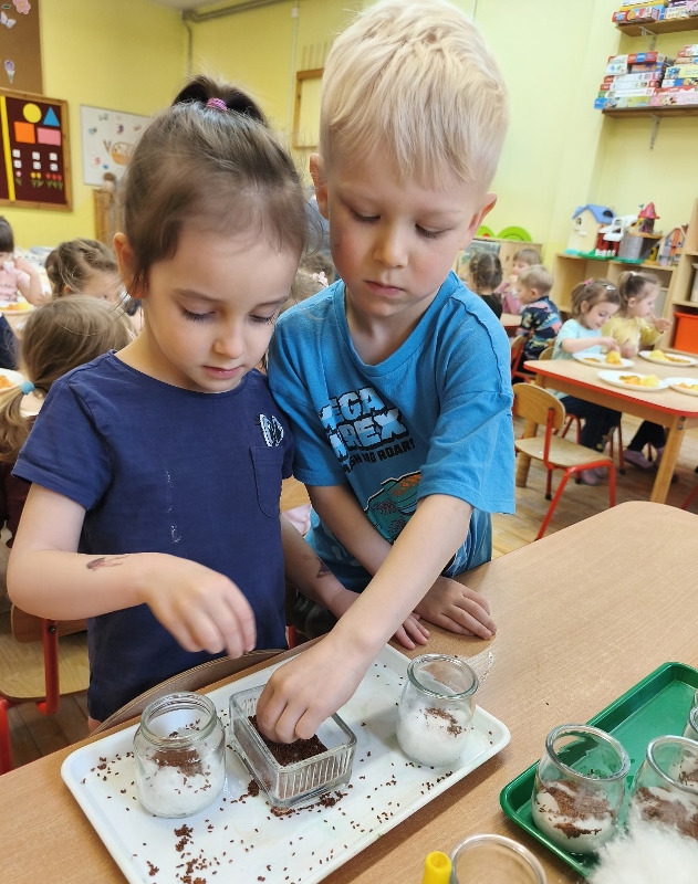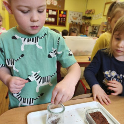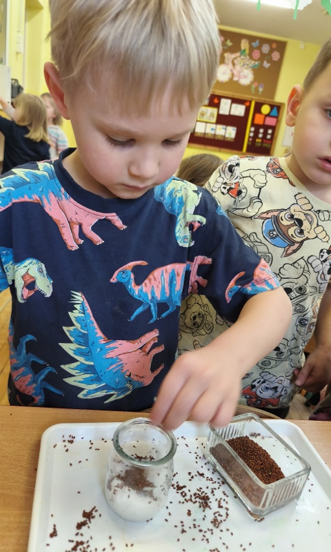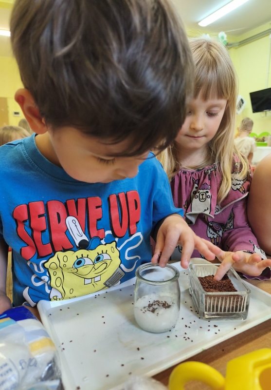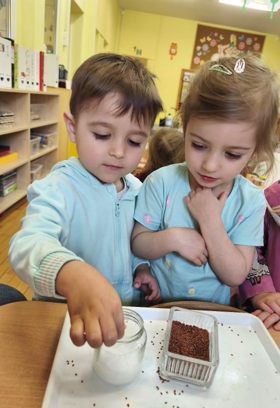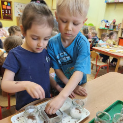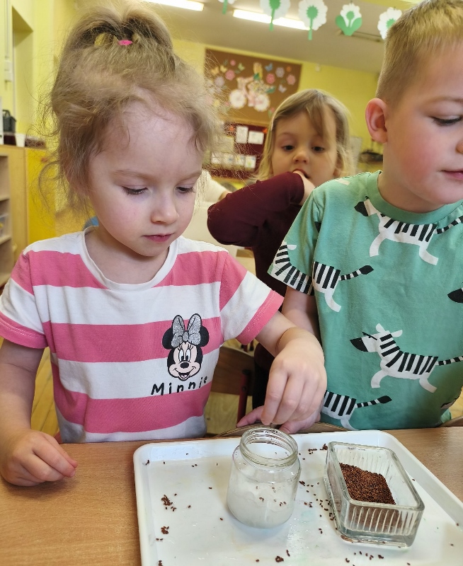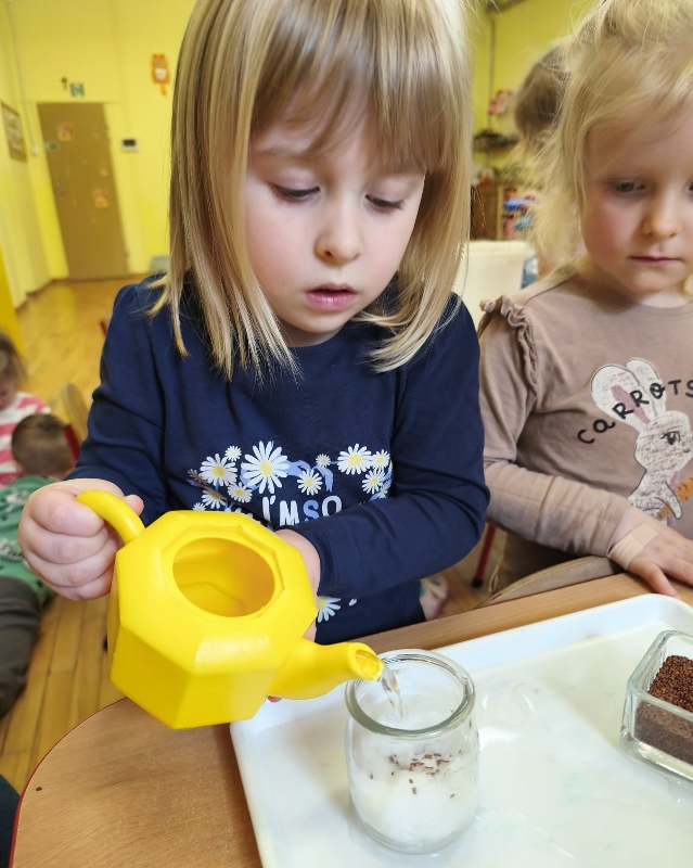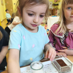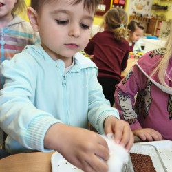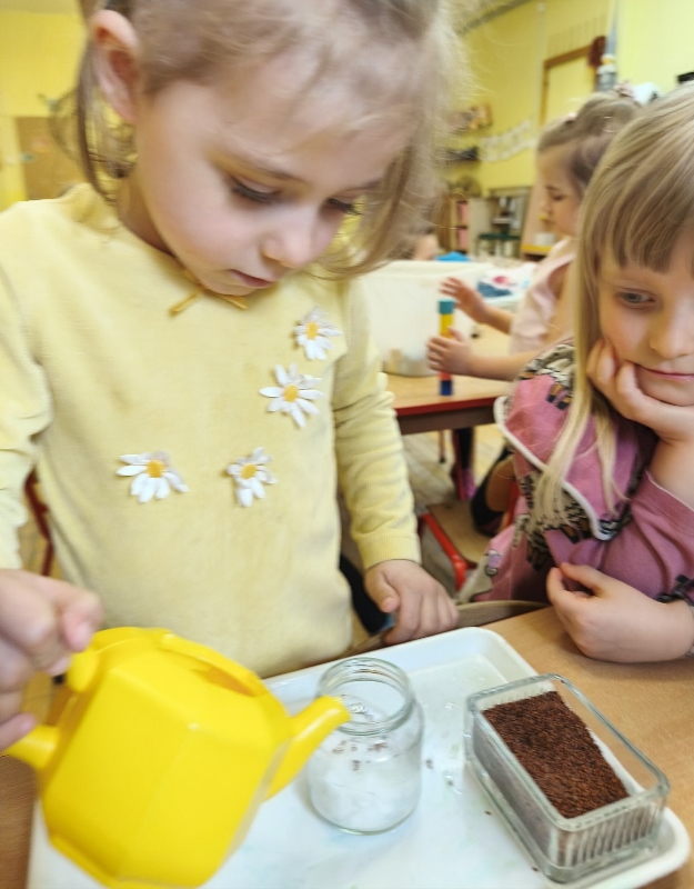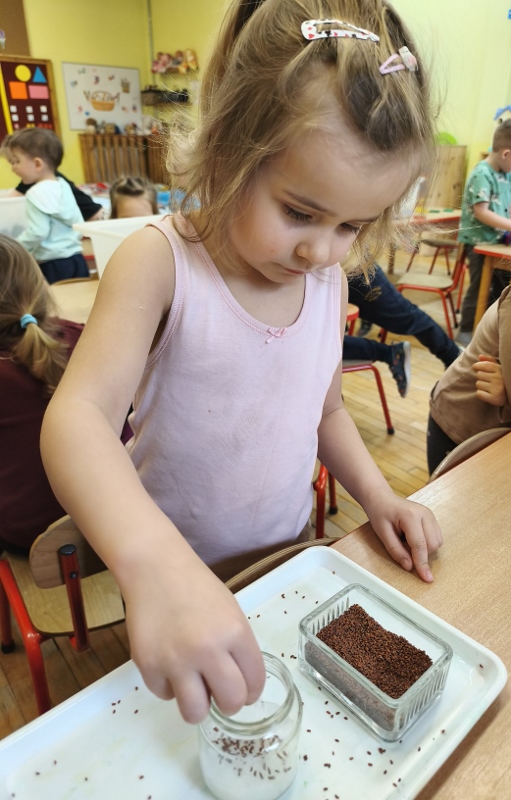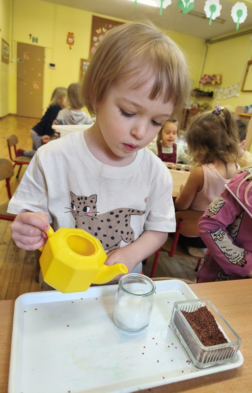 Jednym z pierwszych zadań było sianie rzeżuchy. Przedszkolaki z ciekawością obserwowały, jak z małych nasionek wyrastają zielone roślinki, ucząc się przy tym cierpliwości i systematyczności w pielęgnacji.