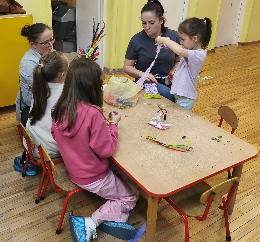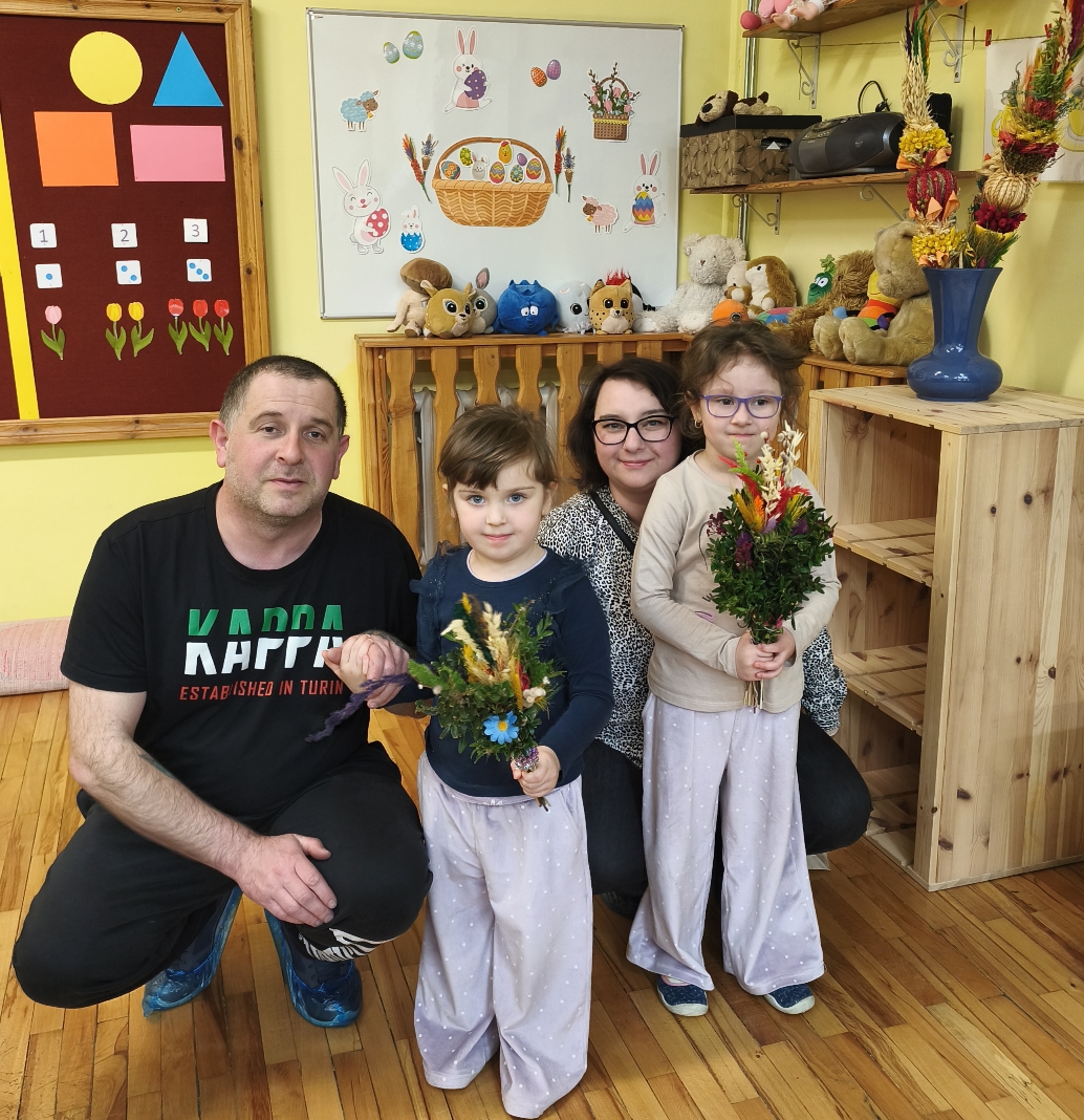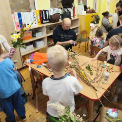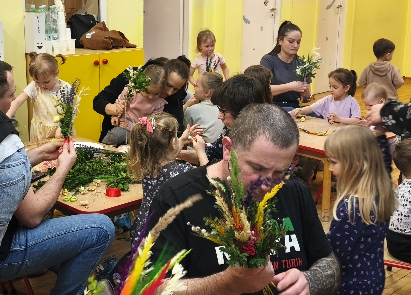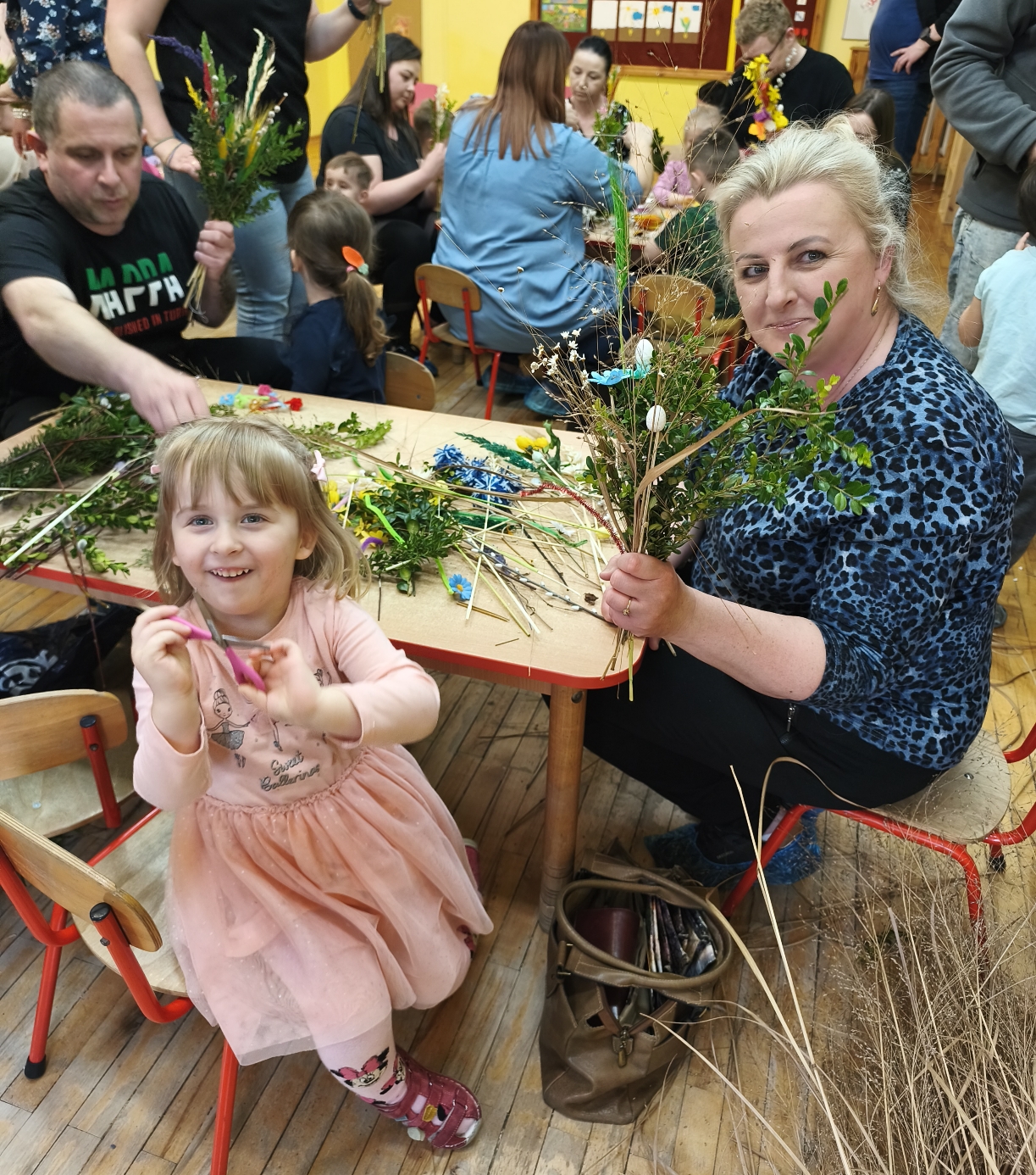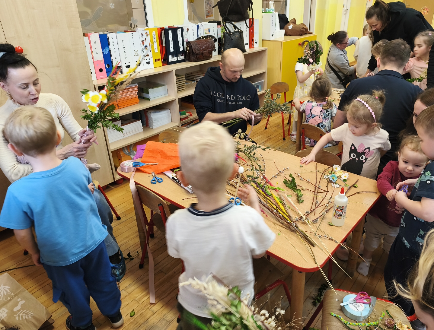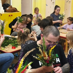 Tego dnia grupa „Pszczółki” miała przyjemność gościć swoich najbliższych – Rodziców oraz Rodzeństwo. Wspólna praca nad palmami wielkanocnymi stała się doskonałą okazją do integracji, budowania relacji oraz dzielenia się pomysłami i umiejętnościami. Dzieci z ogromnym zaangażowaniem tworzyły kolorowe kompozycje, wykorzystując różnorodne materiały i ozdoby, a wsparcie bliskich dodawało im jeszcze więcej radości i motywacji.