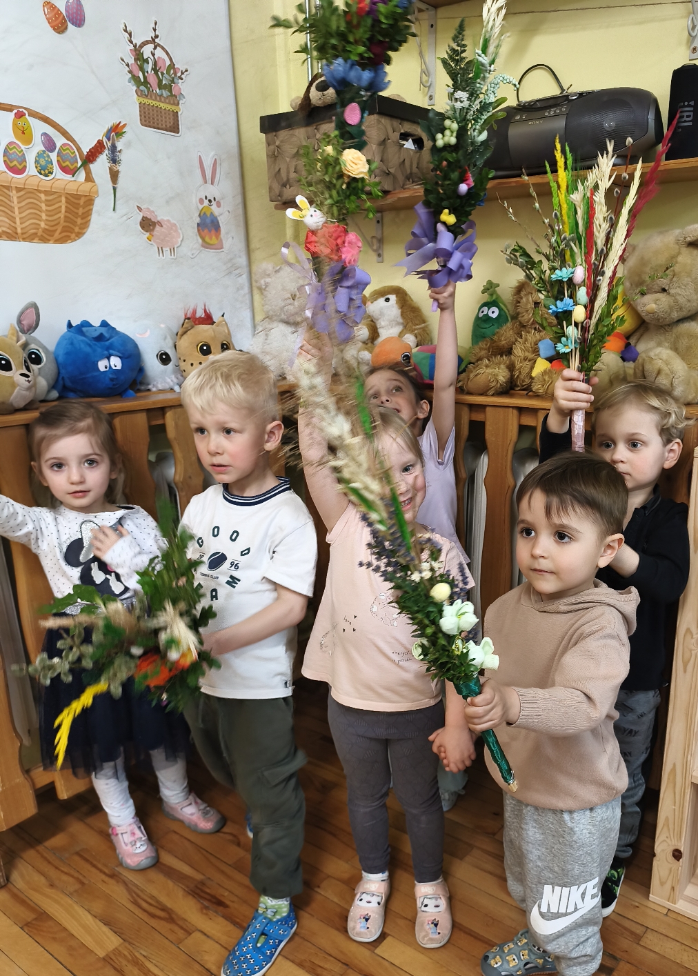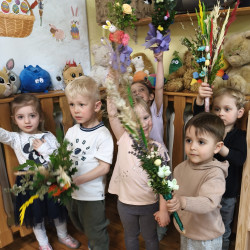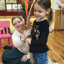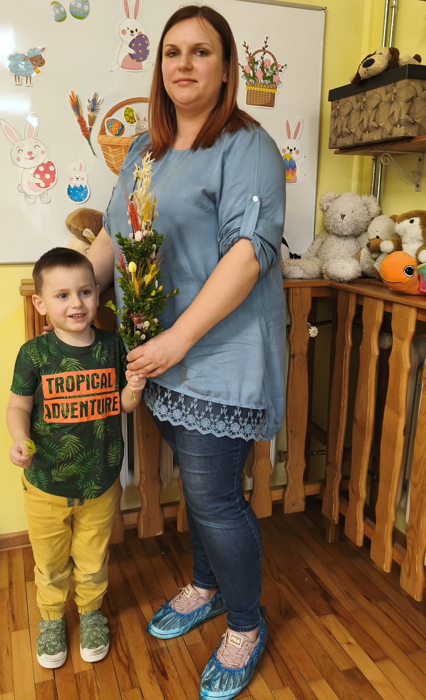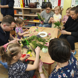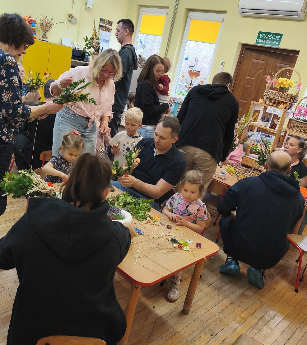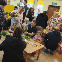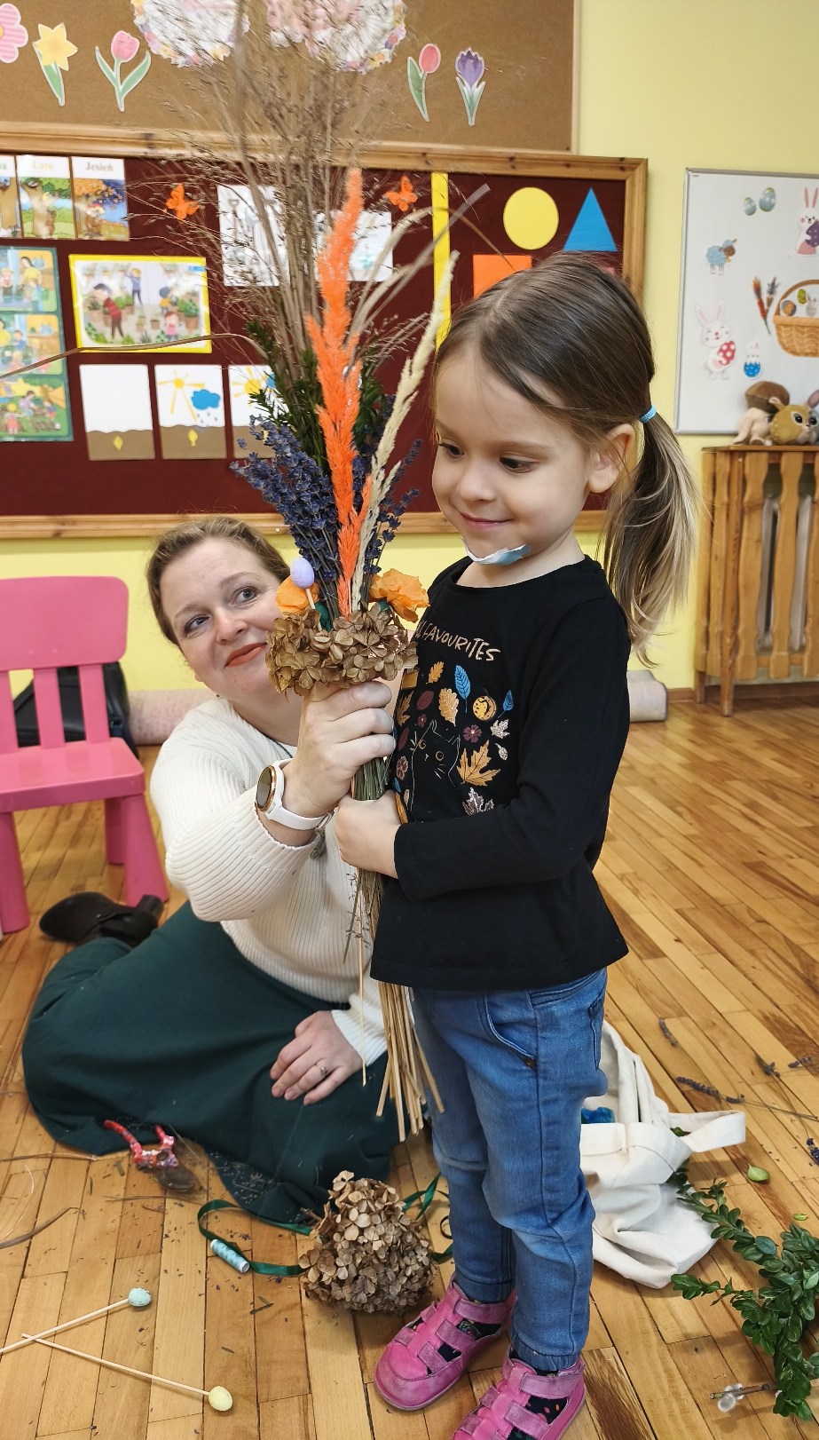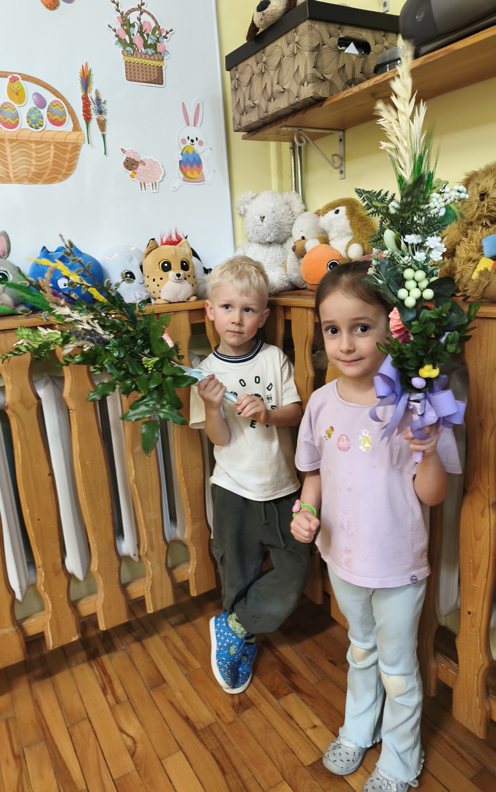 Tego dnia grupa „Pszczółki” miała przyjemność gościć swoich najbliższych – Rodziców oraz Rodzeństwo. Wspólna praca nad palmami wielkanocnymi stała się doskonałą okazją do integracji, budowania relacji oraz dzielenia się pomysłami i umiejętnościami. Dzieci z ogromnym zaangażowaniem tworzyły kolorowe kompozycje, wykorzystując różnorodne materiały i ozdoby, a wsparcie bliskich dodawało im jeszcze więcej radości i motywacji.