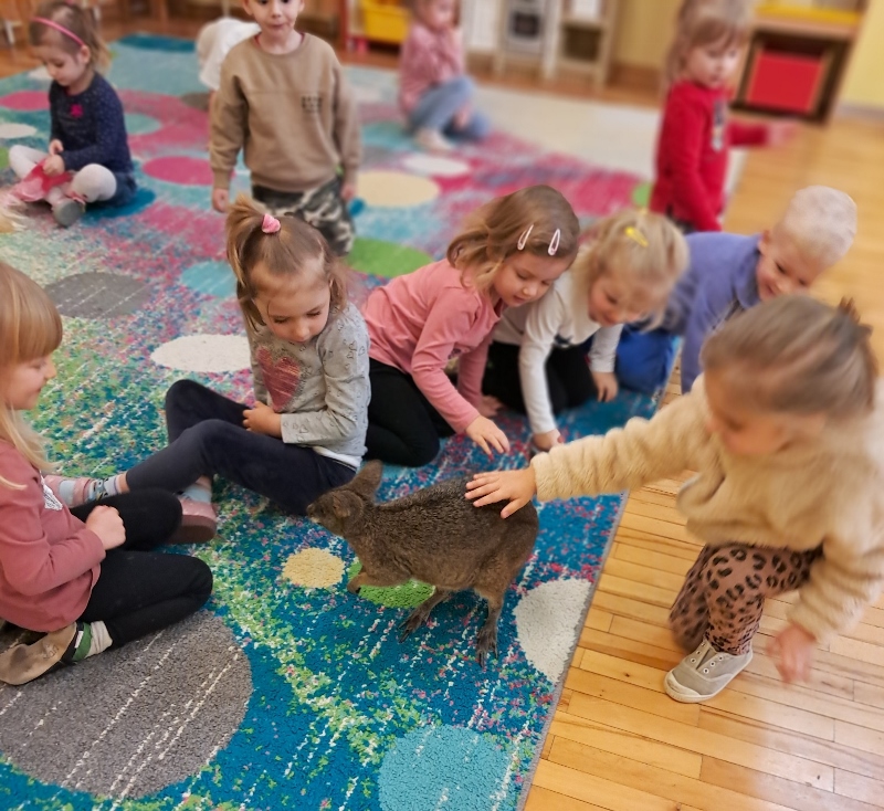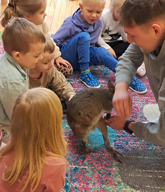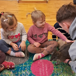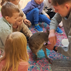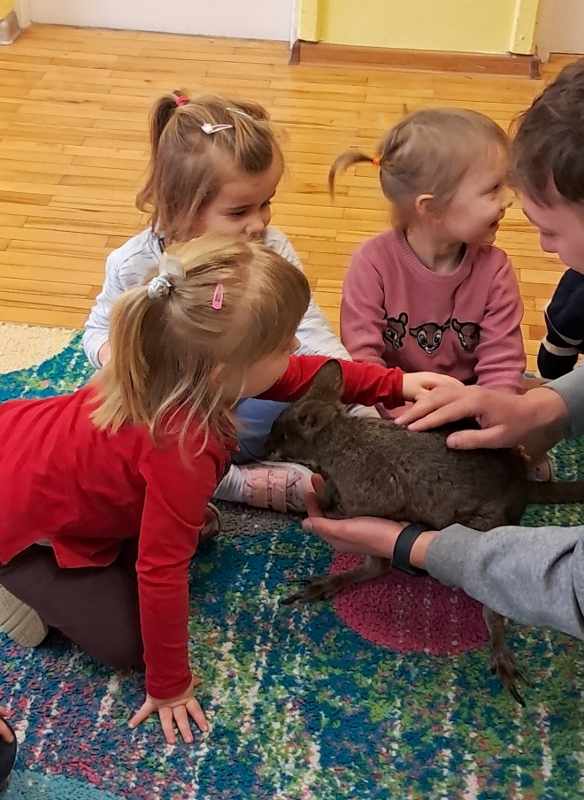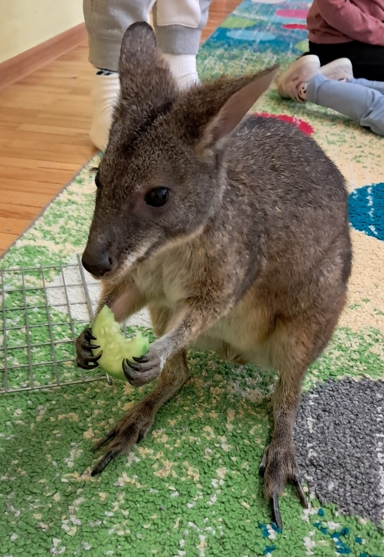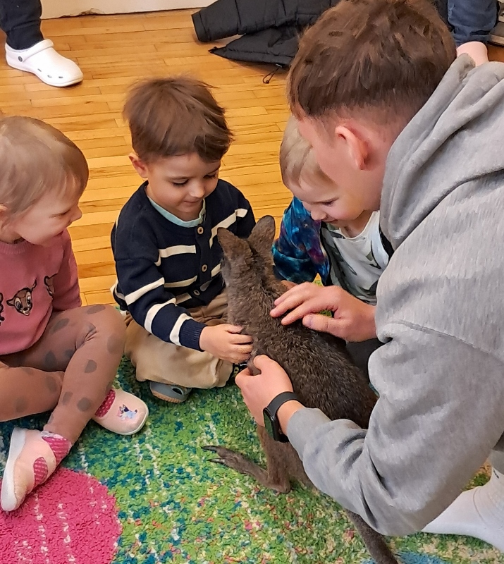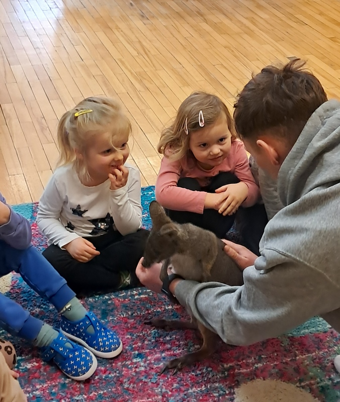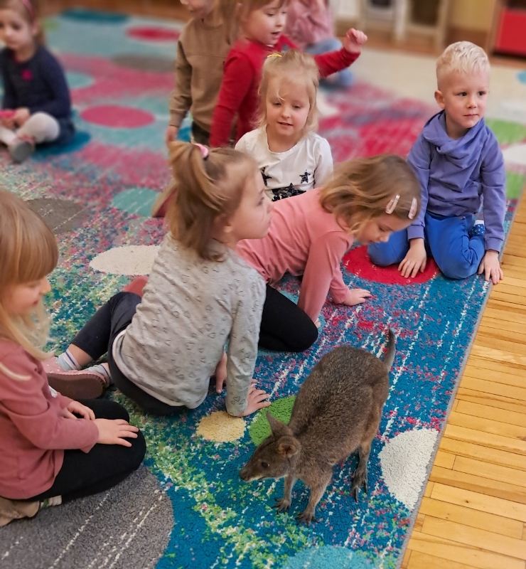 20 lutego w naszym przedszkolu pojawili się wyjątkowi goście - prawdziwy miniaturowy kangur z opiekunem. Wizyta tego przesympatycznego zwierzątka w naszej grupie to dla dzieci fascynująca, żywa lekcja przyrody. Przedszkolaki mogły z bliska zobaczyć egzotyczne zwierzę, poznać ciekawostki o jego diecie (np. lubi banany, marchewkę i ogórki u nas schrupał ogóreczka z wielkim apetytem, ogólnie żywi się owocami, warzywami i owadami) oraz zachowaniu (prowadzi nocny tryb życia),warunkach życia, skąd pochodzi, jakie ma przyzwyczajenia w naturalnym środowisku. Przedszkolaki mogły także pogłaskać go pod nadzorem opiekuna.