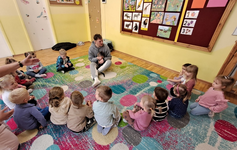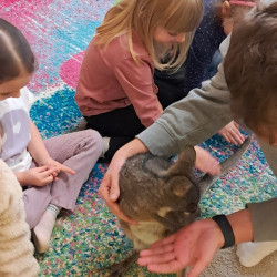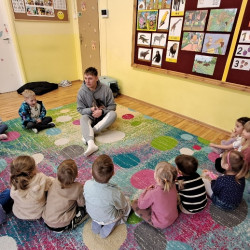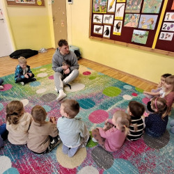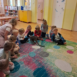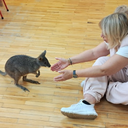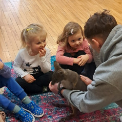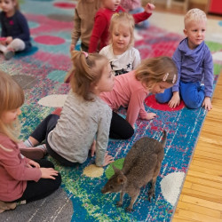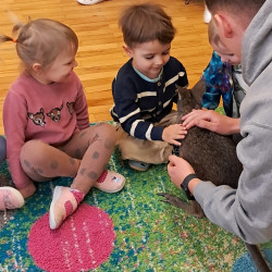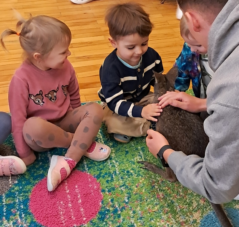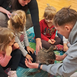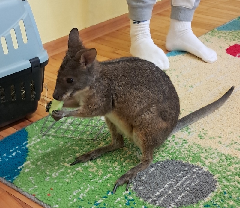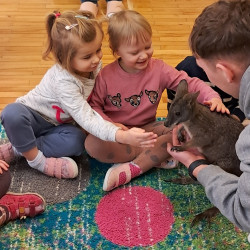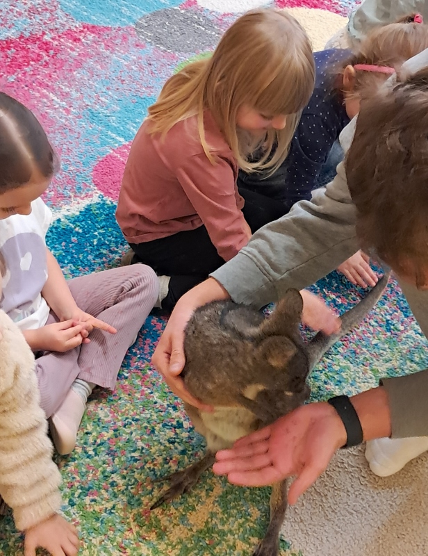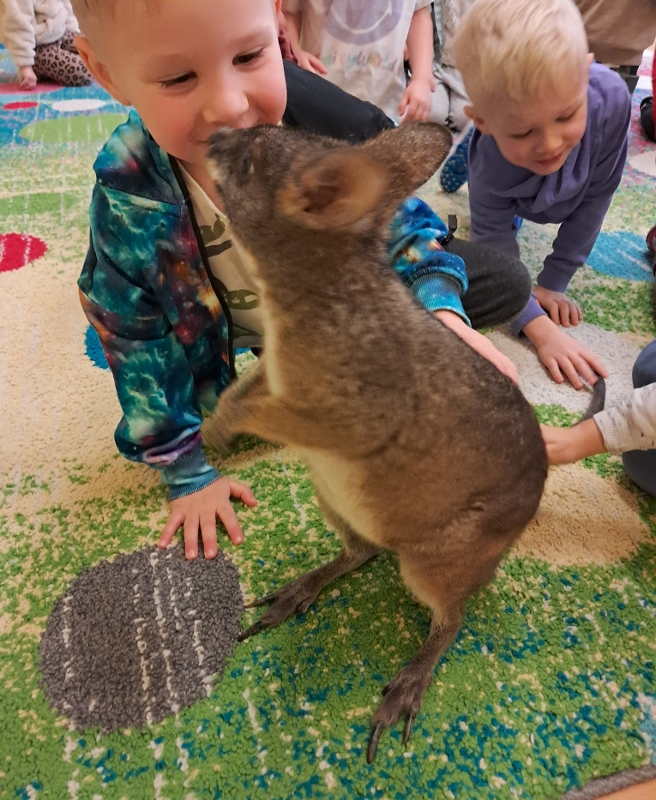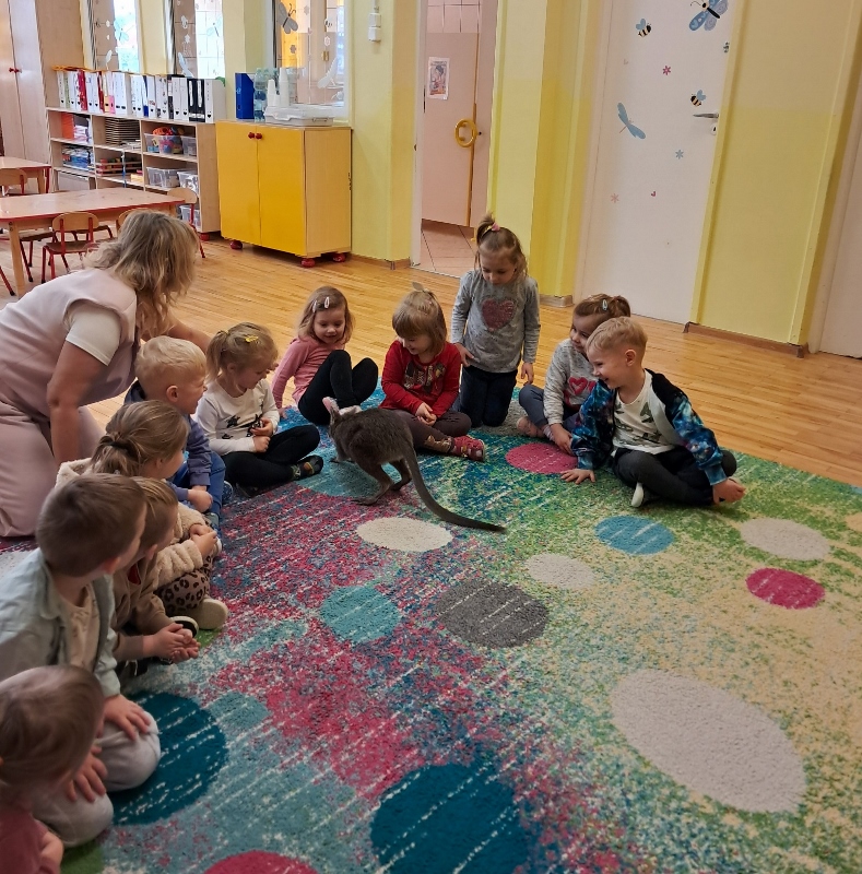 20 lutego w naszym przedszkolu pojawili się wyjątkowi goście - prawdziwy miniaturowy kangur z opiekunem. Wizyta tego przesympatycznego zwierzątka w naszej grupie to dla dzieci fascynująca, żywa lekcja przyrody. Przedszkolaki mogły z bliska zobaczyć egzotyczne zwierzę, poznać ciekawostki o jego diecie (np. lubi banany, marchewkę i ogórki u nas schrupał ogóreczka z wielkim apetytem, ogólnie żywi się owocami, warzywami i owadami) oraz zachowaniu (prowadzi nocny tryb życia),warunkach życia, skąd pochodzi, jakie ma przyzwyczajenia w naturalnym środowisku. Przedszkolaki mogły także pogłaskać go pod nadzorem opiekuna.