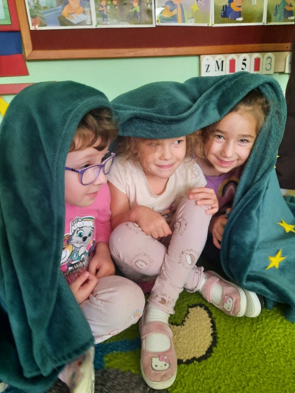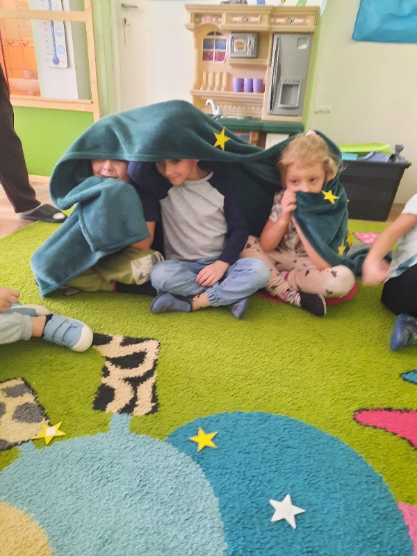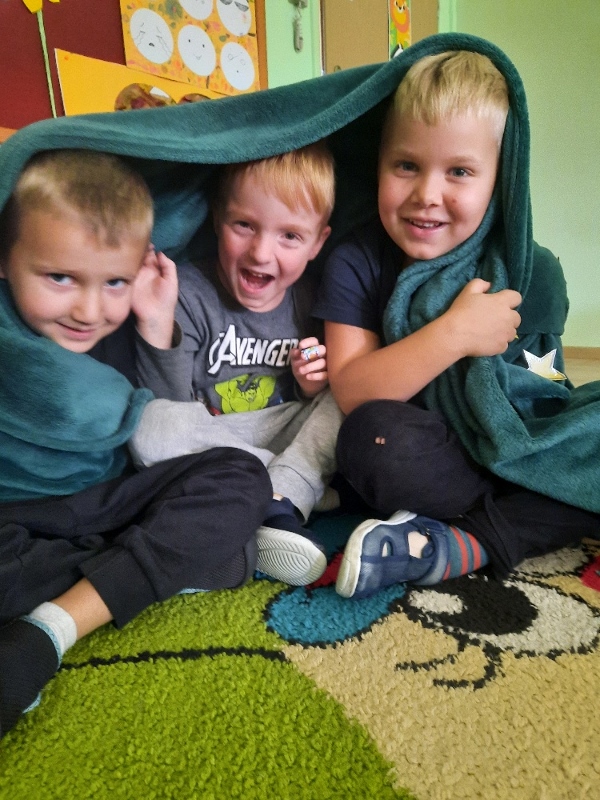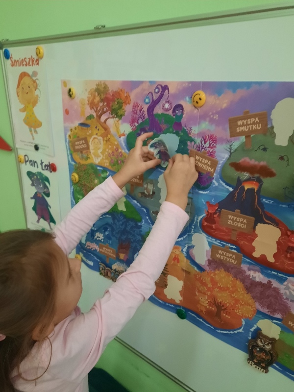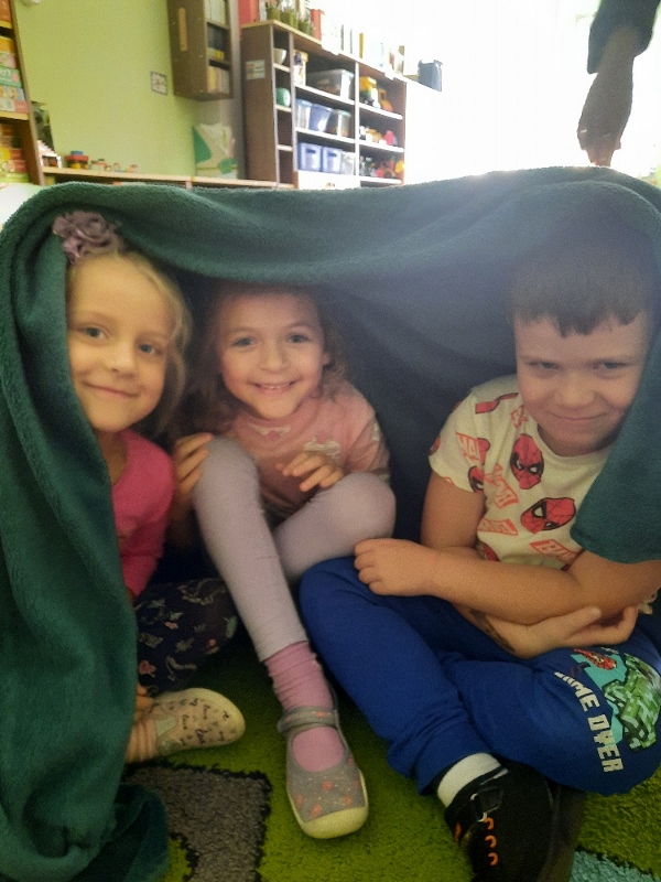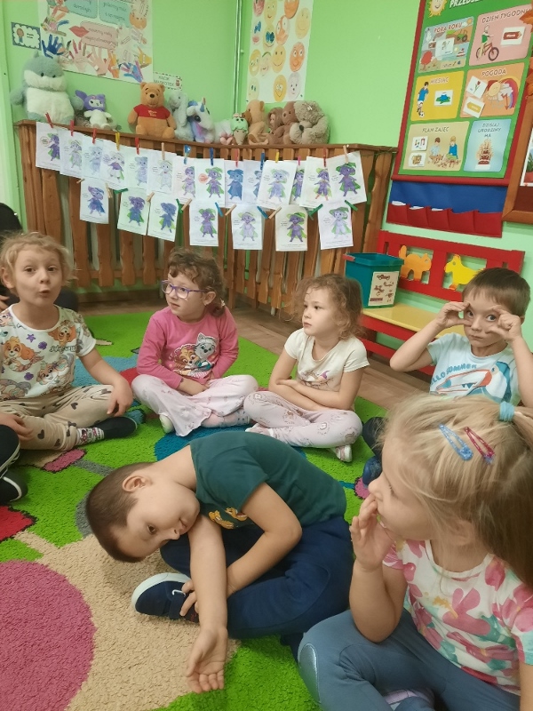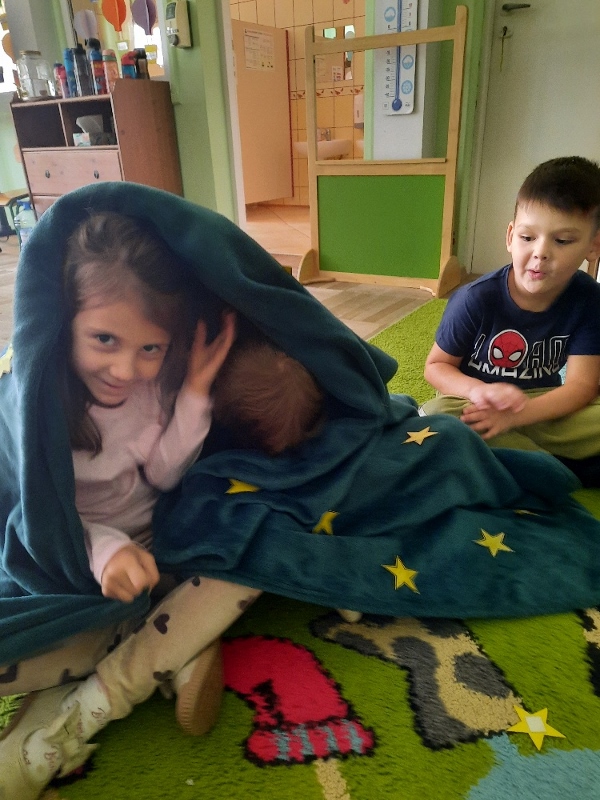 To już druga emocjonalna podróż w ramach projektu „Czuciaki z Krainy Emocji”. Tym razem Mądre Sowy poznały kolejnego czuciaka – Pana Łał, zamieszkującego krainę zdziwienia. Podczas zajęć wysłuchały opowiadania , w którym główny bohater - Leon spotyka Pana Łał. Przedszkolaki dowiedziały się czym jest zdziwienie i kiedy może się pojawić. Wiedzą, że jest to uczucie, które pojawia się nagle. Wtedy doświadczamy czegoś niespodziewanego, czegoś nowego. Mądre Sowy dowiedziały się w jaki sposób można sobie pomóc w takich sytuacjach. Jedną z propozycji była możliwość otulenia się magicznym, mięciutkim kocykiem ozdobionym złotymi gwiazdkami. Z ciekawością i z dużym zaangażowaniem uczestniczyły w zabawie badawczej „Spadające meteoryty”, i zabawach gestami „ Gdy mnie coś zaskoczy”, które pozwoliły doświadczać dzieciom różnych form zdziwienia. W ciągu dnia utrwalaliśmy słowa i melodię piosenki „Kraina emocji”. Z wielką przyjemnością przedszkolaki kolorowały sylwetę Pana Łał . Na zakończenie zajęć Pan Łał wrócił na Wyspę Zdziwienia, a my jeszcze długo rozmawialiśmy o uczuciach i bawiliśmy się wykorzystując w zabawie magiczny kocyk.