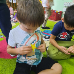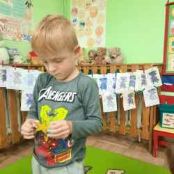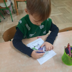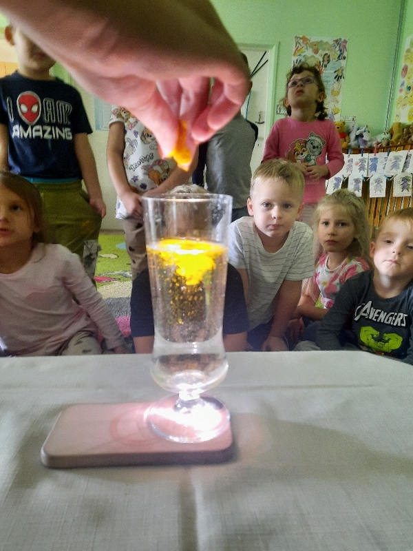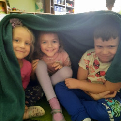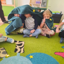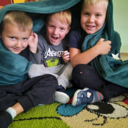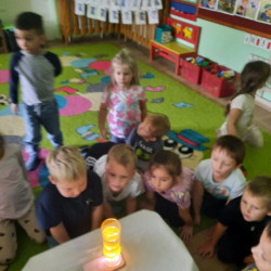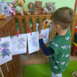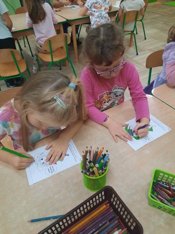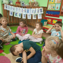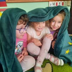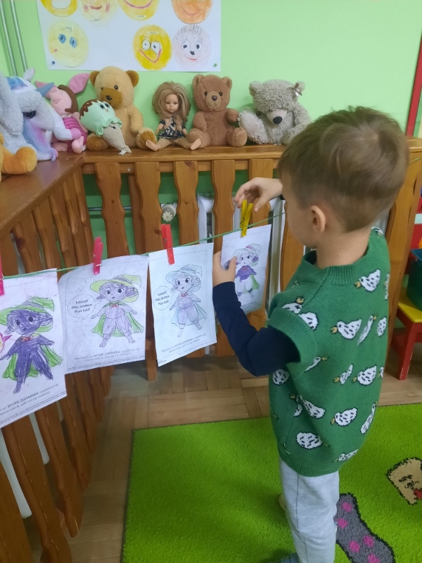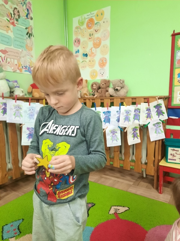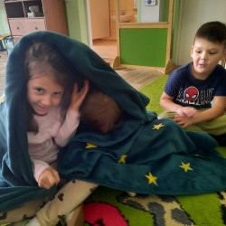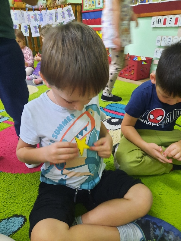 To już druga emocjonalna podróż w ramach projektu „Czuciaki z Krainy Emocji”. Tym razem Mądre Sowy poznały kolejnego czuciaka – Pana Łał, zamieszkującego krainę zdziwienia. Podczas zajęć wysłuchały opowiadania , w którym główny bohater - Leon spotyka Pana Łał. Przedszkolaki dowiedziały się czym jest zdziwienie i kiedy może się pojawić. Wiedzą, że jest to uczucie, które pojawia się nagle. Wtedy doświadczamy czegoś niespodziewanego, czegoś nowego. Mądre Sowy dowiedziały się w jaki sposób można sobie pomóc w takich sytuacjach. Jedną z propozycji była możliwość otulenia się magicznym, mięciutkim kocykiem ozdobionym złotymi gwiazdkami. Z ciekawością i z dużym zaangażowaniem uczestniczyły w zabawie badawczej „Spadające meteoryty”, i zabawach gestami „ Gdy mnie coś zaskoczy”, które pozwoliły doświadczać dzieciom różnych form zdziwienia. W ciągu dnia utrwalaliśmy słowa i melodię piosenki „Kraina emocji”. Z wielką przyjemnością przedszkolaki kolorowały sylwetę Pana Łał . Na zakończenie zajęć Pan Łał wrócił na Wyspę Zdziwienia, a my jeszcze długo rozmawialiśmy o uczuciach i bawiliśmy się wykorzystując w zabawie magiczny kocyk.