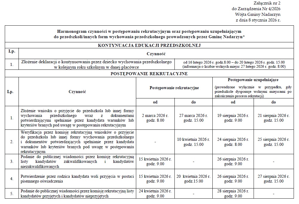 informujemy, że rekrutacja do Publicznego Przedszkola w Młochowie na rok szkolny 2026/27 rozpocznie się zgodnie z harmonogramem stanowiącymi załącznik Nr 2 do Zarządzenia Nr 4/2026 z dnia 8 stycznia 2026r.