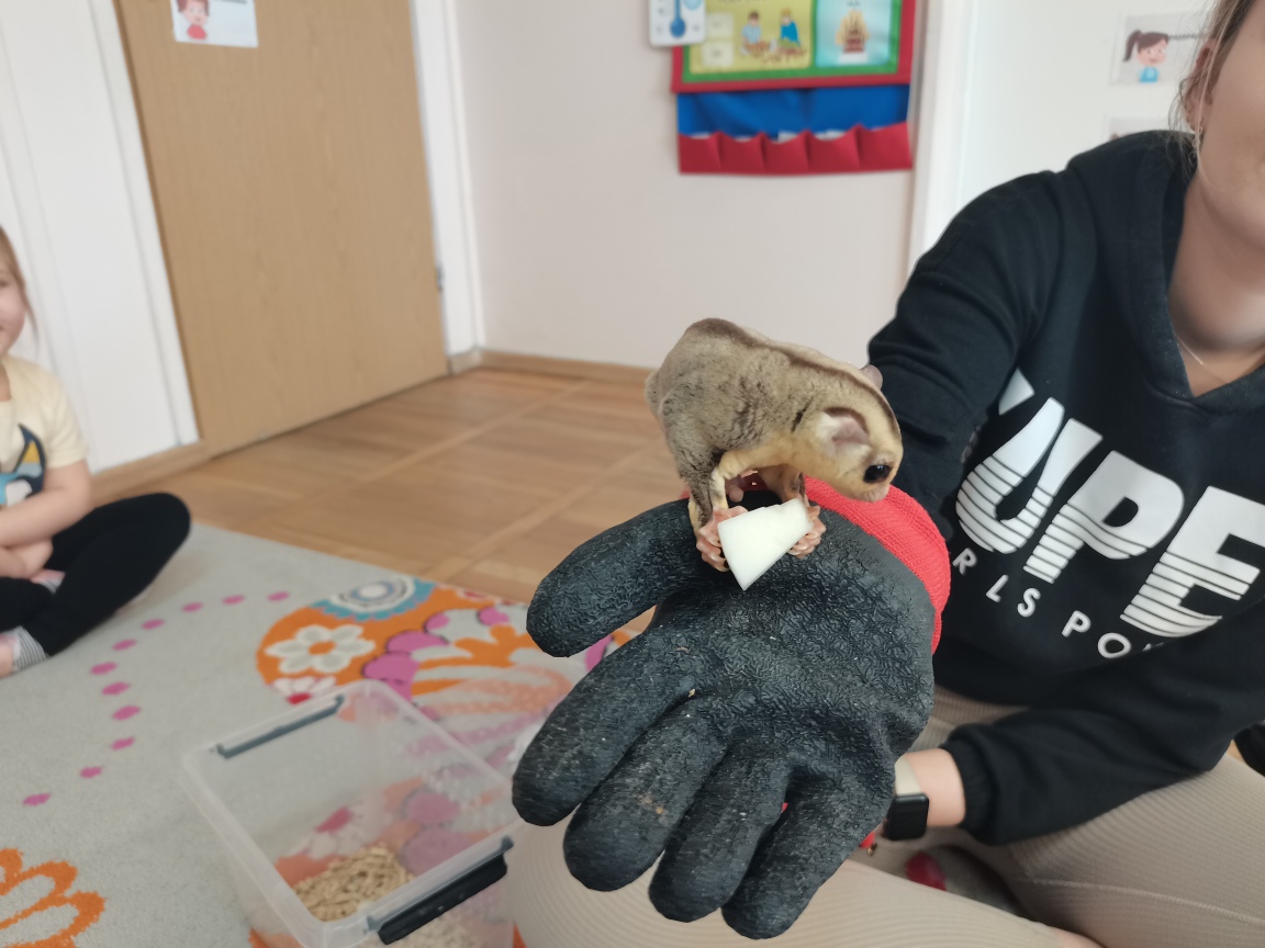 Tym razem wraz z opiekunką odwiedziły nas: lotopałanka – latająca wiewiórka pochodząca z Australii oraz jeż. Dzieci z wielkim zainteresowaniem obserwowały i słuchały. Mogły zobaczyć