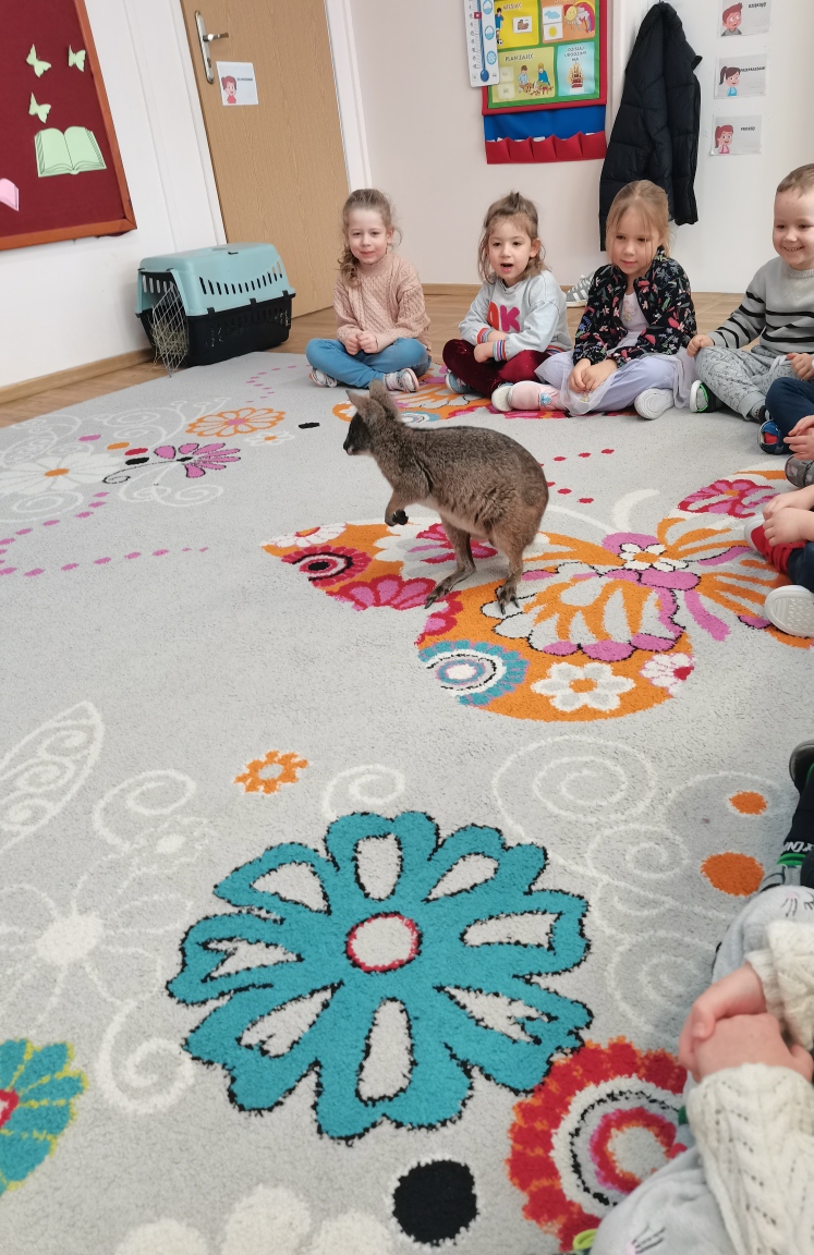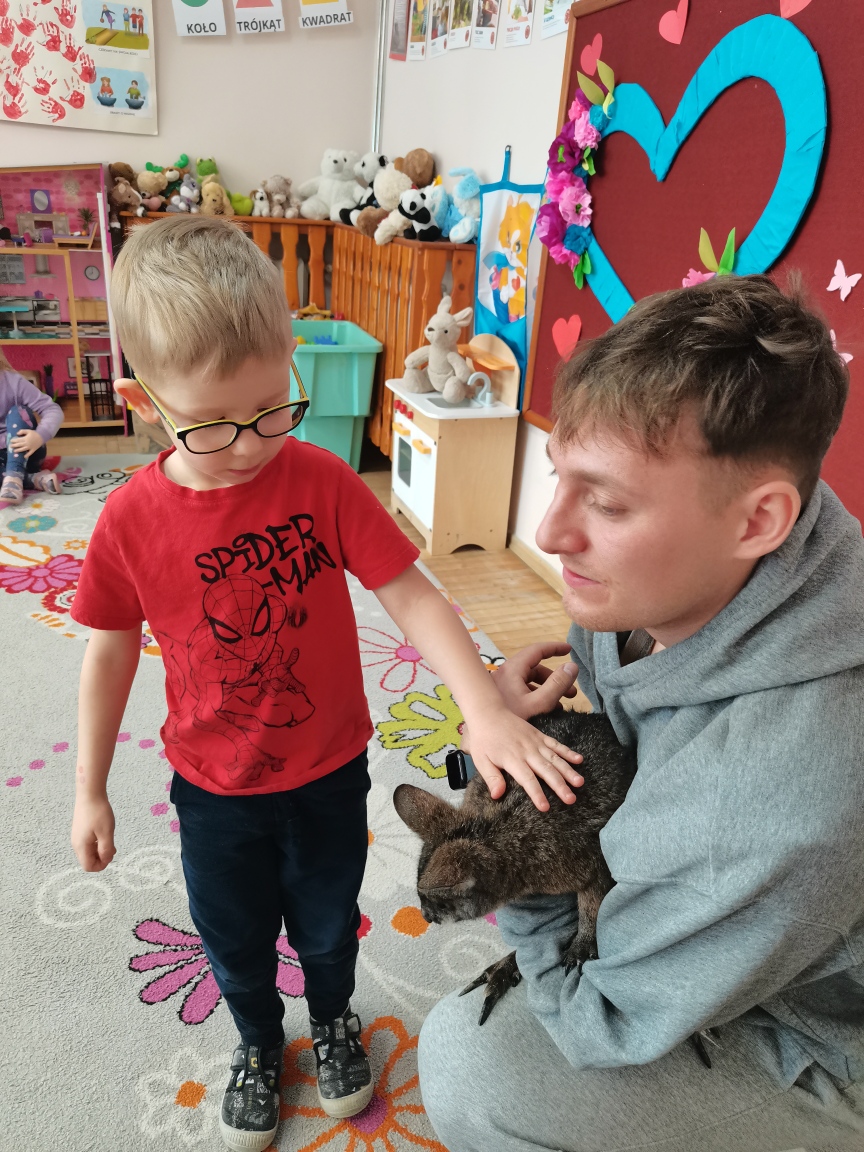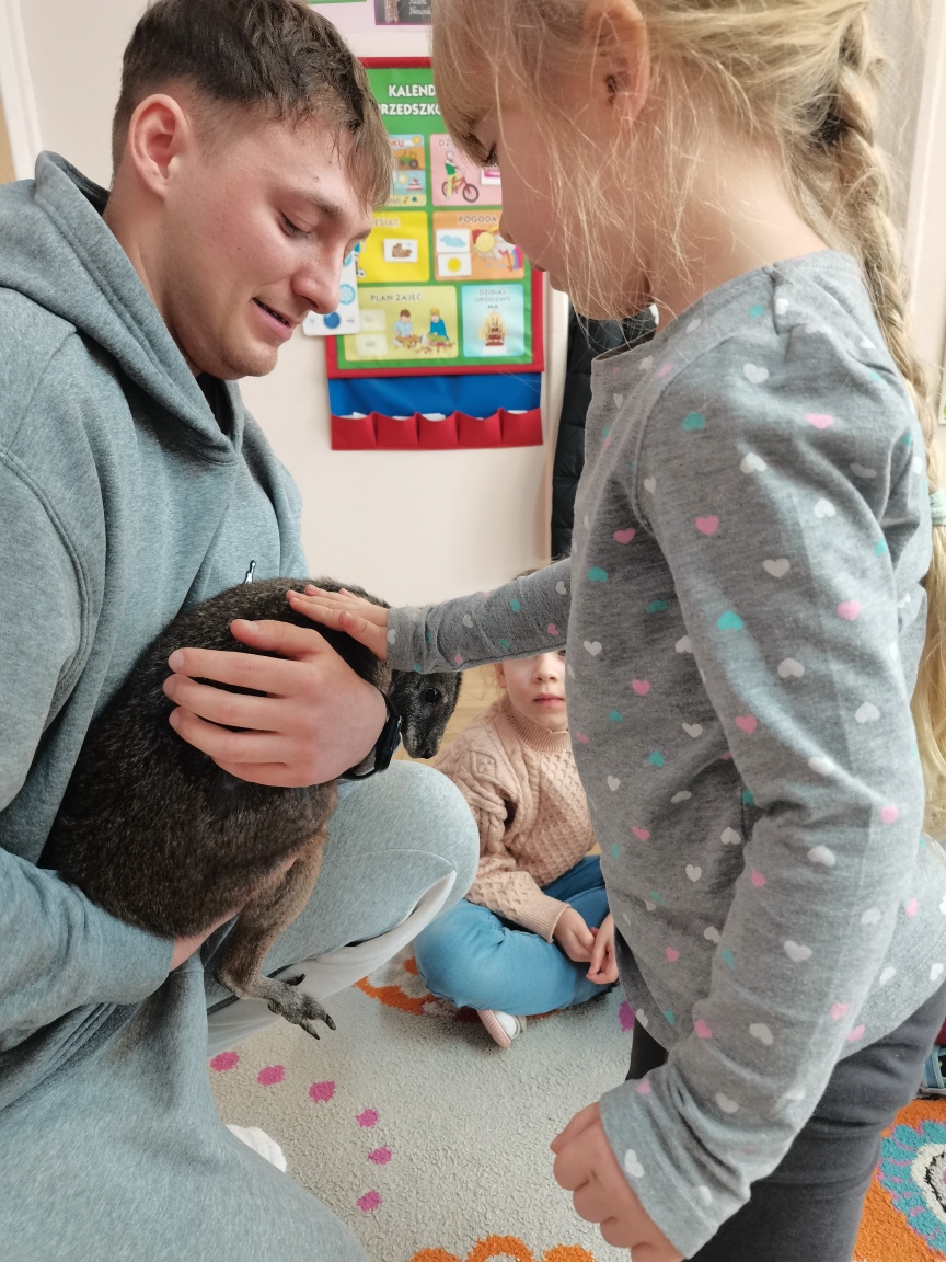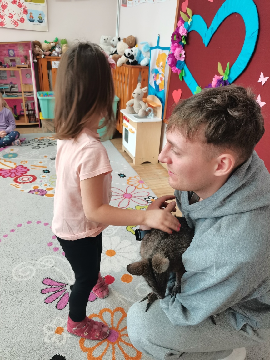 Wizyta żywego miniaturowego torbacza rasy pademelon była dla dzieci fascynującą, żywą lekcją przyrody. Przedszkolaki miały okazję zobaczyć egzotyczne zwierzę z bliska, dowiedzieć się o kraju pochodzenia, o środowisku życia, o jego zwyczajach, zapytać o to czym się żywi, delikatnie pogłaskać i poobserwować jak się porusza. Taki niecodzienny kontakt ze zwierzęciem uczy dzieci empatii, delikatności i szacunku do innych istot. Pomaga również pokonać nieśmiałość i lęk.