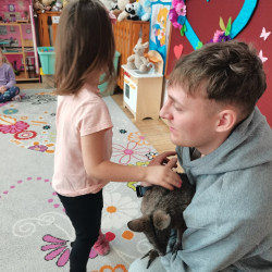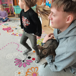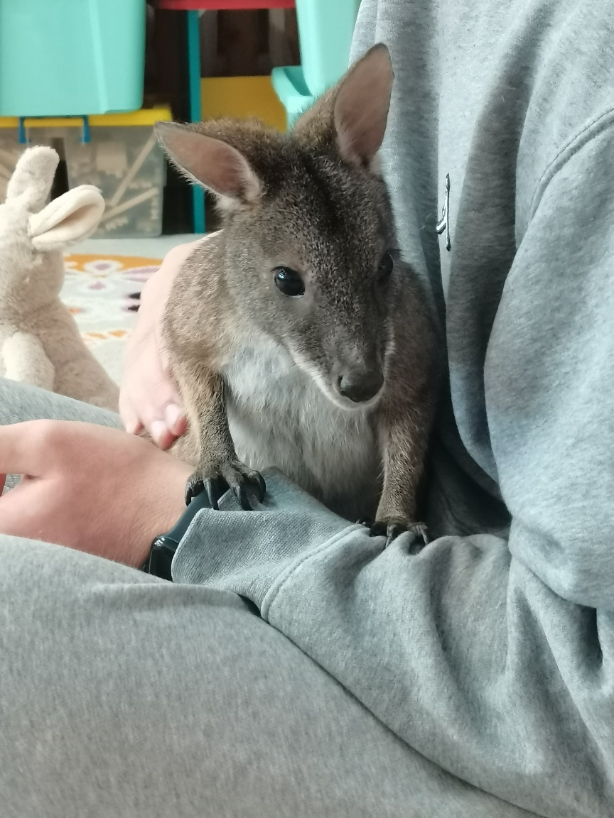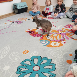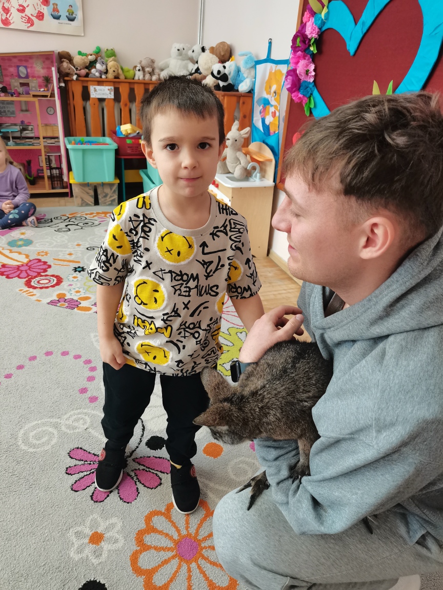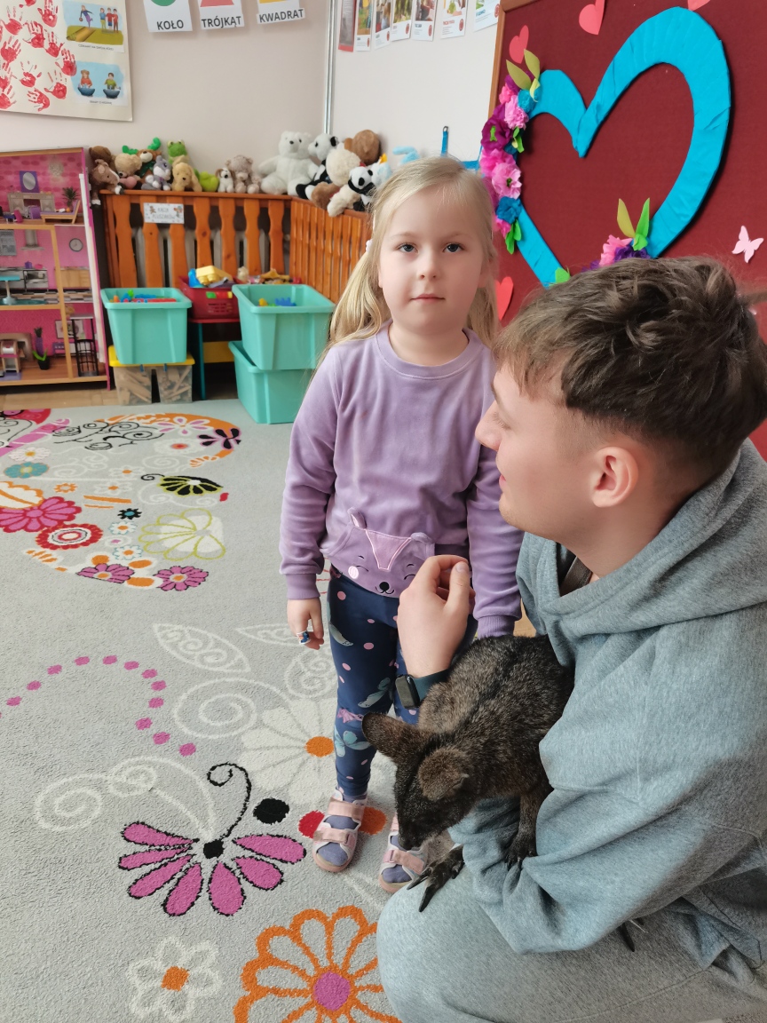Wizyta żywego miniaturowego torbacza rasy pademelon była dla dzieci fascynującą, żywą lekcją przyrody. Przedszkolaki miały okazję zobaczyć egzotyczne zwierzę z bliska, dowiedzieć się o kraju pochodzenia, o środowisku życia, o jego zwyczajach, zapytać o to czym się żywi, delikatnie pogłaskać i poobserwować jak się porusza. Taki niecodzienny kontakt ze zwierzęciem uczy dzieci empatii, delikatności i szacunku do innych istot. Pomaga również pokonać nieśmiałość i lęk.