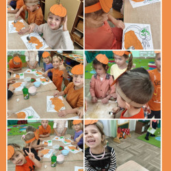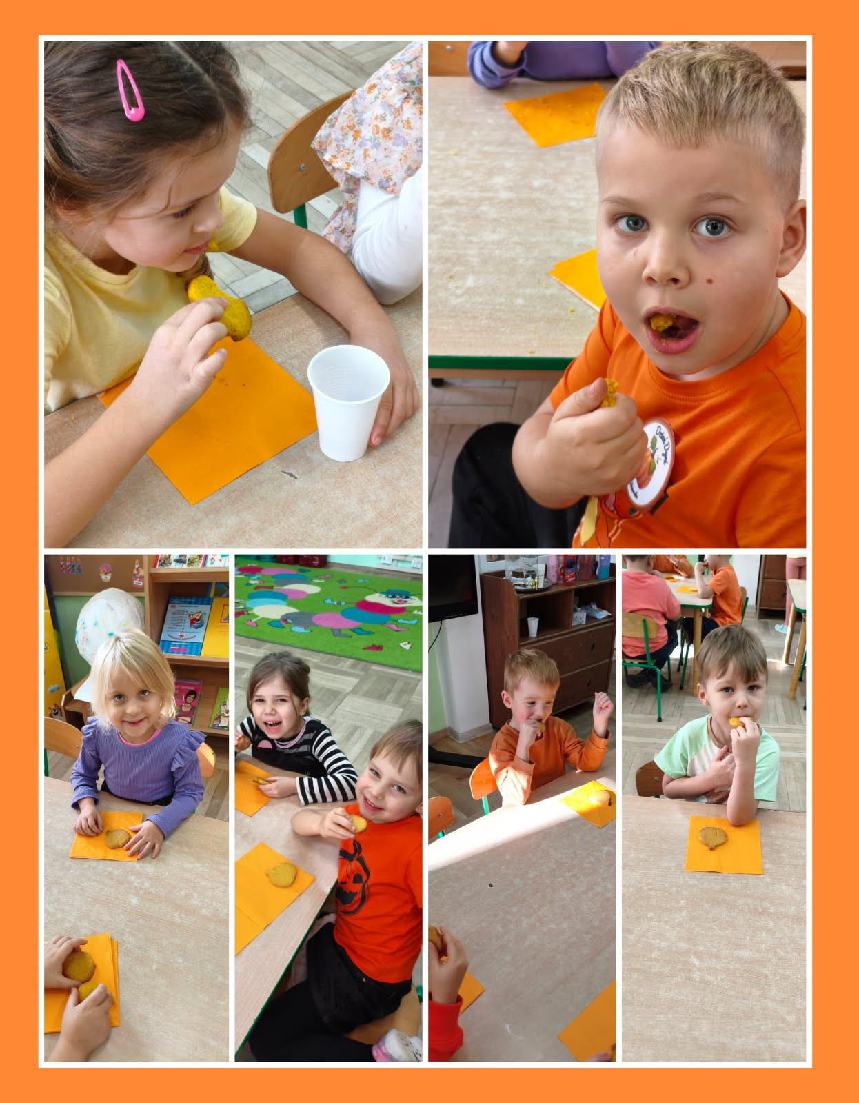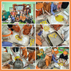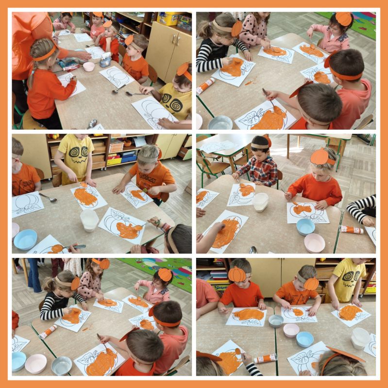 Wzięliśmy udział w zabawach z udziałem dyni: slalomie dyniowym, dyniowych zawodach, skokach przez dynię oraz ziarnko do ziarnka. Dzieci wykonały również piękne prace plastyczne z rosnącej farby i upiekły przepyszne ciasteczka w kształcie dyń.