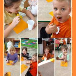 Uczestniczyliśmy w zajęciach, podczas których poznaliśmy bardzo zdrowe i urodziwe warzywo jakim jest dynia. Mogliśmy je liczyć, mierzyć i ważyć. „Dzień Dyni” pozwolił nam też poznać wielką różnorodność dyń i wzbogacił naszą wiedzę na ich temat. (Bardz dziękujemy Rodzicom za przyniesione wcześniej na wystawę dynie, które teraz mogliśmy wykorzystać, a także za przygotowanie pomarańczowych ubranek).
