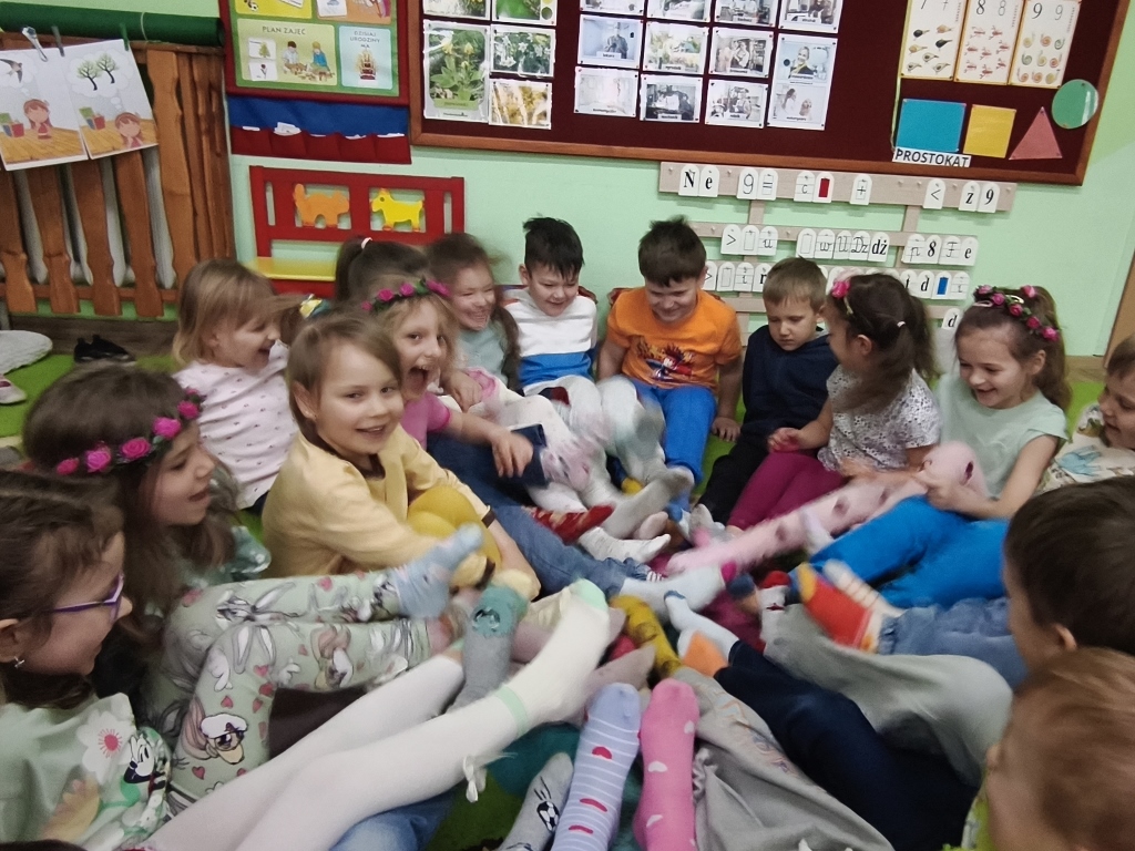 W piątek 20 marca odbył się w naszym przedszkolu Dzień Kolorowej Skarpetki. Wszystkie dzieci i pracownicy przedszkola na znak solidarności z osobami z Zespołem Downa założyli kolorowe skarpetki. Przedszkolaki z grupy Mądre Sowy oglądały i opowiadały o swoich skarpetkach. Uważnie wysłuchały informacji co to jest za dzień. Kolorowe skarpetki nosimy na znak solidarności i zwrócenia szczególnej uwagi na osoby z dodatkowym chromosomem, bowiem 21 marca (w sobotę) na całym świecie obchodzony jest Światowy Dzień Osób z Zespołem Downa.