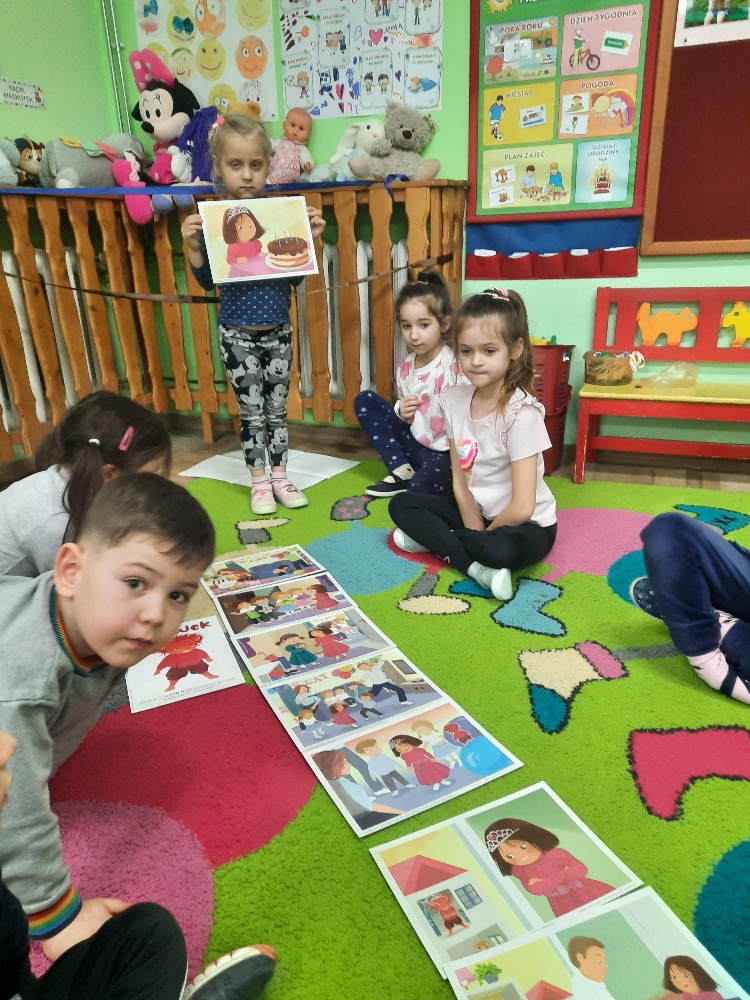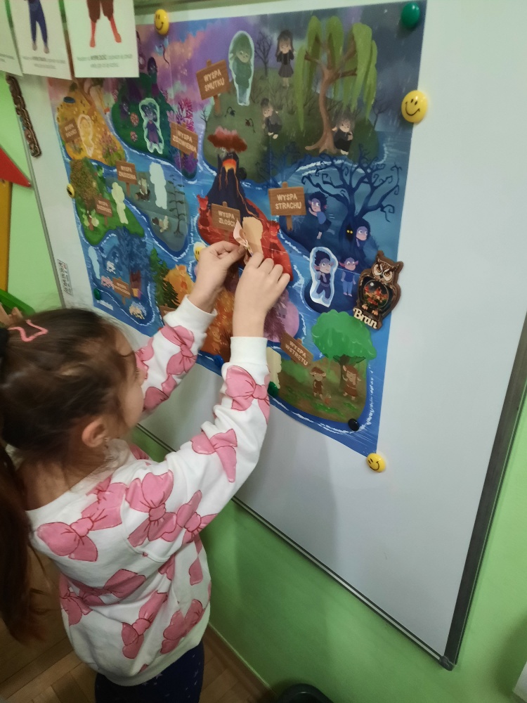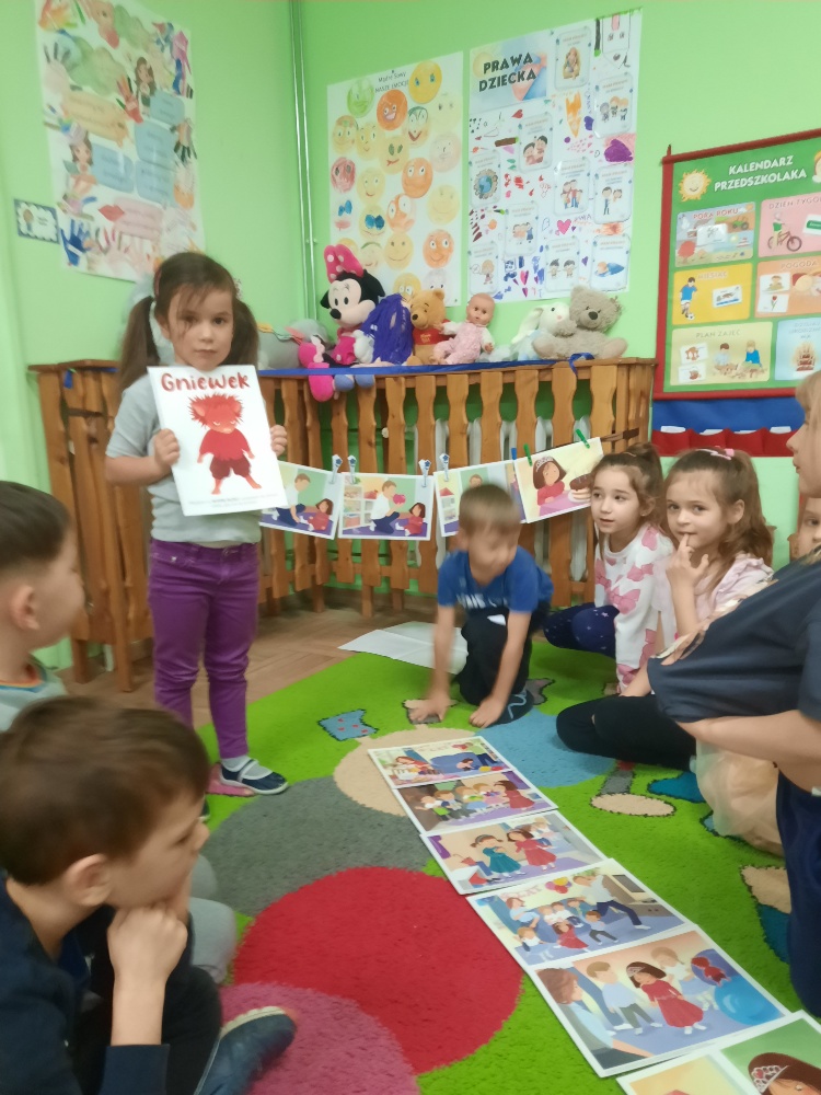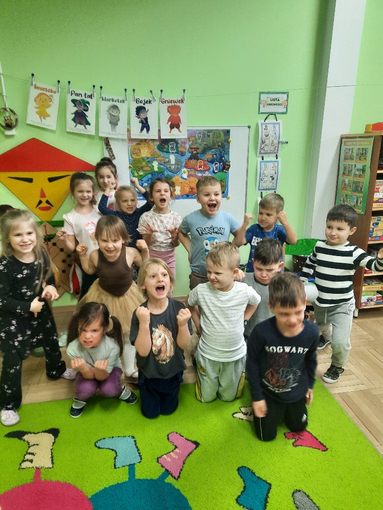 Dzieci z grupy Mądre Sowy poznały kolejnego bohatera innowacji „Czuciaki z krainy Emocji. W czwartek odwiedziły wyspę złości zamieszkałą przez Gniewka. Podczas zajęć wysłuchały opowiadania o urodzinach Martynki, podczas których pojawia się Gniewek. Stworek pokazał Martynce, że złość nie jest zła. Ważne jest żeby wyrażać ją w sposób bezpieczny i nie pozwolić aby ta złość w nas narastała. Gniewek nauczył dzieci jak panować nad wybuchami emocji pokazując im kilka sposobów na rozładowanie złości. Mądre Sowy wykonały doświadczenie z balonem – „Kiedy złość w nas rośnie...- podawały przykłady sytuacji, które wywołują w nich złość, w międzyczasie balon nadmuchiwany był za każdym razem, gdy kolejne dziecko podawało propozycję. Ćwiczenie trwało do czasu aż balon pękł. Kolejnym ćwiczeniem było upuszczanie powietrza z balonu podczas podawania sposobów radzenia sobie ze złością. Dzieci obserwowały jak zmniejsza się ilość powietrza w balonie, a to znaczy, że napięcie się zmniejszyło i dzieci uporały się ze złością. Wykonaliśmy również ćwiczenie z wulkanem. Wspólnie ułożyły historyjkę obrazkową i pokolorowały Gniewka. Na koniec Gniewek wrócił na wyspę złości, a my wiemy już w jaki sposób radzić sobie ze złością nie raniąc innych.