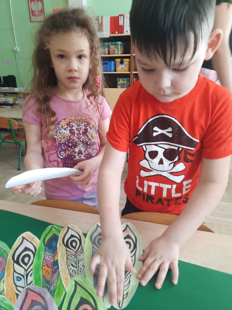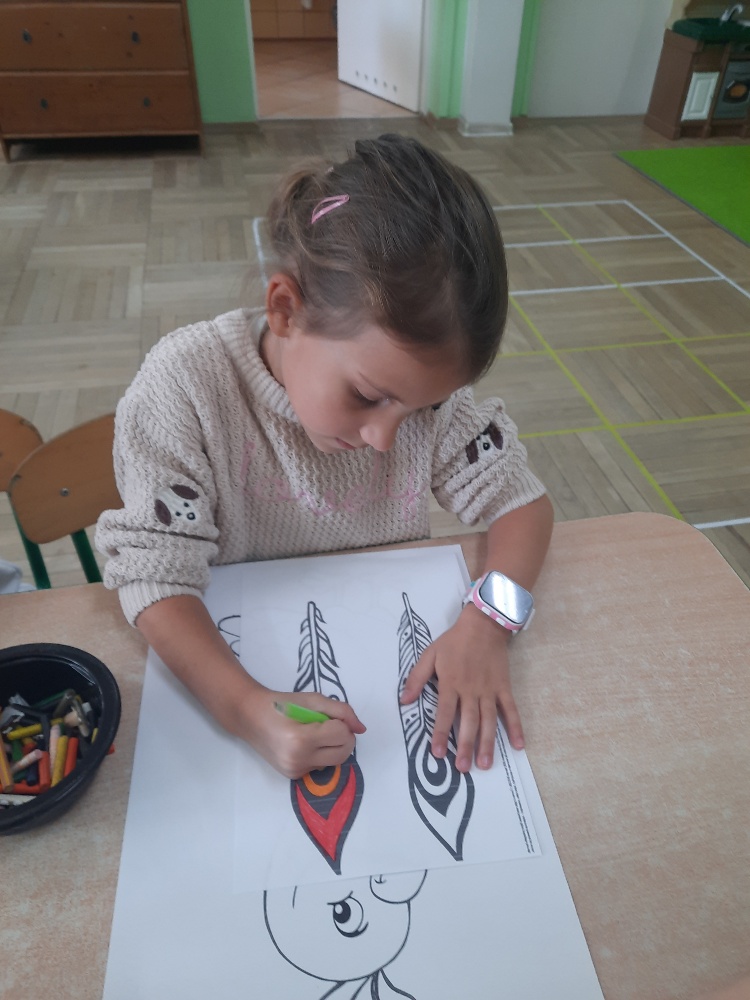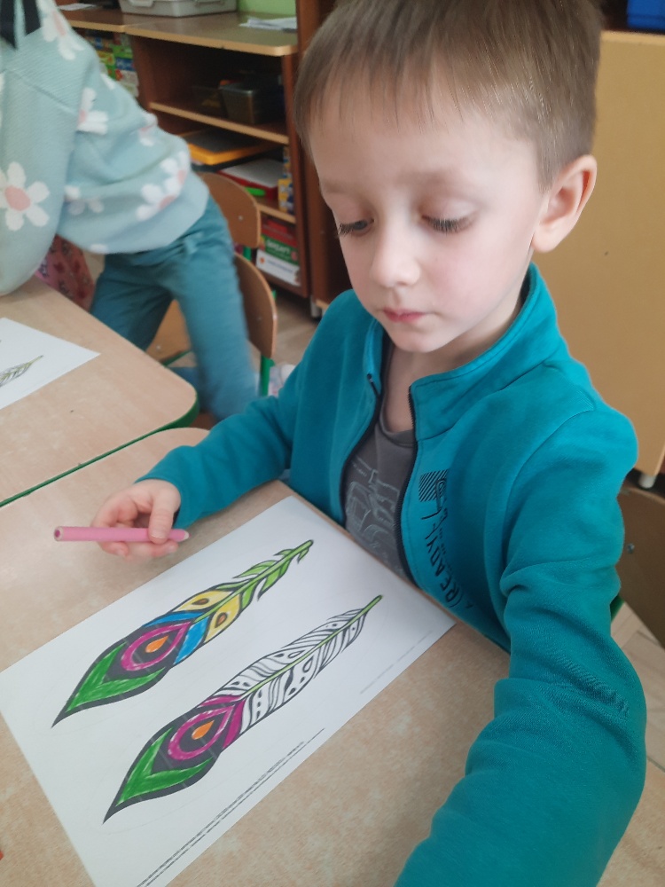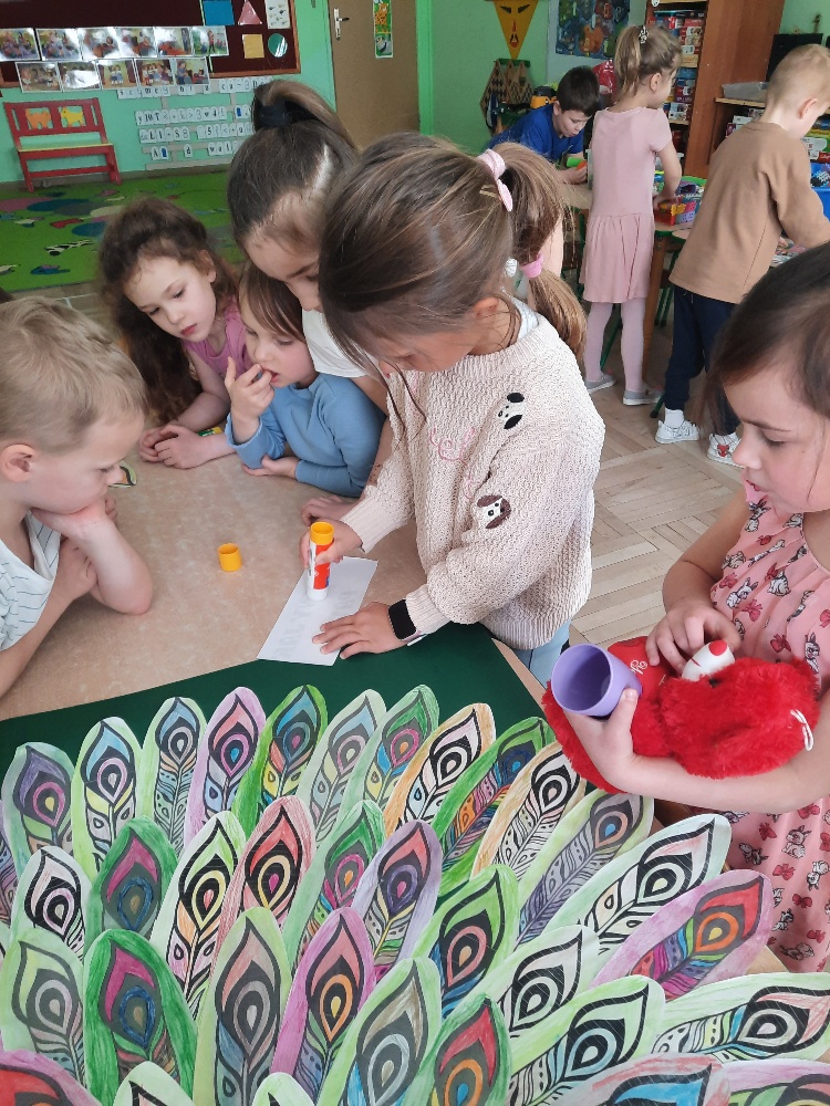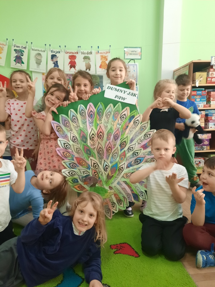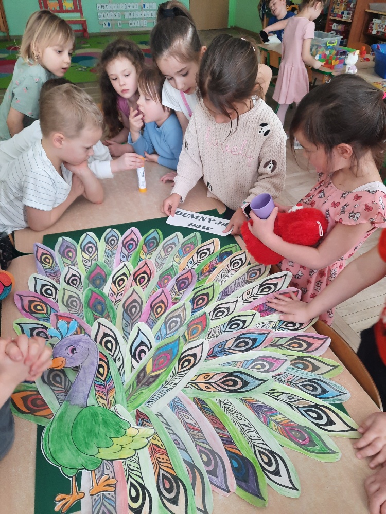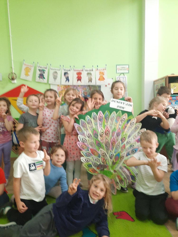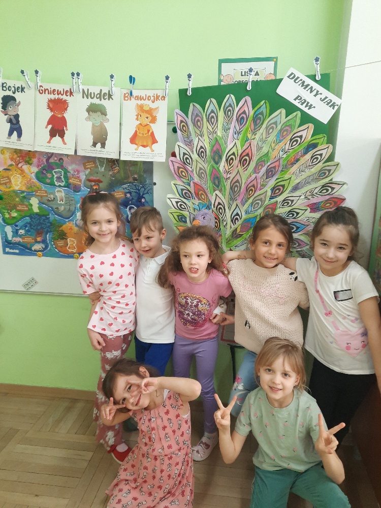 Tym razem celem naszej wyprawy była Wyspa Dumy. Dzieci wysłuchały opowiadania o Brawojce z wyspa dumy. Duma to uczucie które pojawia się , kiedy osiągamy coś, z czego jesteśmy zadowoleni, np. kiedy nauczyliśmy się nowej piosenki, czy też namalowaliśmy ładny rysunek. Duma sprawia, że czujemy się szczęśliwi i pełni radości z tego, co udało nam się osiągnąć, motywuje nas do podejmowania kolejnych wyzwań. Mądre Sowy po wysłuchaniu opowiadania układały historyjkę obrazkową wg kolejności zdarzeń i rozmawiały na temat opowiadania. Brały udział w zabawie integracyjnej „Złota korona”. Zabawa rozpoczynała się słowami: jestem dumna z tego, że….. Dziecko, które miało koronę na głowie kończyło zdanie np. jestem dumna z tego, że np. szybko uczę się nowych piosenek. Podczas zabawy dzieci przekazywały sobie koronę w kole. Dzieci, które miały problem z wypowiadaniem formuły zawsze mogły liczyć na wsparcie kolegów. Kolejna zabawa nosiła tytuł” Pokaż swój talent”. W zabawie tej dzieci poruszały się w rytmie muzyki, a na przerwę w muzyce dziecko, które stanęło w obręczy z koroną prezentowało dowolną umiejętność ruchem np. pajacyki, mostek, stanie na jednej nodze….Wcześniej dzieci wypowiadały formułę: Złota korona na głowie twej,pokaż swój talent i pozbądź się jej. Zabawa trwała do ostatniego uczestnika. Poznały powiedzenie: Dumny jak paw i w grupach wykonały pracę plastyczną. Nie zabrakło też umieszczenia Brawojki na wyspie dumy i kolorowaniu sylwety Brawojki. Realizacja wyzwania była okazją do zaprezentowania swoich talentów i podziwiania talentów kolegów i koleżanek z grupy.