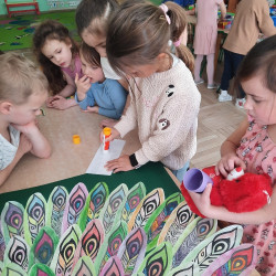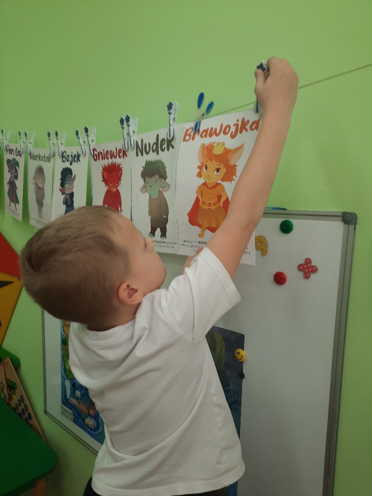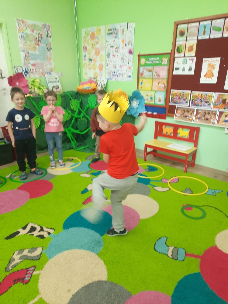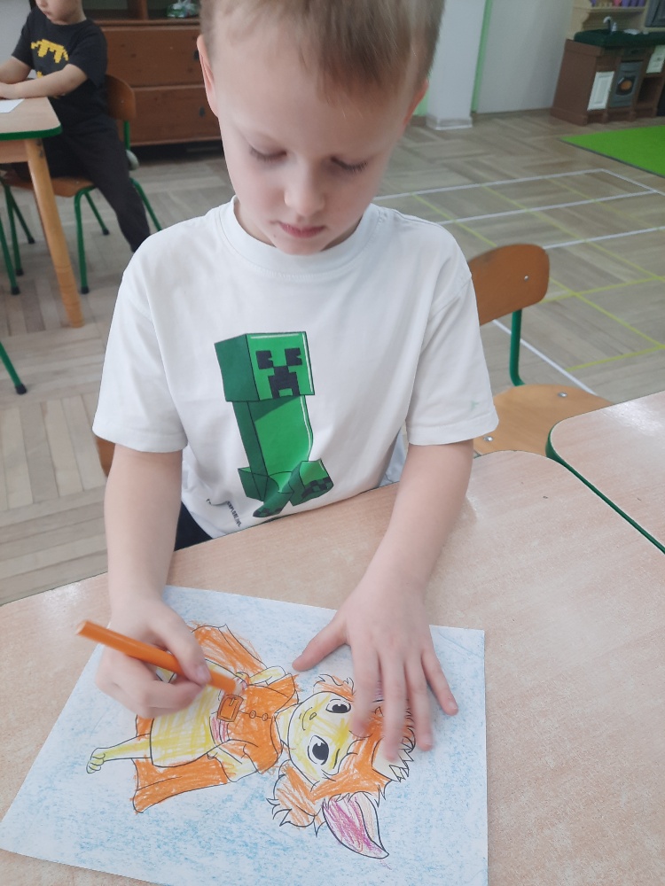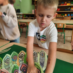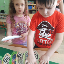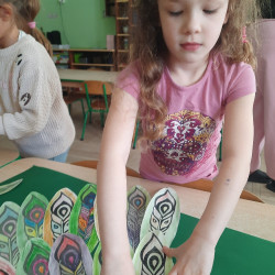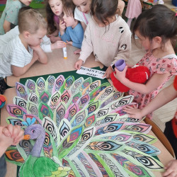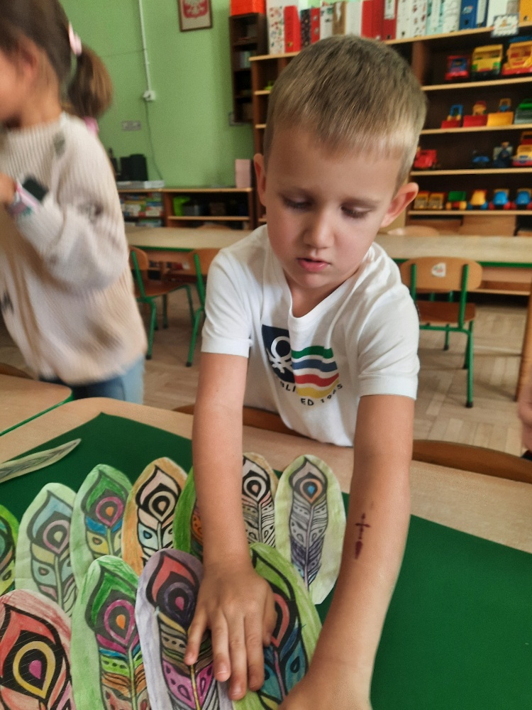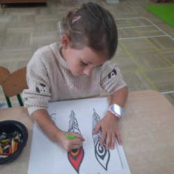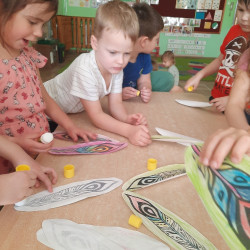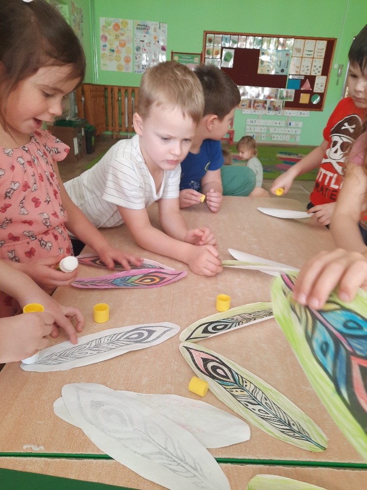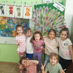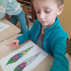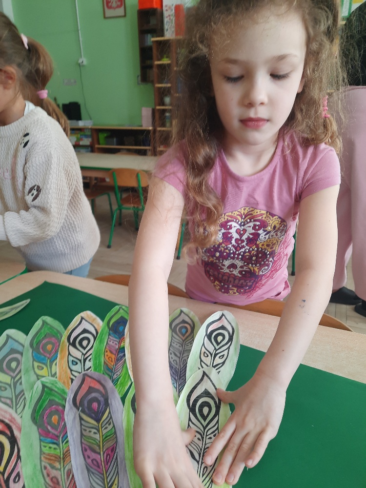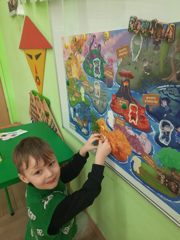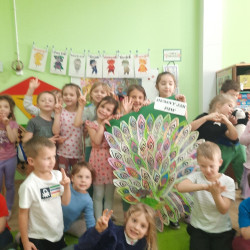 Tym razem celem naszej wyprawy była Wyspa Dumy. Dzieci wysłuchały opowiadania o Brawojce z wyspa dumy. Duma to uczucie które pojawia się , kiedy osiągamy coś, z czego jesteśmy zadowoleni, np. kiedy nauczyliśmy się nowej piosenki, czy też namalowaliśmy ładny rysunek. Duma sprawia, że czujemy się szczęśliwi i pełni radości z tego, co udało nam się osiągnąć, motywuje nas do podejmowania kolejnych wyzwań. Mądre Sowy po wysłuchaniu opowiadania układały historyjkę obrazkową wg kolejności zdarzeń i rozmawiały na temat opowiadania. Brały udział w zabawie integracyjnej „Złota korona”. Zabawa rozpoczynała się słowami: jestem dumna z tego, że….. Dziecko, które miało koronę na głowie kończyło zdanie np. jestem dumna z tego, że np. szybko uczę się nowych piosenek. Podczas zabawy dzieci przekazywały sobie koronę w kole. Dzieci, które miały problem z wypowiadaniem formuły zawsze mogły liczyć na wsparcie kolegów. Kolejna zabawa nosiła tytuł” Pokaż swój talent”. W zabawie tej dzieci poruszały się w rytmie muzyki, a na przerwę w muzyce dziecko, które stanęło w obręczy z koroną prezentowało dowolną umiejętność ruchem np. pajacyki, mostek, stanie na jednej nodze….Wcześniej dzieci wypowiadały formułę: Złota korona na głowie twej,pokaż swój talent i pozbądź się jej. Zabawa trwała do ostatniego uczestnika. Poznały powiedzenie: Dumny jak paw i w grupach wykonały pracę plastyczną. Nie zabrakło też umieszczenia Brawojki na wyspie dumy i kolorowaniu sylwety Brawojki. Realizacja wyzwania była okazją do zaprezentowania swoich talentów i podziwiania talentów kolegów i koleżanek z grupy.