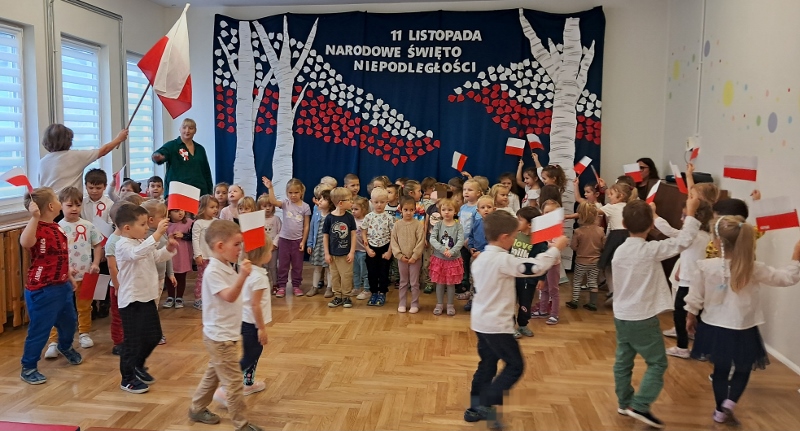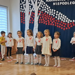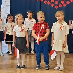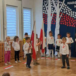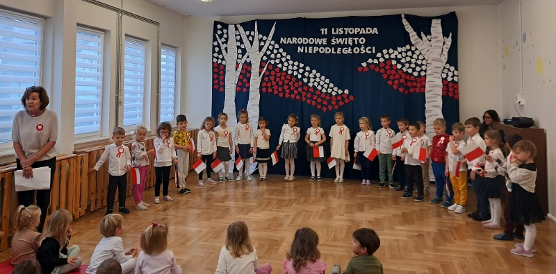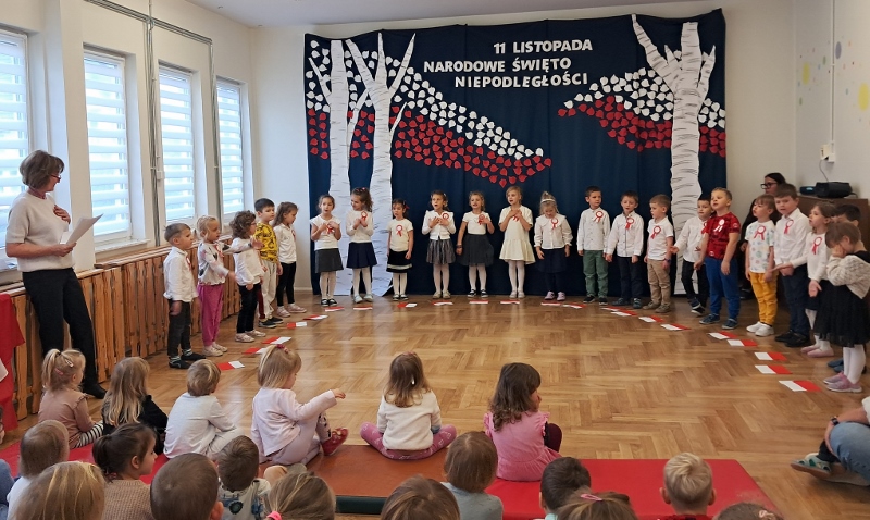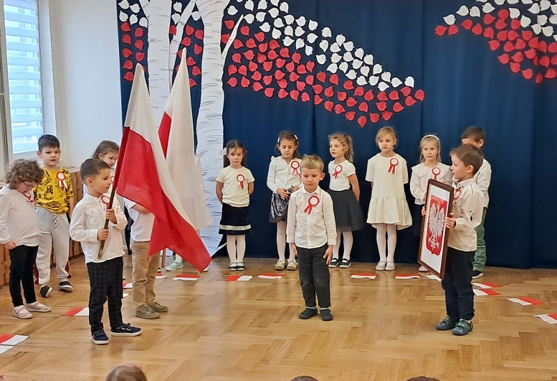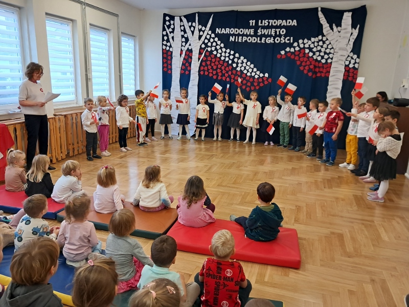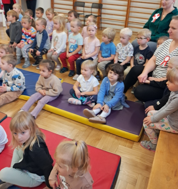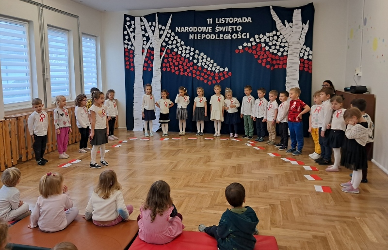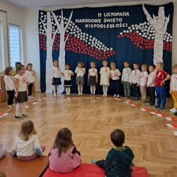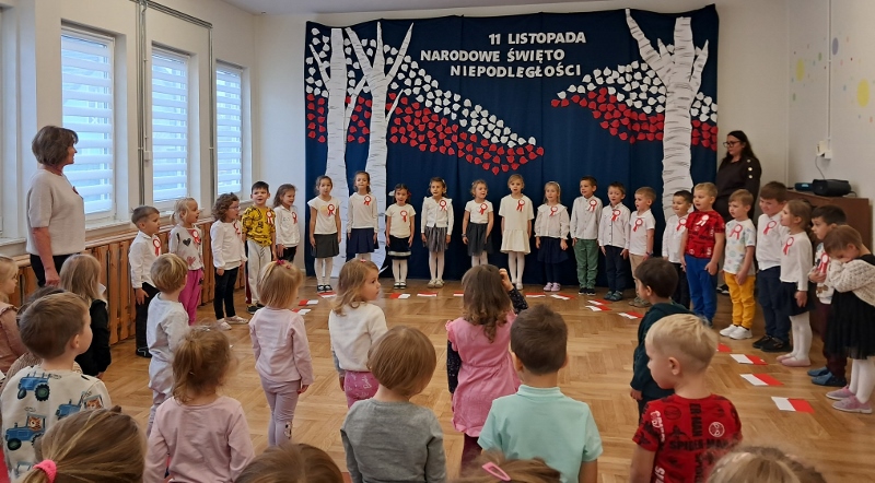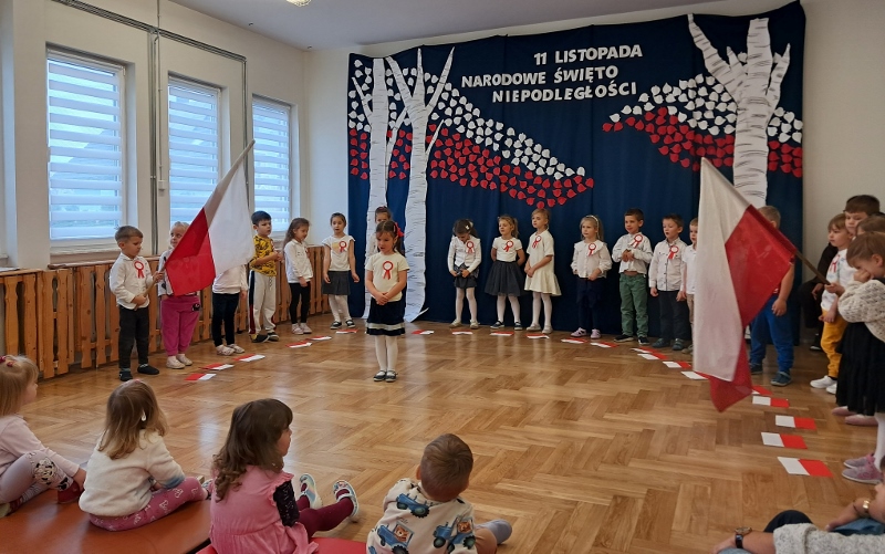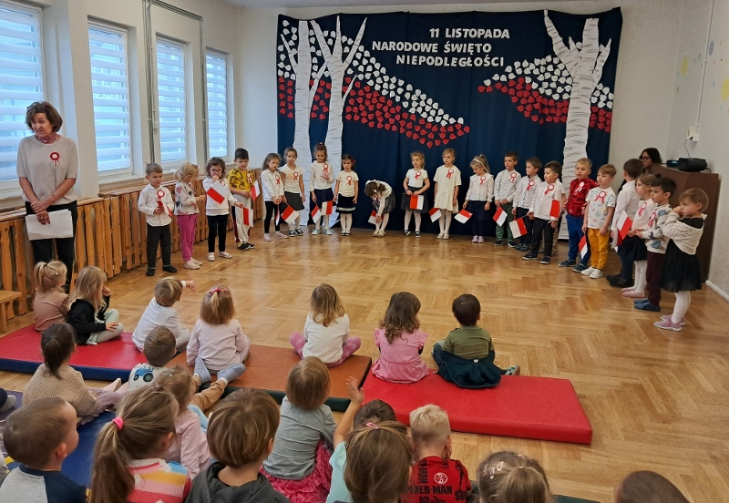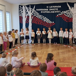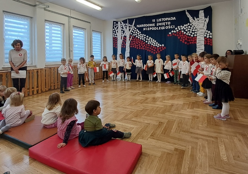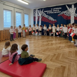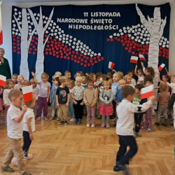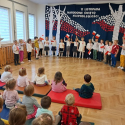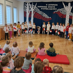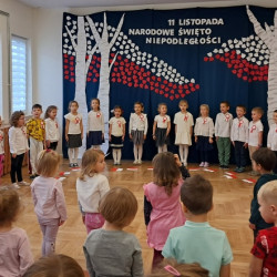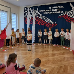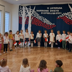 Przedszkolaki z grupy Mądre Sowy przygotowały i zaprosiły 12 listopada młodszych kolegów z grupy Pszczółki i Biedronki na uroczystą akademię z okazji 107 rocznicy odzyskania przez Polskę niepodległości. W odświętnych, galowych strojach mali patrioci z wielką dumą i powagą odśpiewali „Mazurek Dąbrowskiego" ( wszystkie cztery zwrotki). Następnie na scenie pojawiali się kolejno mali aktorzy prezentując wiersze opowiadające o symbolach narodowych. Z radością i wielkim zaangażowaniem śpiewały patriotyczne pieśni. Dzień ten na pewno przyczyni się do kształtowania patriotycznych postaw naszych przedszkolaków.