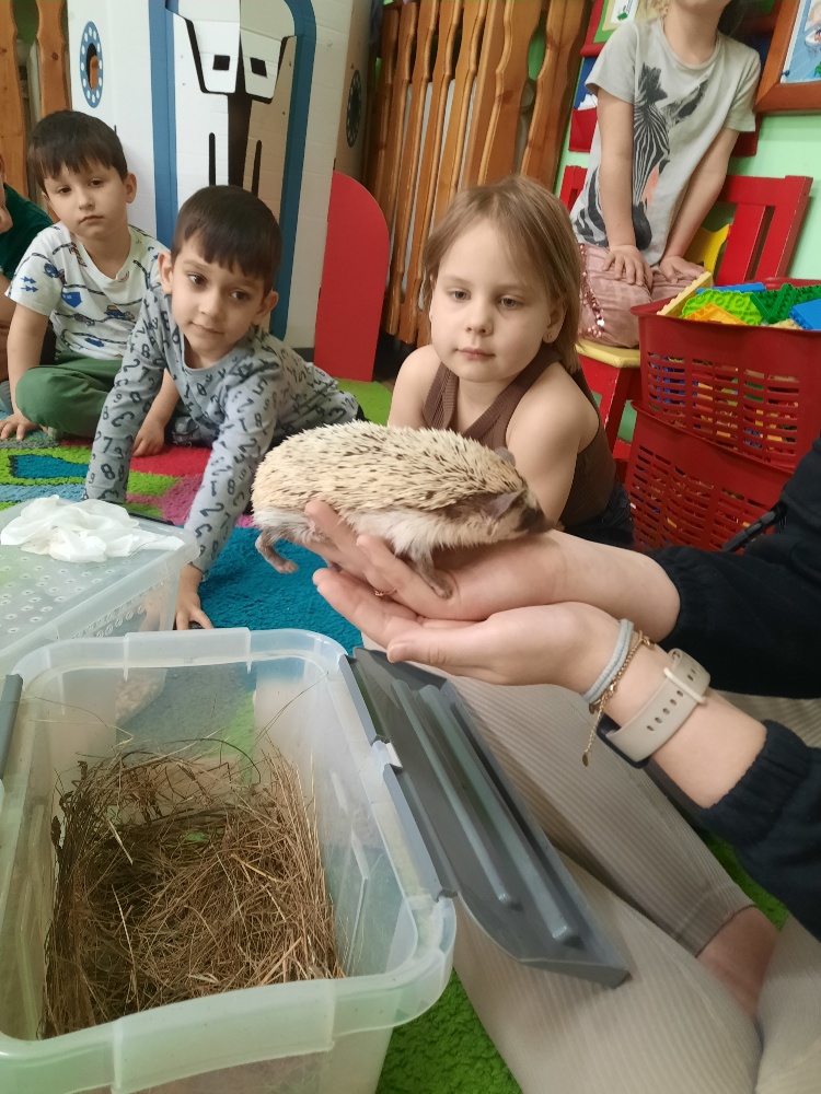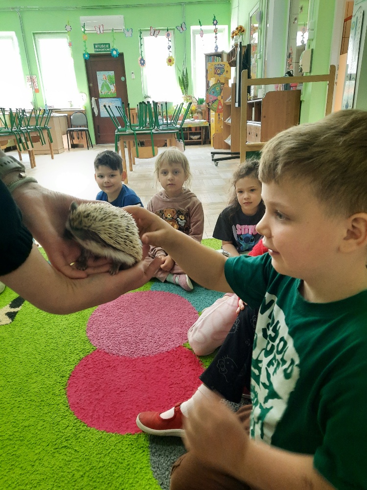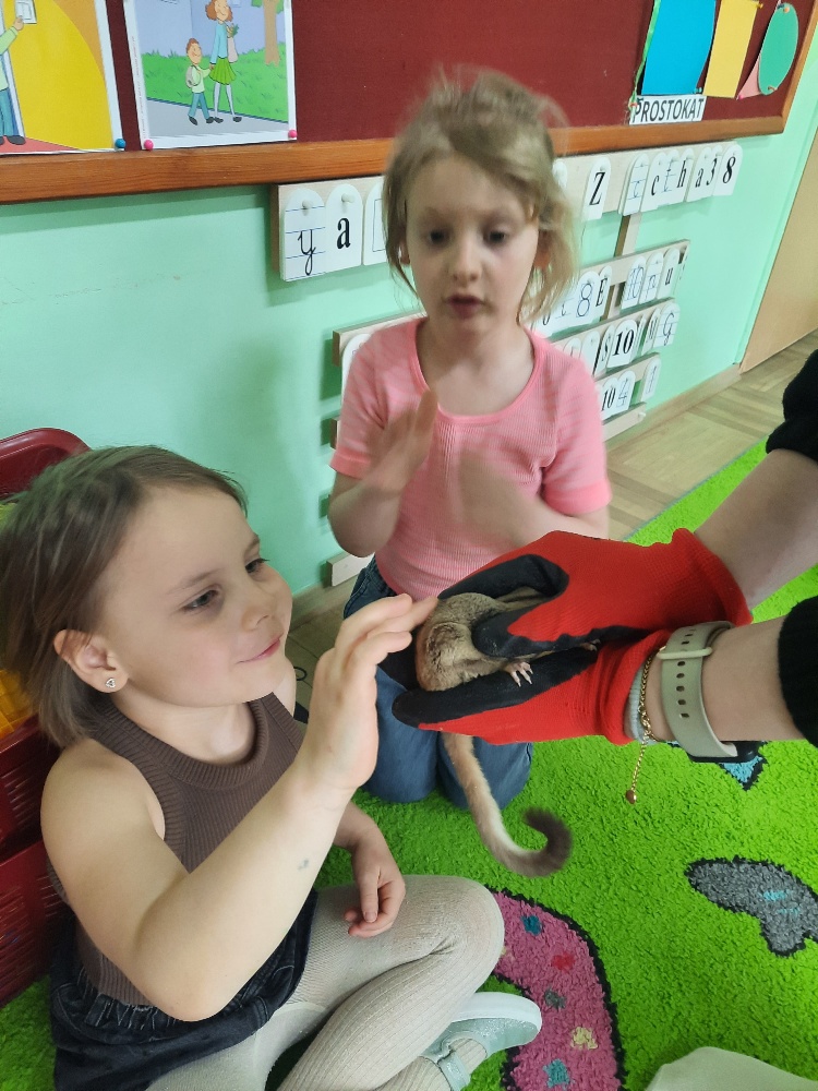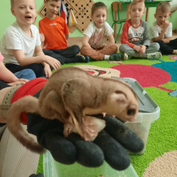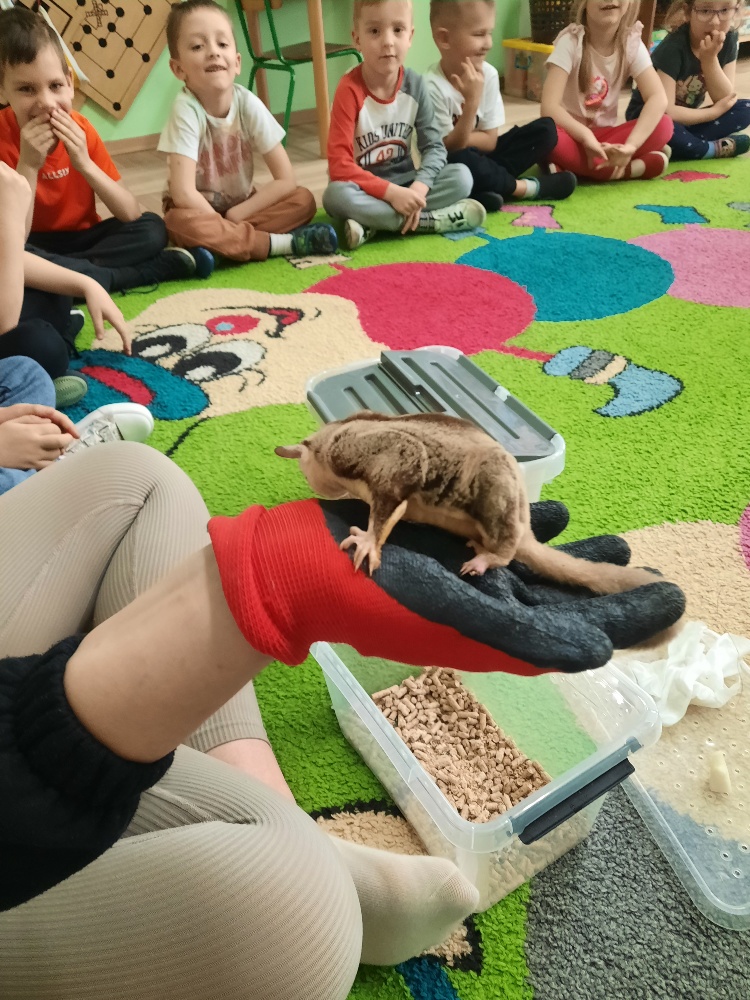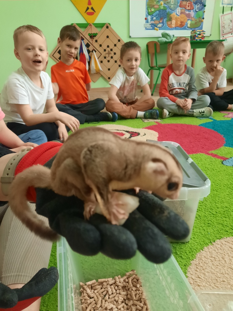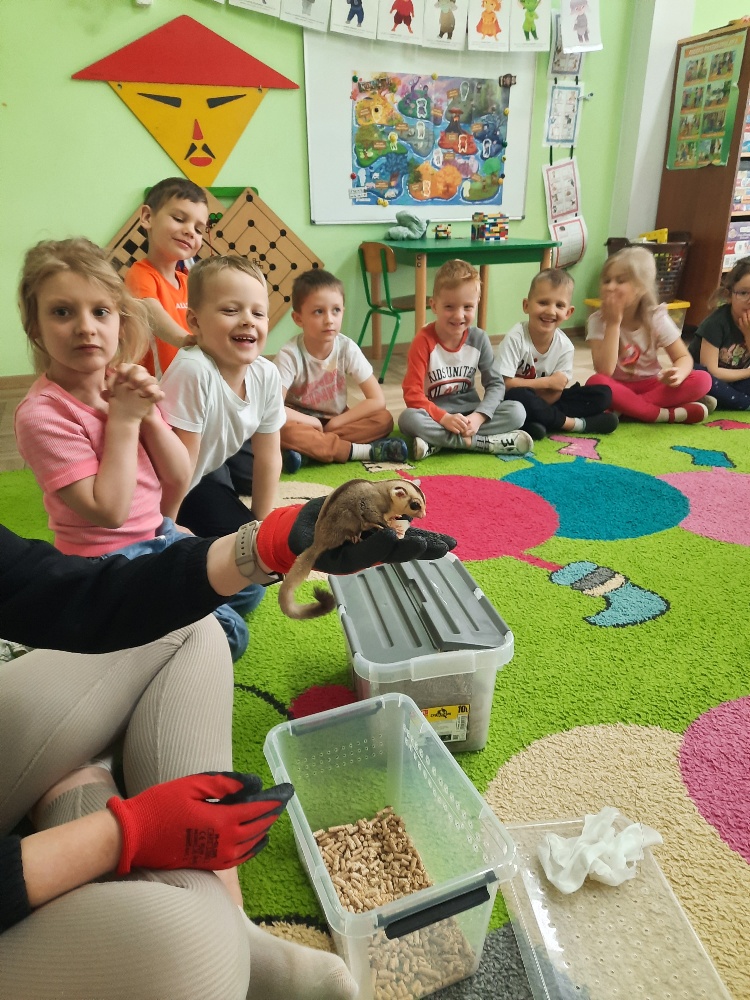 W piątek 24 kwietnia w naszej grupie odbyły się warsztaty przyrodnicze z cyklu „Odlotowe pokazy”. Poznaliśmy Lotopałankę – latającą wiewiórkę i jeża pigmejskiego. Dzieci z zainteresowaniem słuchały ciekawostek na temat środowiska naturalnego tych zwierząt, sposobu ich poruszania się, odżywiania czy wyglądu. Każde dziecko miało możliwość pogłaskania lotopałanki i jeża, co było największą atrakcją spotkania.