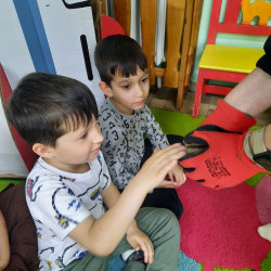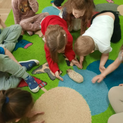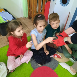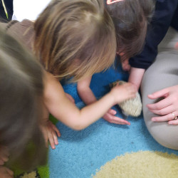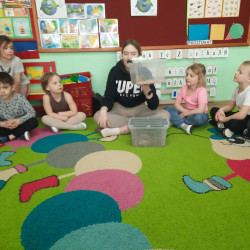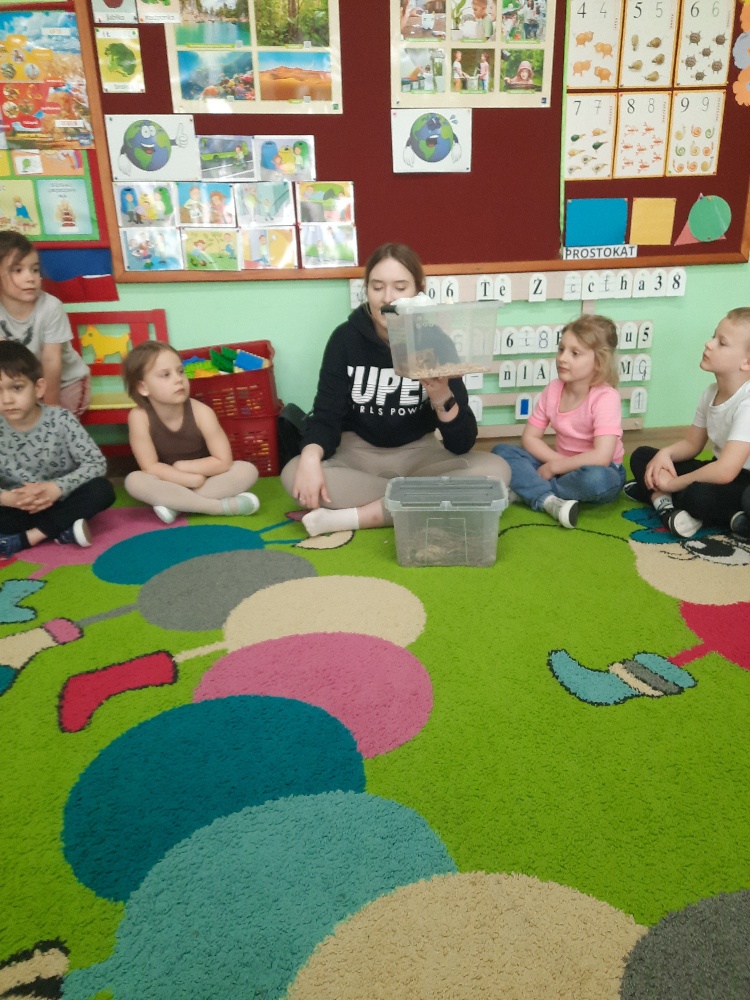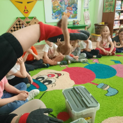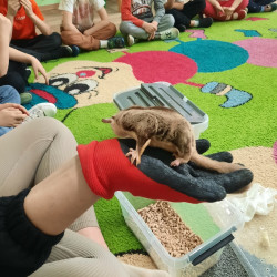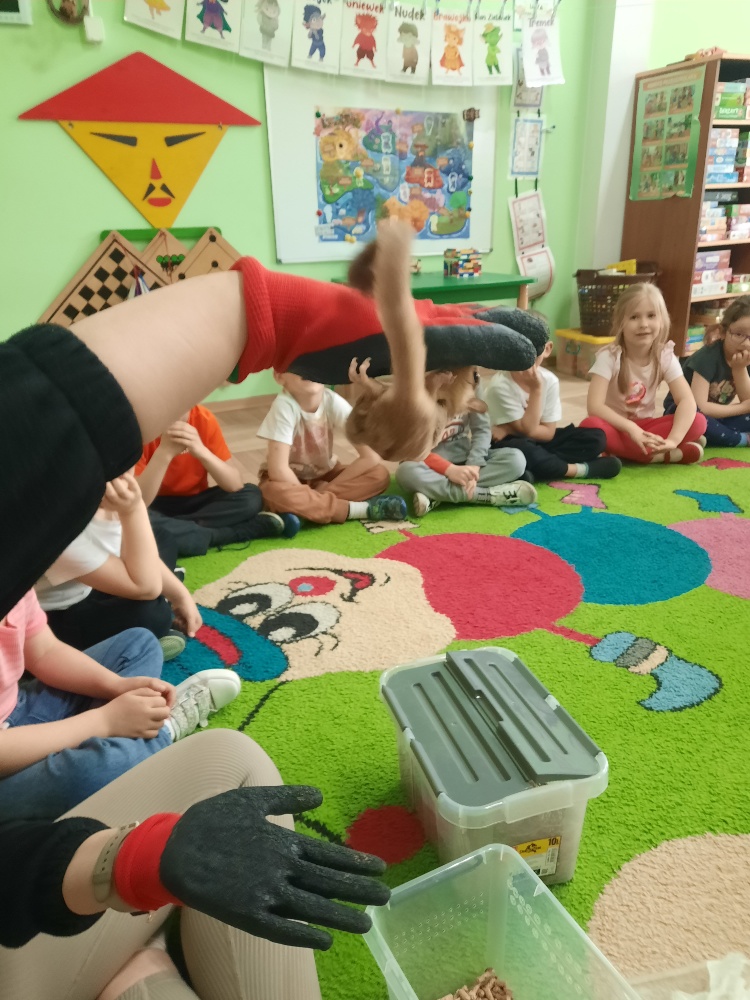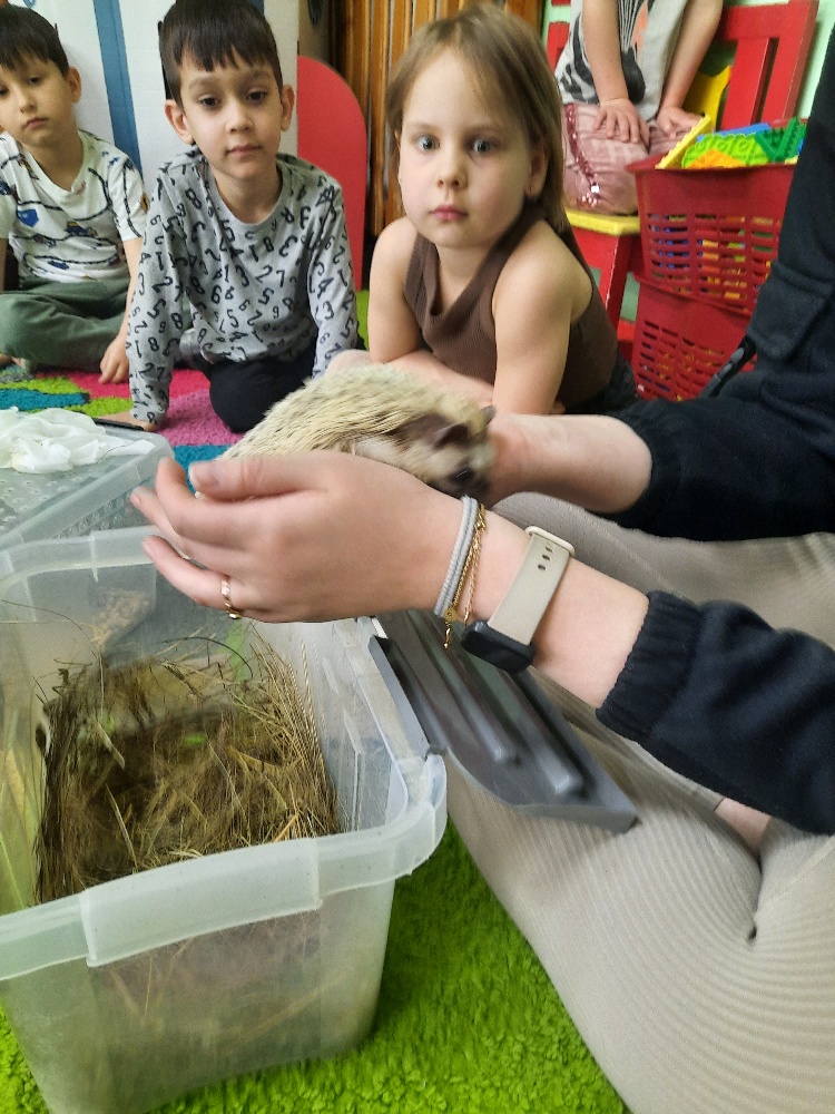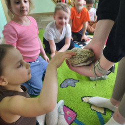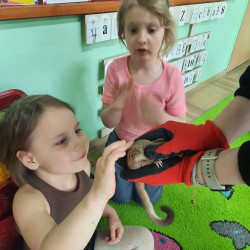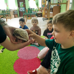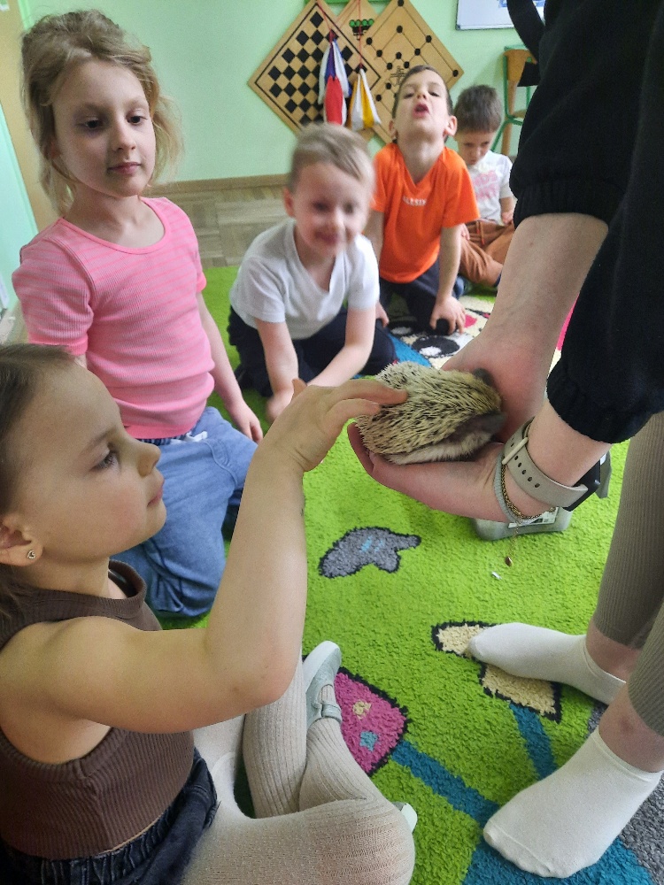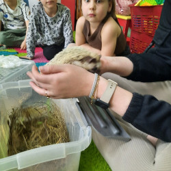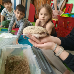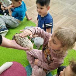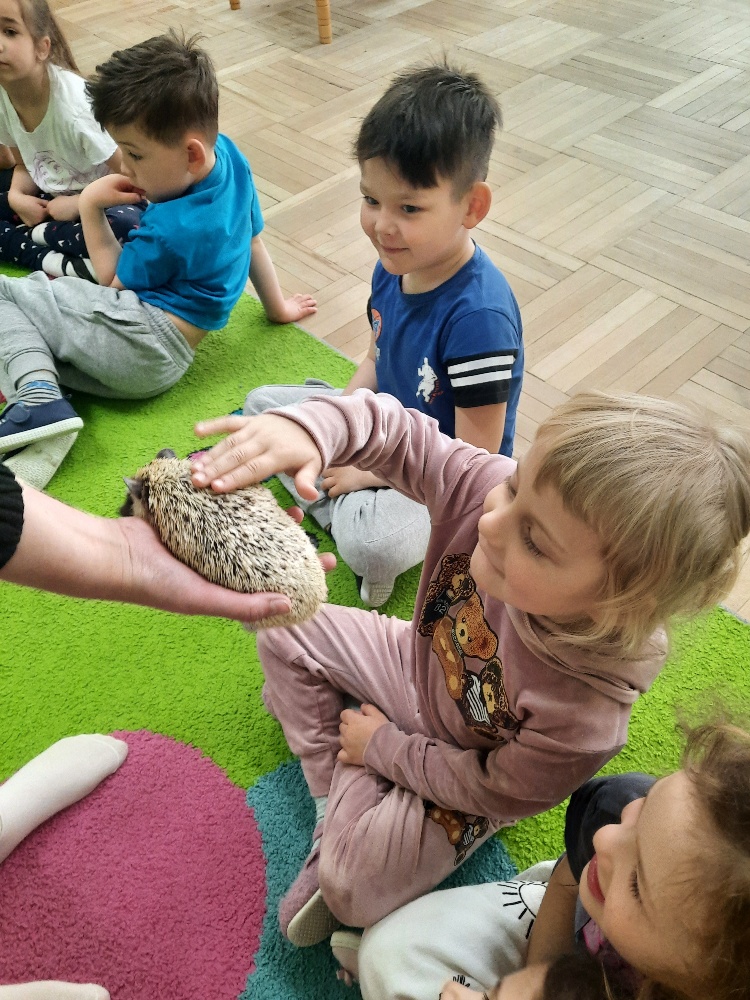 W piątek 24 kwietnia w naszej grupie odbyły się warsztaty przyrodnicze z cyklu „Odlotowe pokazy”. Poznaliśmy Lotopałankę – latającą wiewiórkę i jeża pigmejskiego. Dzieci z zainteresowaniem słuchały ciekawostek na temat środowiska naturalnego tych zwierząt, sposobu ich poruszania się, odżywiania czy wyglądu. Każde dziecko miało możliwość pogłaskania lotopałanki i jeża, co było największą atrakcją spotkania.