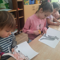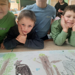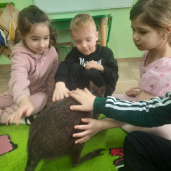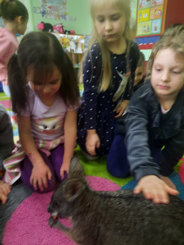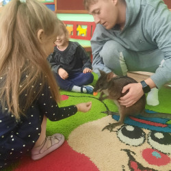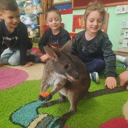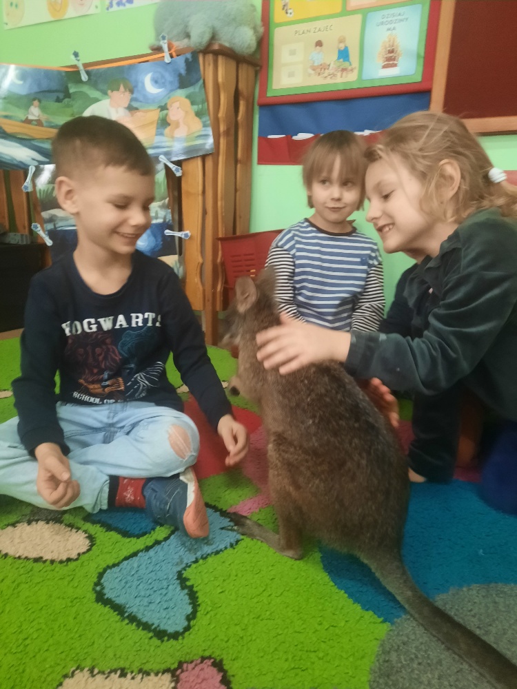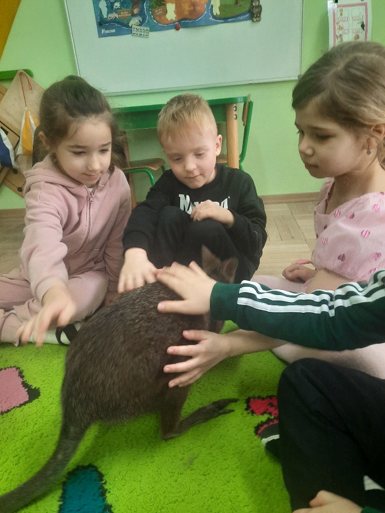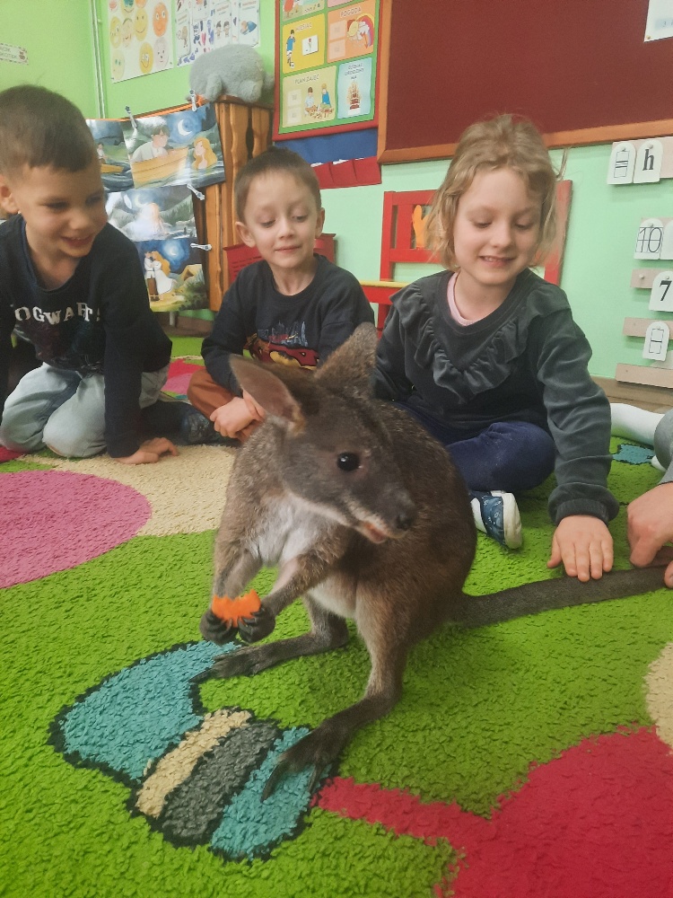 W piątek 20 lutego nasza grupa miała okazję gościć wyjątkowego gościa. Był nim kangur Seba ze swoim opiekunem. Podczas warsztatów Mądre Sowy poznały ciekawostki dotyczące życia kangurów, ich środowiska naturalnego, sposobu odżywiania oraz przystosowania do warunków panujących na kontynencie australijskim. Największym jednak zainteresowaniem cieszyła się możliwość bezpośredniej obserwacji kangura. Dzieci pod czujnym okiem opiekuna miały możliwość dotykania i głaskania kangura Seby. Zajęcia były doskonałą okazją do poszerzenia wiedzy przyrodniczej w atrakcyjnej i angażującej formie. Było to spotkanie edukacyjne, ale przede wszystkim bezpieczne dla dzieci i dla zwierzęcia, pełne pozytywnych emocji. Po wizycie kangura wszystkie dzieci przystąpiły do wspólnego wykonania pracy plastycznej. (kolorowały kangury, wycinały i naklejały na wspólnym arkuszu papieru, dorysowywały elementy charakterystyczne dla środowiska w którym żyją te zwierzęta). Dziękujemy rodzicom za sfinansowanie warsztatów, dzięki którym dzieci mogły przeżyć coś naprawdę wyjątkowego.