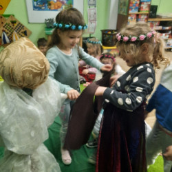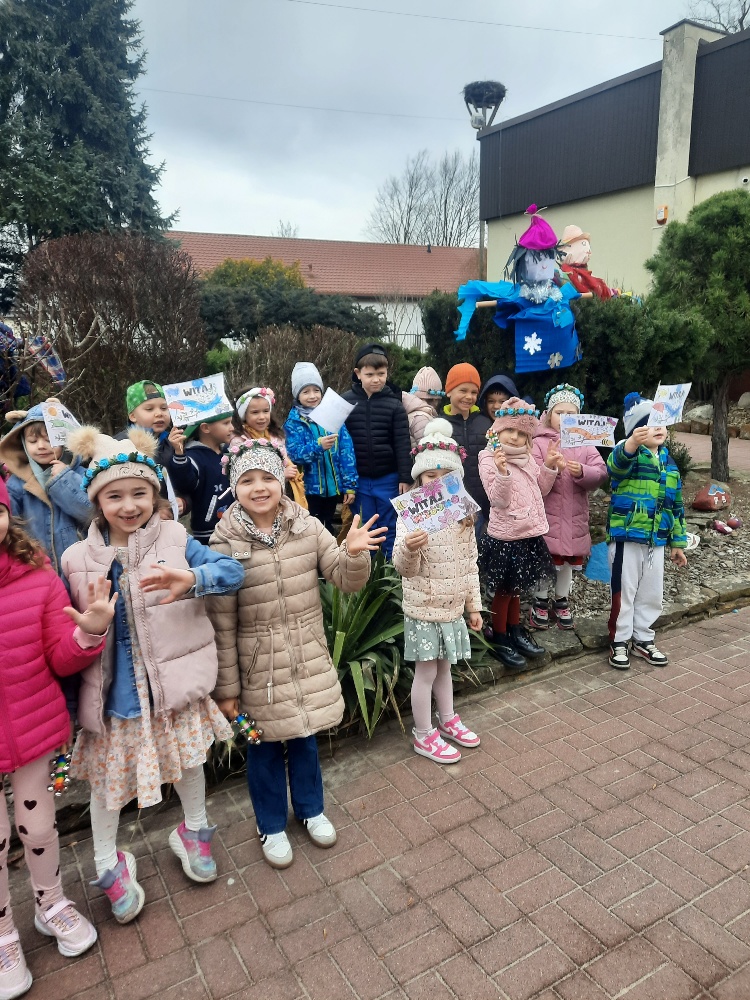 20 marca obchodziliśmy pierwszy dzień astronomicznej wiosny. Jest to bardzo radosne święto. Tego dnia żegnamy zimę i witamy nową porę roku WIOSNĘ. Mądre Sowy już z samego rana z pomocą dorosłych przygotowały zimową kukłę – symbol odchodzącej zimy. Po śniadaniu dziewczynki wystrojone w wianuszki z kolorowych kwiatów, a chłopcy w czapki żabek wzięły udział w wiosennych zabawach. Wysłuchały opowieści o starym zwyczaju topienia kukły – Marzanny. Po zabawach, zagadkach, pracy plastycznej i tańcach przy wiosennych utworach najbardziej oczekiwaną częścią dnia był korowód wokół przedszkola, podczas którego mogliśmy pożegnać zimę wykrzykując hasła: Precz zimo zła. Przedszkolaki z okrzykami radości maszerowały w wiosennym korowodzie z chorągiewkami i instrumentami muzycznymi w towarzystwie Marzanny. W barwnym pochodzie, wróciliśmy na teren przedszkola z nadzieją, że upragniona wiosna na dobre pozostanie z nami. A nasze Marzanny pozostały w ogrodzie i wierzymy w to, że w poniedziałek już ich nie będzie.
