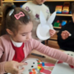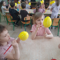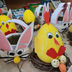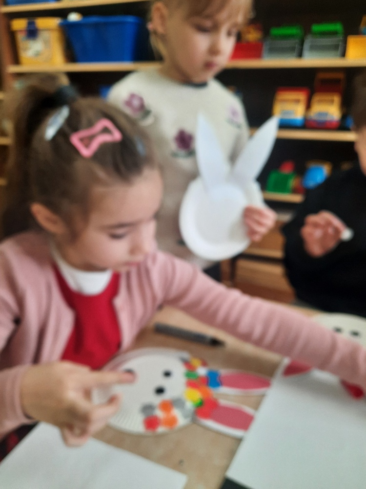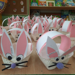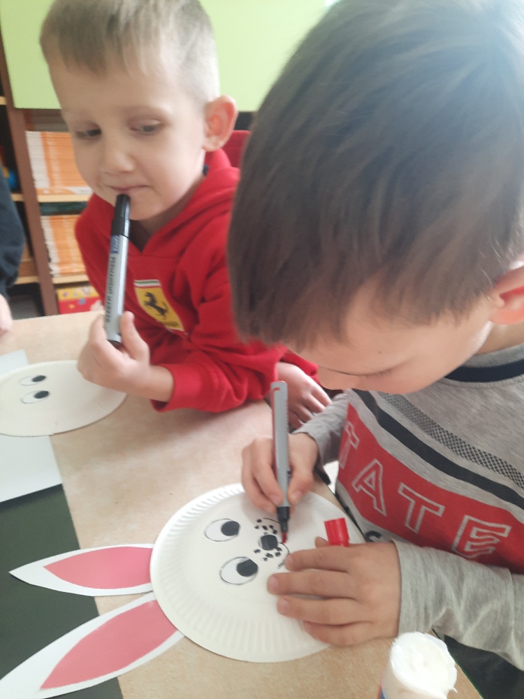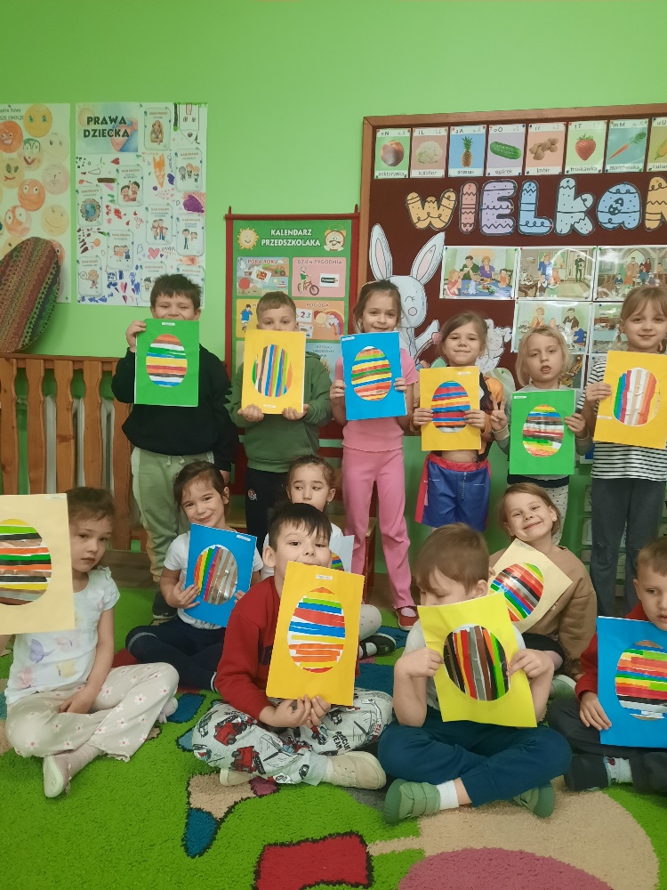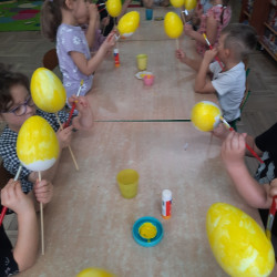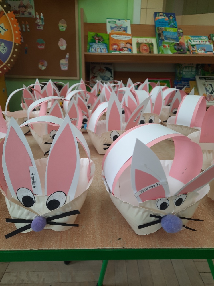 W tygodniu poprzedzającym Wielkanoc przedszkolaki z dużym zaangażowaniem przygotowywały się do Świąt. Poznały polskie zwyczaje i tradycje ludowe związane ze świętami. Przygotowały wiele dekoracji- wyklejały papierowe pisanki, robiły wielkanocne zajączki i kurczaczki, siały rzeżuchę. Składały papierowe koszyczki, piekły babeczki, a w piątek w ramach spaceru wyruszyły na poszukiwanie jajeczek schowanych przez zajączka.
