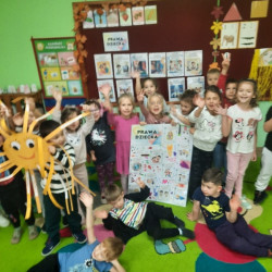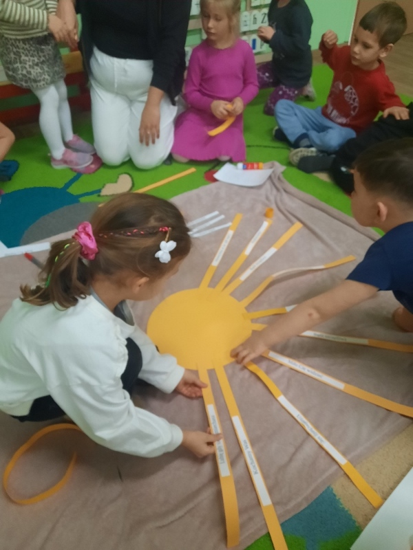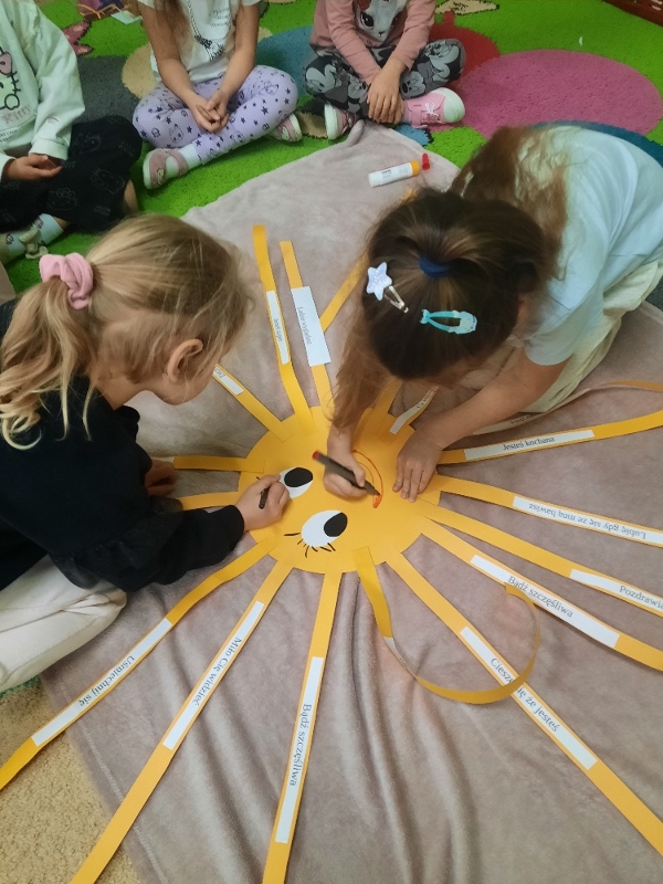 W piątek obchodziliśmy w naszej grupie Dzień Życzliwości. Święto to było okazją aby porozmawiać z dziećmi i przypomnieć im o zasadach dobrego wychowania. Podczas zajęć wysłuchały opowiadania „Dwaj przyjaciele”H. Bechlerowej. Poznały znaczenie powiedzenia „Prawdziwych przyjaciół poznajemy w biedzie”. Mądre Sowy uczyły się też kulturalnego odnoszenia się do rówieśników. Podczas dyskusji opowiadały jak rozumieją życzliwość wobec drugiej osoby, dlaczego warto być miłym oraz jak okazywać życzliwość kolegom, rodzicom oraz osobom starszym. Tego dnia była również okazja przypomnienia dzieciom zasad używania magicznych słów: dzień dobry, do widzenia, proszę, dziękuję, poproszę i przepraszam. Brały udział w zabawie „Serduszko życzliwości” podając skojarzenia do pojęcia „życzliwość”. Propozycje zostały zapisane na karteczka, które dzieci naklejały na promyki słońca. Potem każdy promyk został doklejony do słońca. W ten sposób powstało uśmiechnięte „Słońce życzliwości”. Wspólne radosne zabawy przy piosenkach oraz w zabawach dowolnych zachęcały dzieci do pozytywnych zachowań. W tym dniu każdy starał się być miły i serdeczny. Mamy nadzieje, że te dobre zachowania pozostaną w naszej grupie na dłużej.