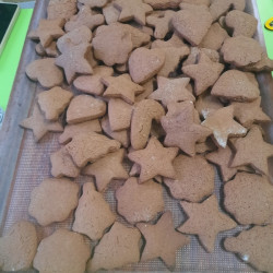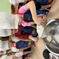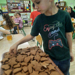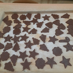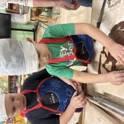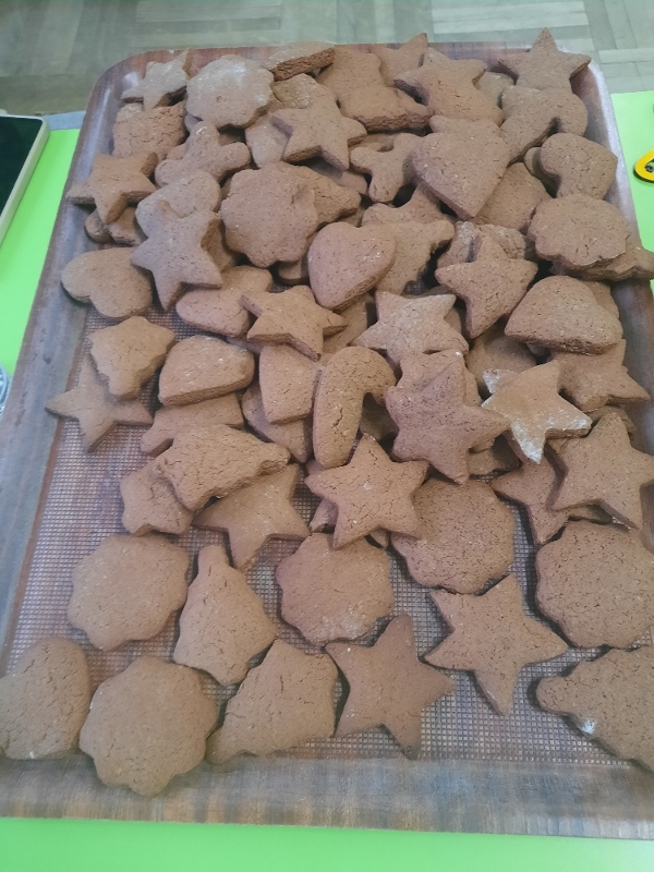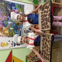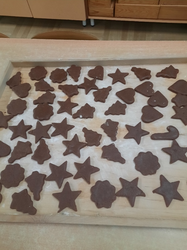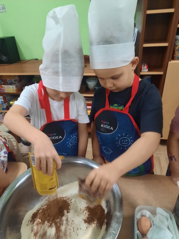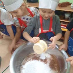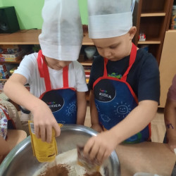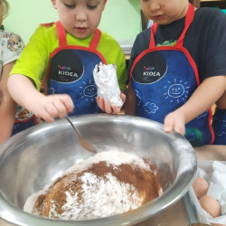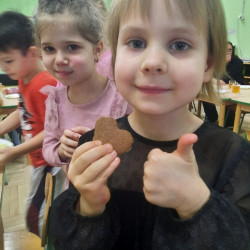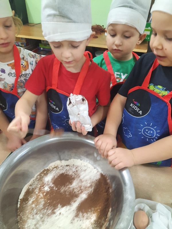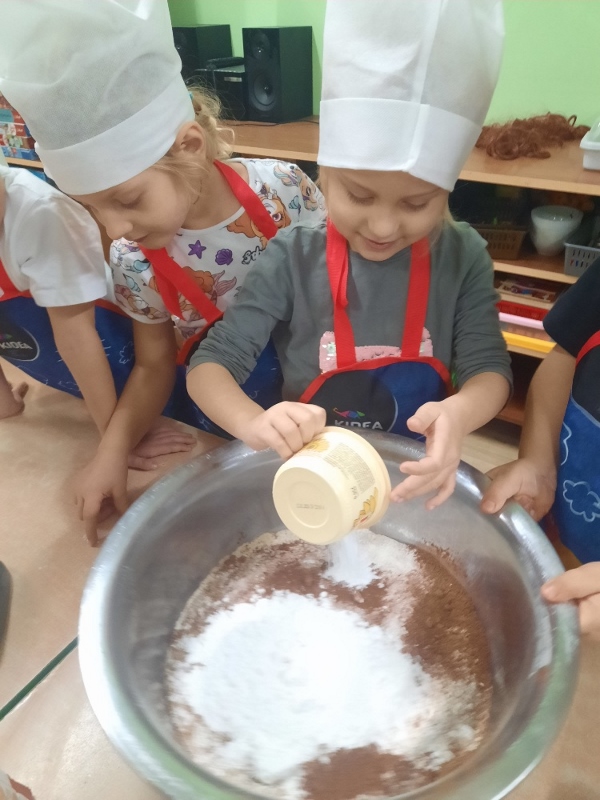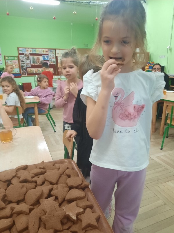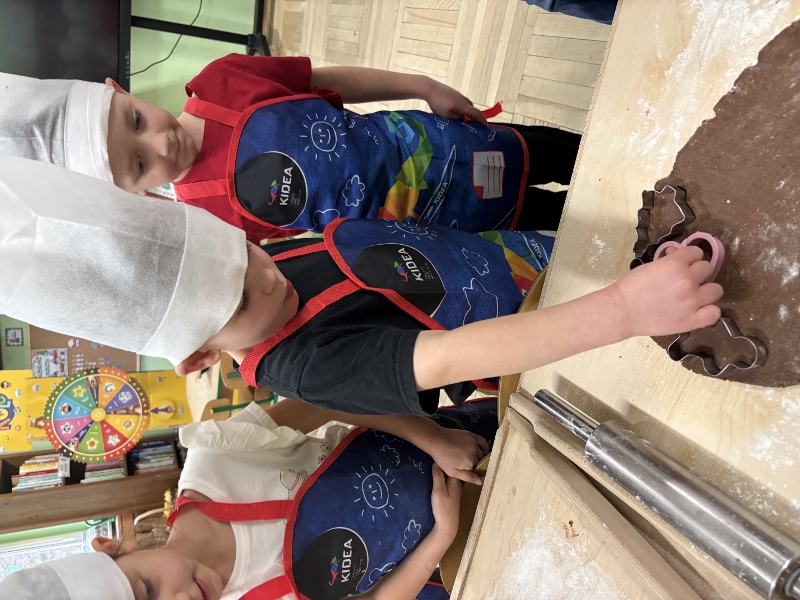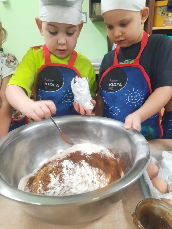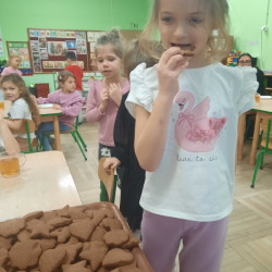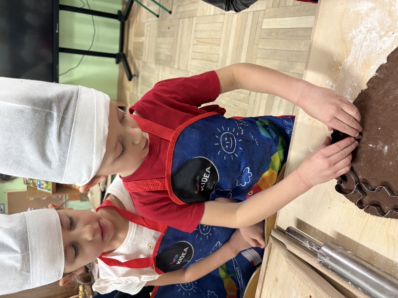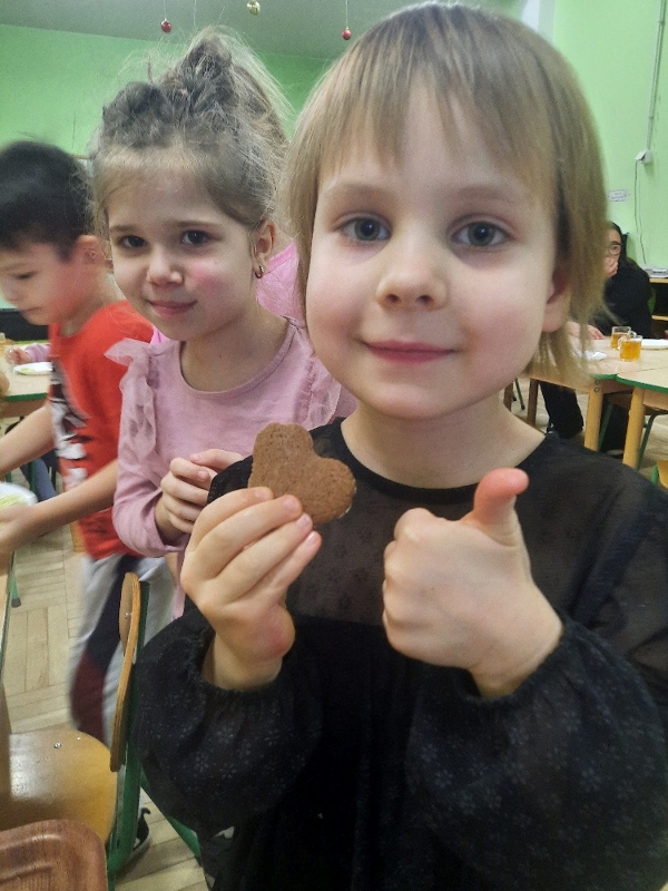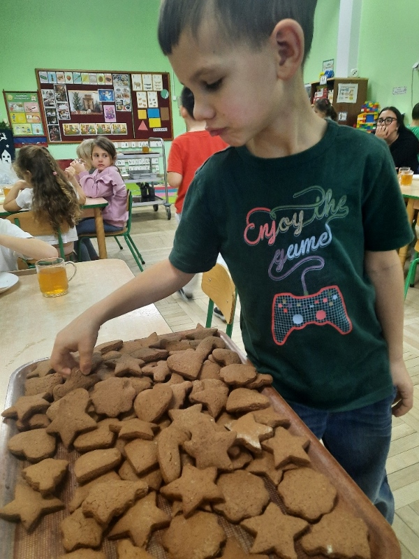 W poniedziałek 15 grudnia w naszym przedszkolu za sprawą dzieci z grupy Mądre Sowy, które w ten wyjątkowy, przedświąteczny czas, postanowiły upiec pierniki unosił się wspaniały, świąteczny, korzenny zapach pierników. Najpierw dzieci poznały składniki i sposób wykonania ciasta. Dowiedziały się, że sekretem pysznych pierników jest miód i przyprawy korzenne. Po dokładnym umyciu rąk, założeniu fartuszków i czapek Master Chefa przedszkolaki ochoczo zabrały się do pracy. Połączyły wszystkie produkty zgodnie z przepisem. Z przygotowanego ciasta, wykrawały różne kształty pierników wykorzystując foremki w kształcie serca, choinki, gwiazdki, bałwanka, renifera. Pierniczki zostały upieczone , a następnego dnia każde dziecko mogło je udekorować według uznania. Każdy mógł skosztować tych magicznych, kolorowych pierników. Pozostałe pierniczki zostały zapakowane w torebki i dołączone do świątecznych stroików przygotowanych dla rodziców.