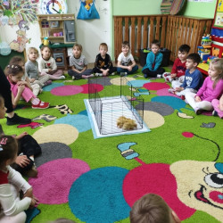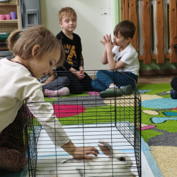 Do grupy „Mądre Sowy" zawitały wyjątkowe warsztaty ze zwierzątkami, które wzbudziły ogromne zainteresowanie i radość wśród dzieci. Największą gwiazdą spotkania okazała się szynszyla, która zachwyciła wszystkich swoim niezwykle miękkim i przyjemnym w dotyku futerkiem.
