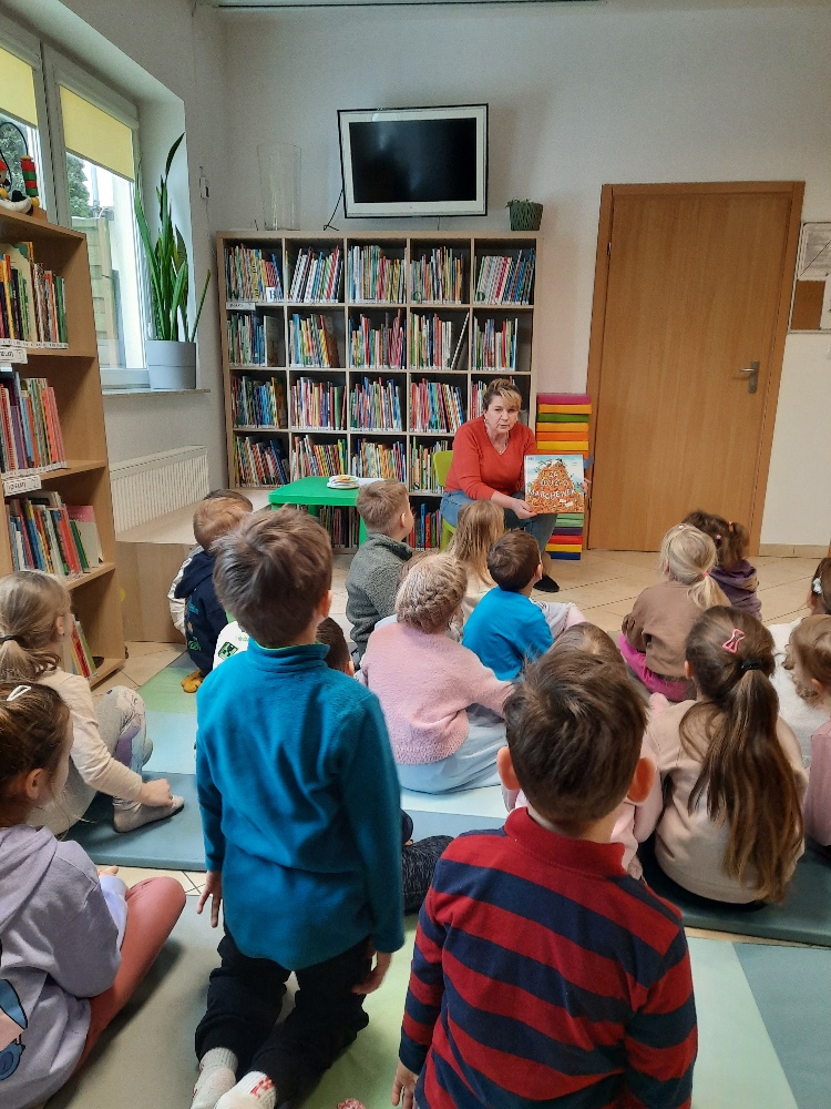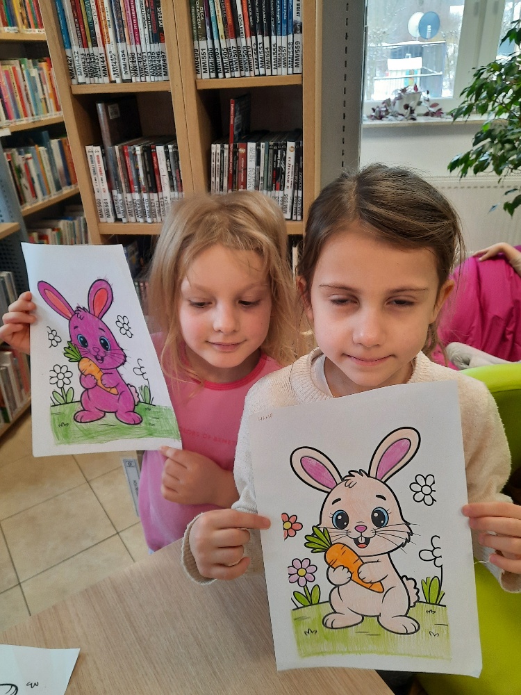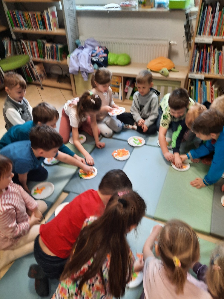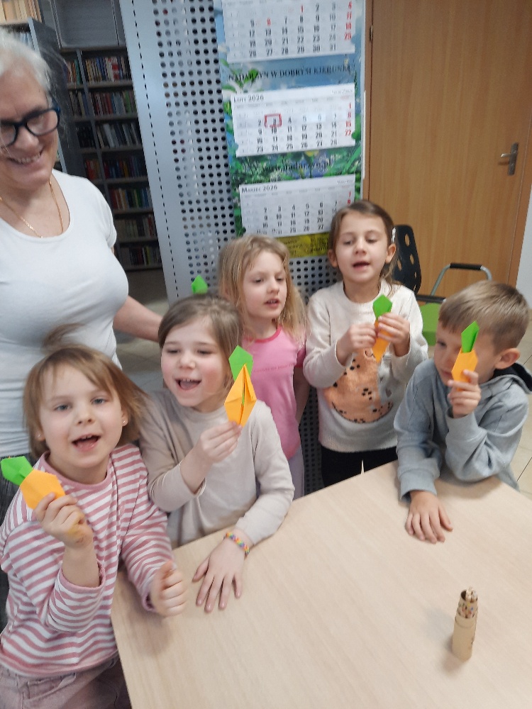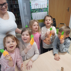 W środę 04.02.26 przedszkolaki wybrały się do biblioteki na zajęcia z okazji nietypowego dnia „Dnia ciasta marchewkowego”. Dzień ten rozpoczęliśmy od wysłuchania opowieści o Króliku z książki Katy Hudson „Za dużo marchewek”. Dowiadujemy się z niej., że króliczek zgromadził w swoim domku za dużo marchewek, więc postanawia poszukać dla swojego przysmaku nowego miejsca. Przyjaciele użyczali mu swoich domków, które za każdym razem ulegały zniszczeniu wobec nadmiaru słodkiego pomarańczowego warzywa. Królik zrozumiał, że rozwiązaniem jego dużego problemu jest podzielenie się marchewkami z innymi. Książka była inspiracją do rozmów na temat zdrowego odżywiania, a także do twórczych aktywności plastycznych. Uczestnicy zajęć wspólnie z panią Basią wykonali marchewki metodą origami, kolorowali postać króliczka i próbowali pysznych marchewkowych ciasteczek z ziarnami. Dzieci wróciły do przedszkola z uśmiechami na twarzy. Zajęcia były jak zwykle pouczające. Tego dnia nauczyliśmy się że przyjaźń i dzielenie się z innymi są ważniejsze niż gromadzenie dóbr.