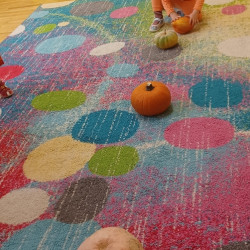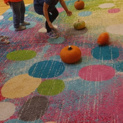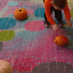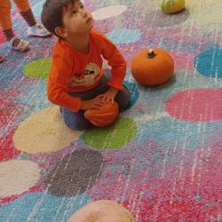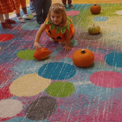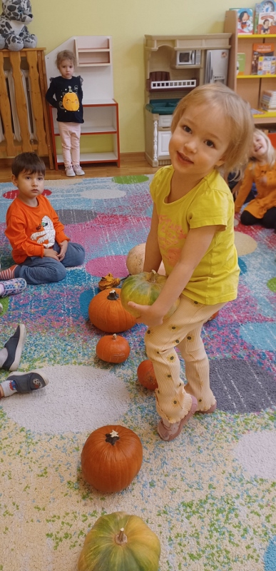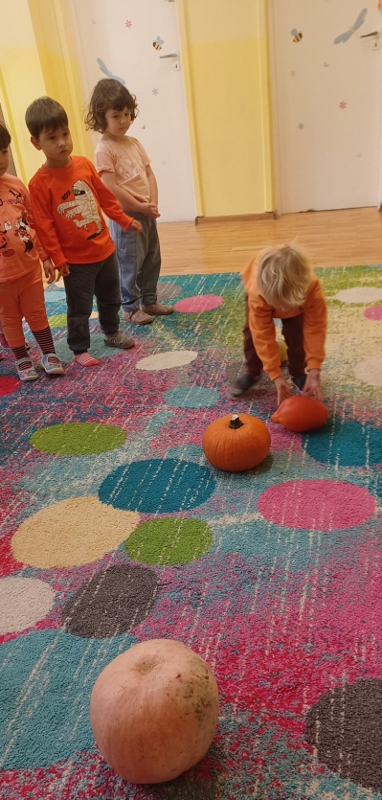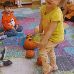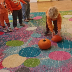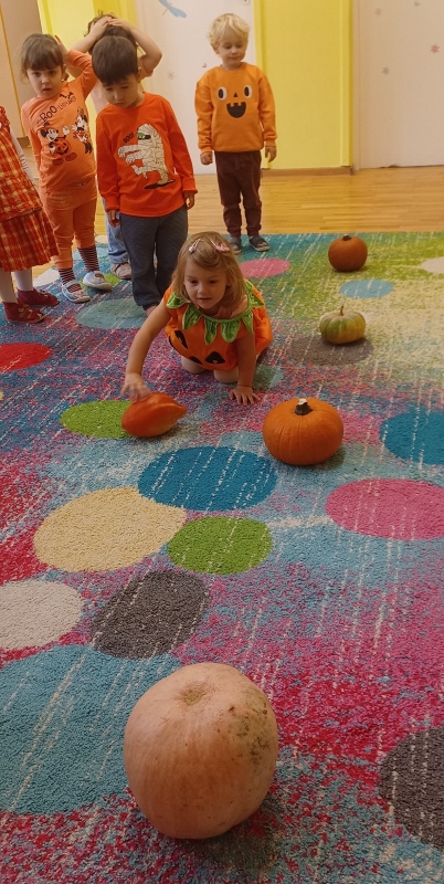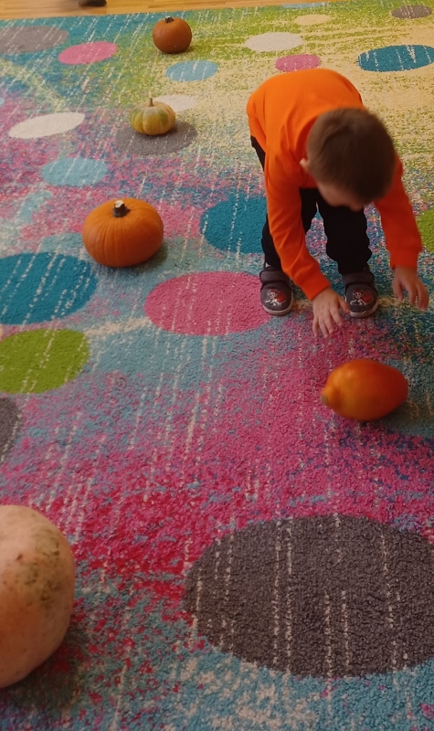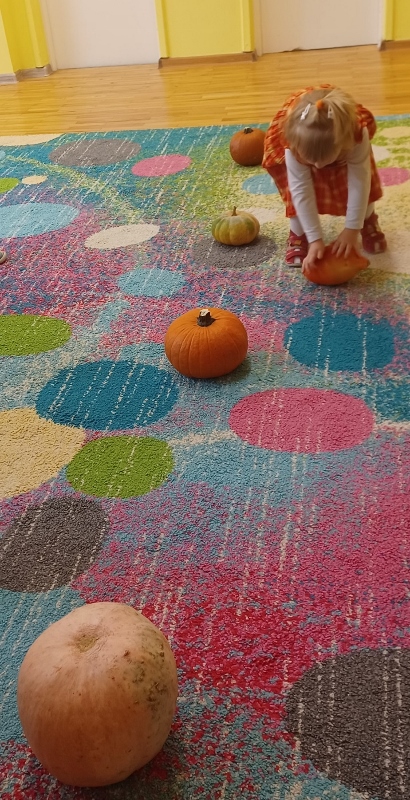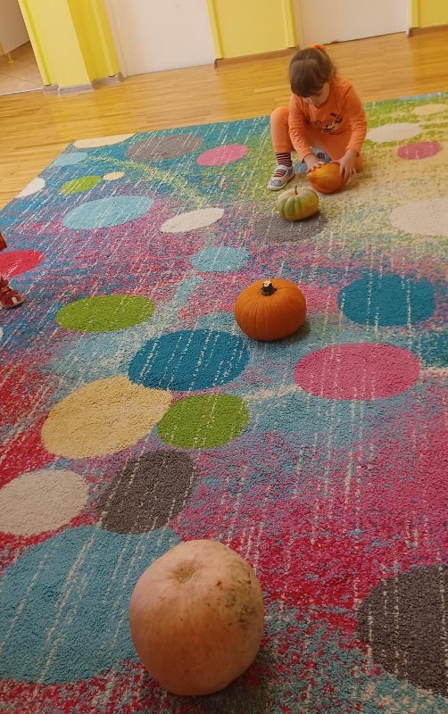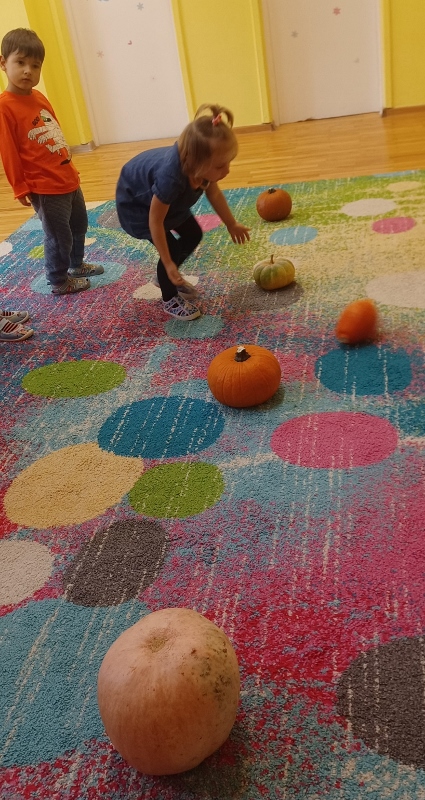 Nie zabrakło też dyniowych zabaw ruchowych – Pszczółki z uśmiechem na twarzy toczyły dynie po torze slalomowym, układały je od najmniejszej do największej i sprawdzały, która jest najcięższa, a która najlżejsza.
