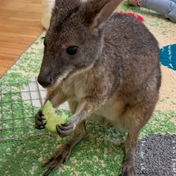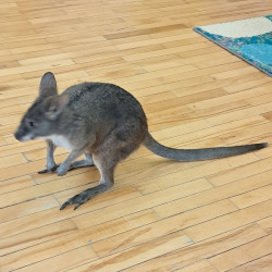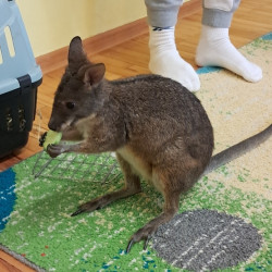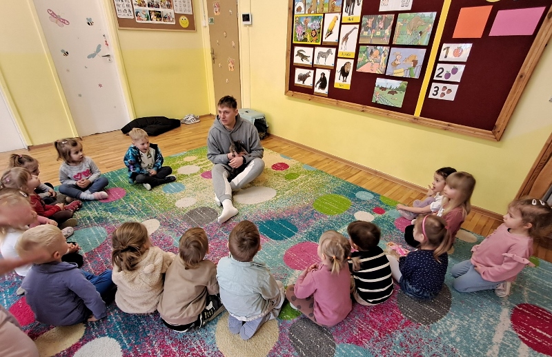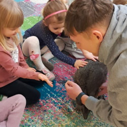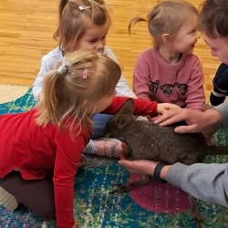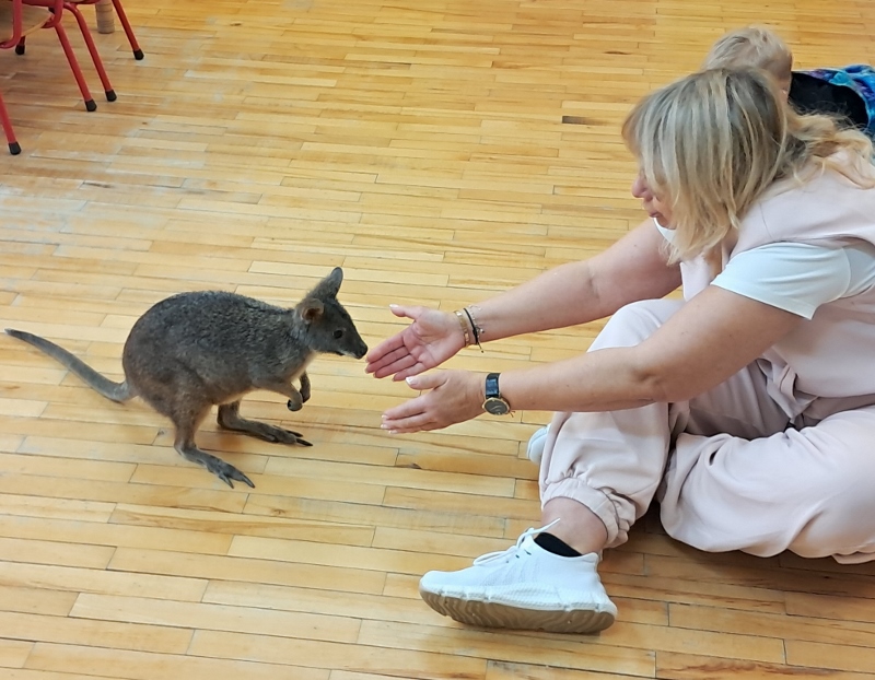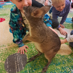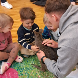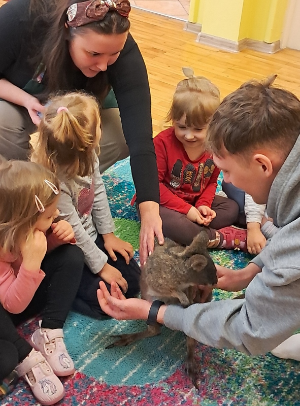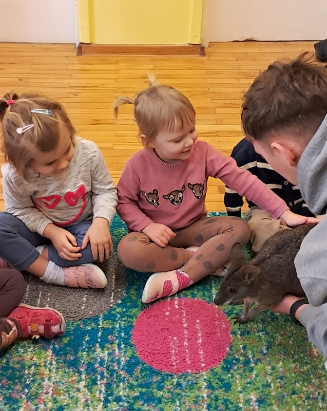 20 lutego w naszym przedszkolu pojawili się wyjątkowi goście - prawdziwy miniaturowy kangur z opiekunem. Wizyta tego przesympatycznego zwierzątka w naszej grupie to dla dzieci fascynująca, żywa lekcja przyrody. Przedszkolaki mogły z bliska zobaczyć egzotyczne zwierzę, poznać ciekawostki o jego diecie (np. lubi banany, marchewkę i ogórki u nas schrupał ogóreczka z wielkim apetytem, ogólnie żywi się owocami, warzywami i owadami) oraz zachowaniu (prowadzi nocny tryb życia),warunkach życia, skąd pochodzi, jakie ma przyzwyczajenia w naturalnym środowisku. Przedszkolaki mogły także pogłaskać go pod nadzorem opiekuna.